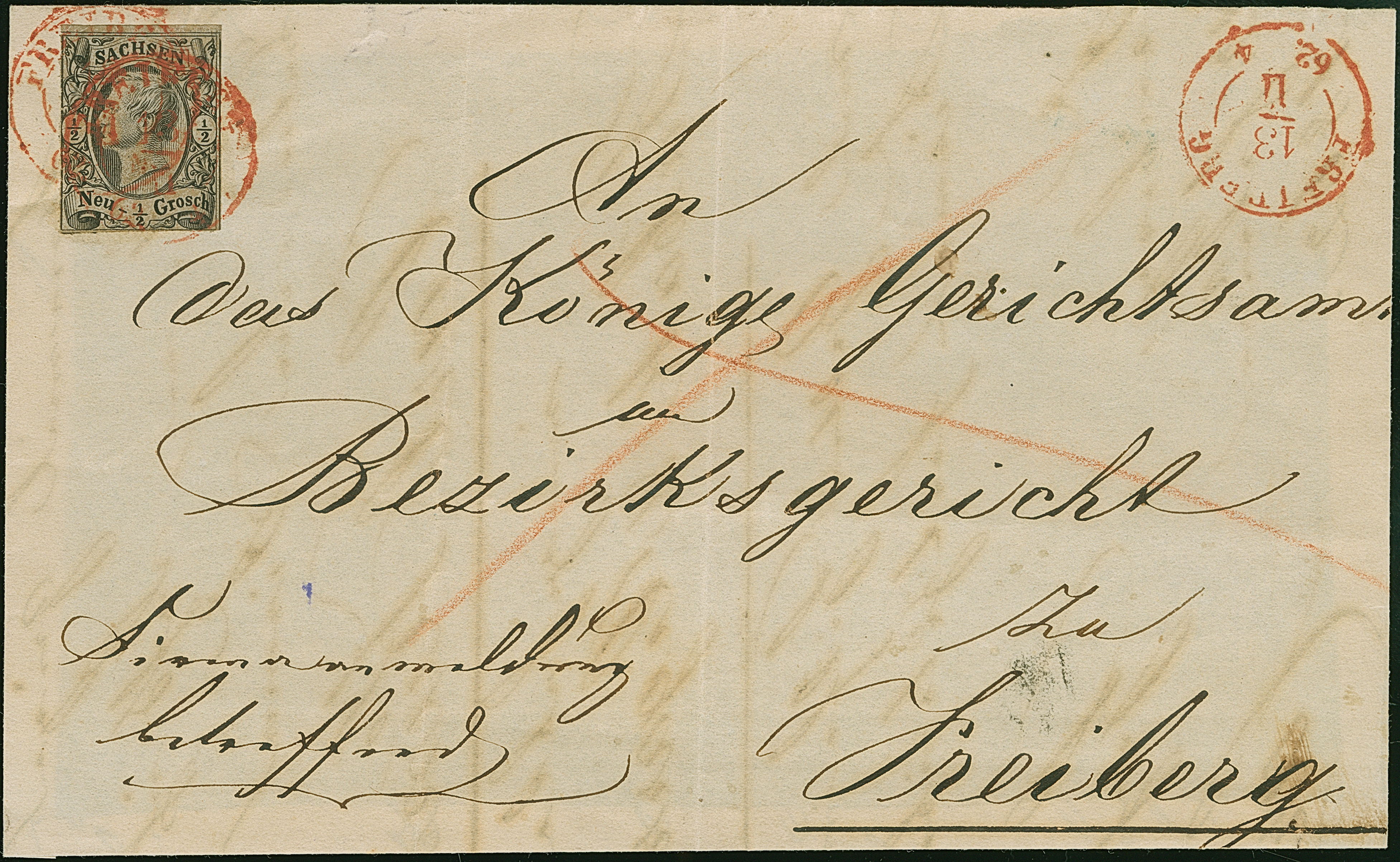 ½ Ngr. auf grau, teils berührt, mit doppelt auf- und zusätzlich sauber nebengesetztem roten Doppelkreisstempel "FREIBERG 13/II 62" auf Ortsbrief-Vorderseite. Eine sehr seltene farbige Entwertung; nur 4 Briefe registriert.