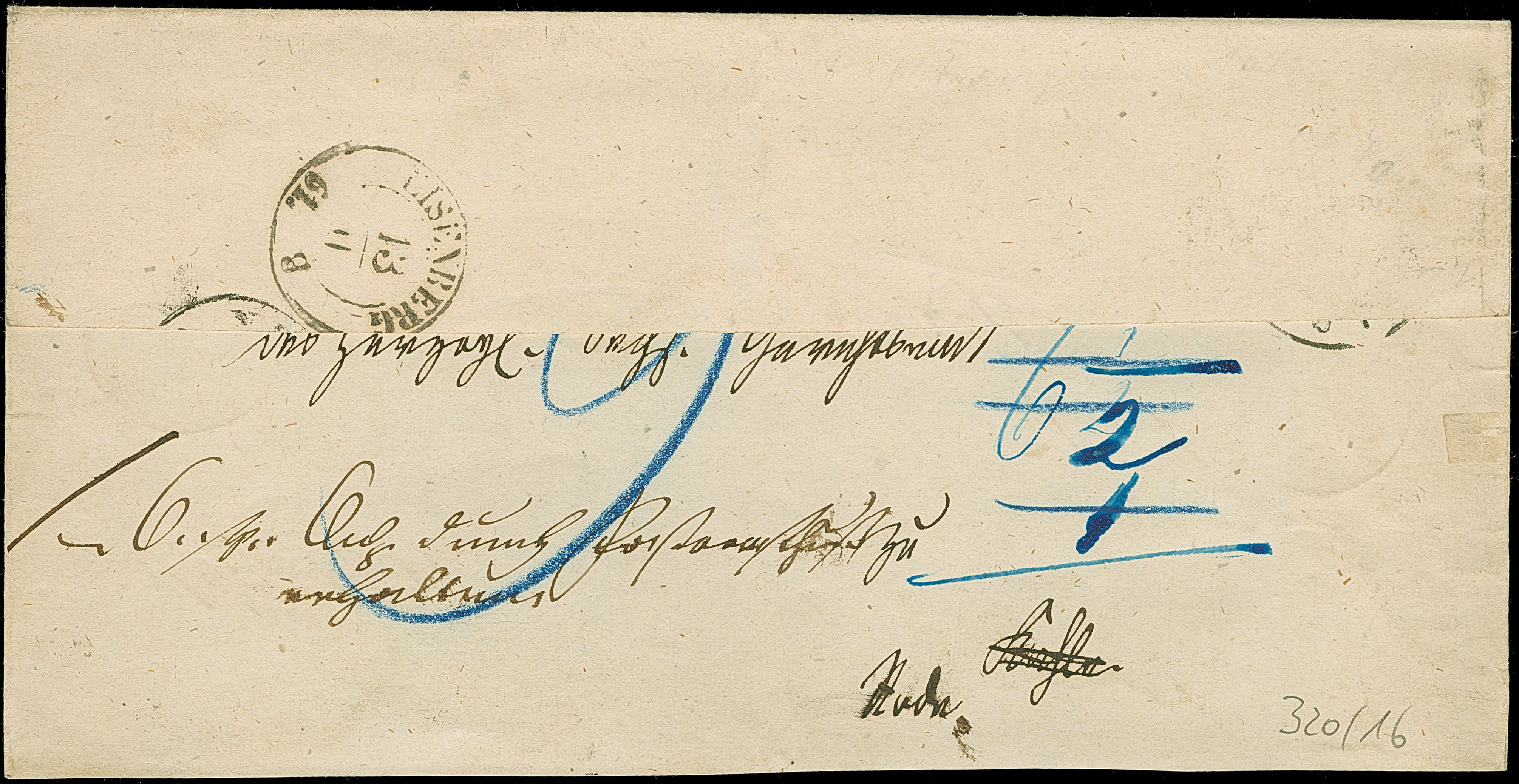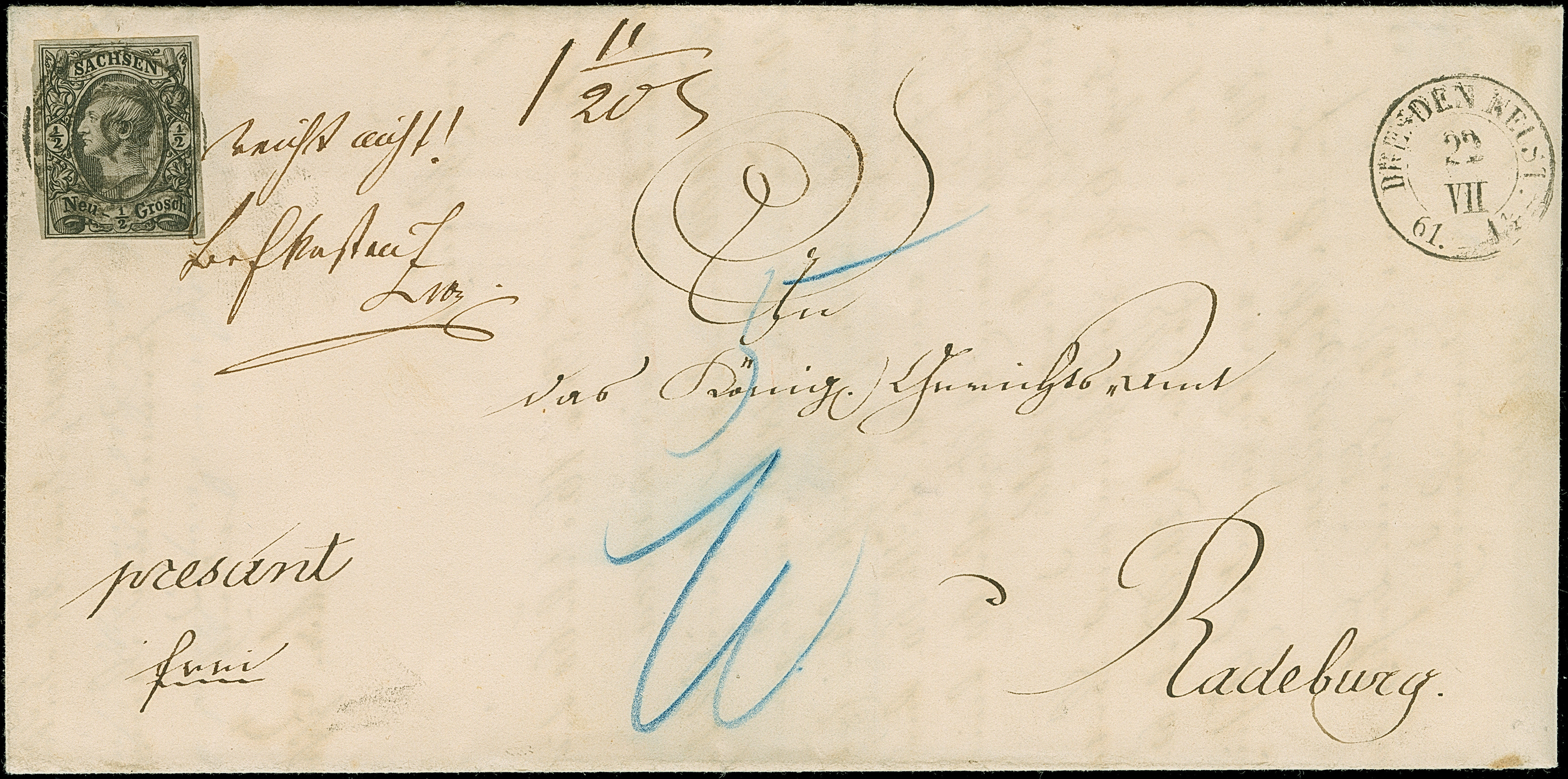 ½ Ngr. auf grau, voll- bis breitrandig, mit Nr. "3" und nebengesetztem Doppelkreisstempel "DRESDEN NEUST. 22 VII 61" auf Briefhülle nach Radeburg. Der Brief fiel in die 2.Gewichtsstufe, handschriftlich "reicht nicht! Briefkasten"und nachtaxiert mit blauem "5 10".