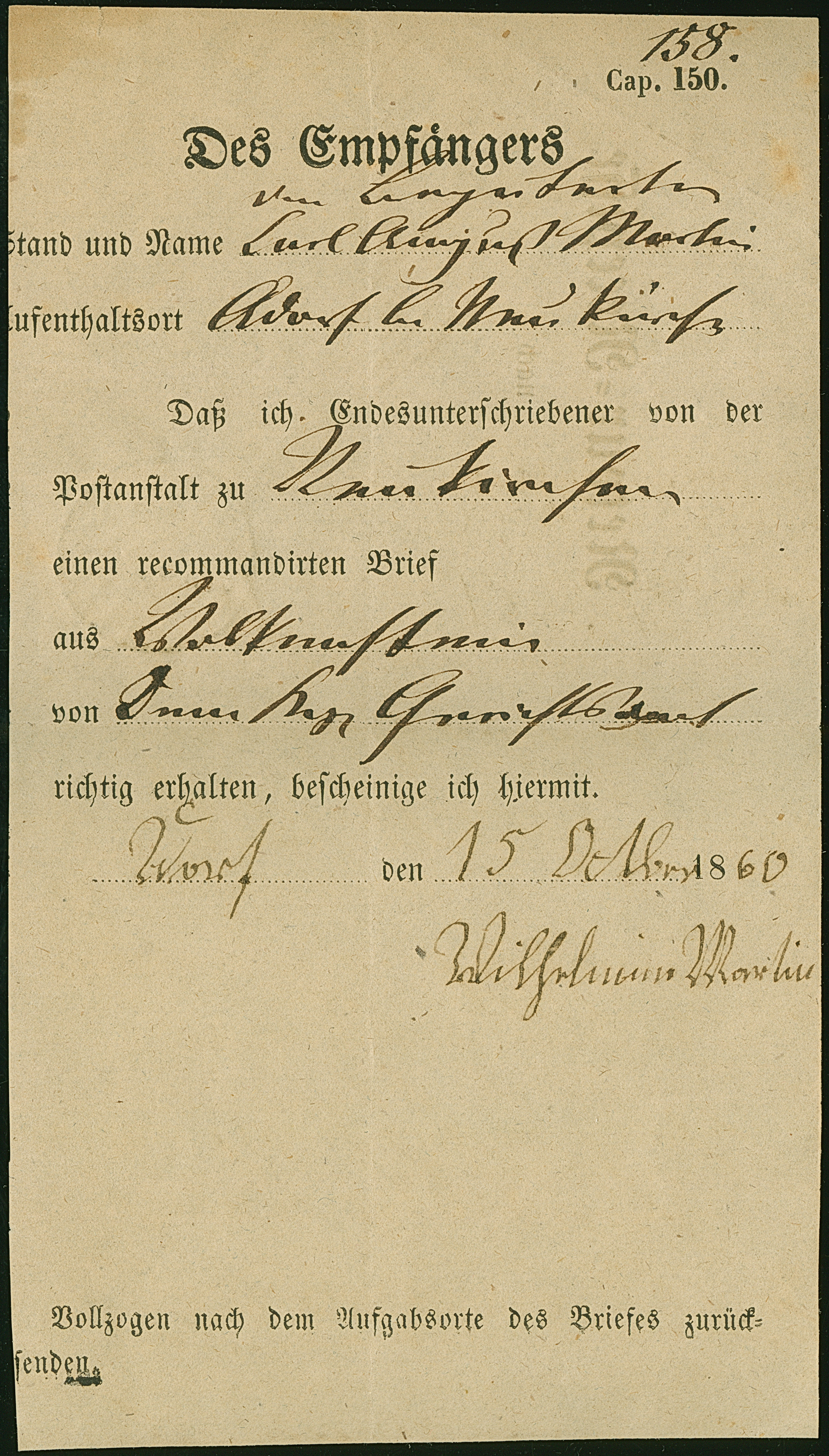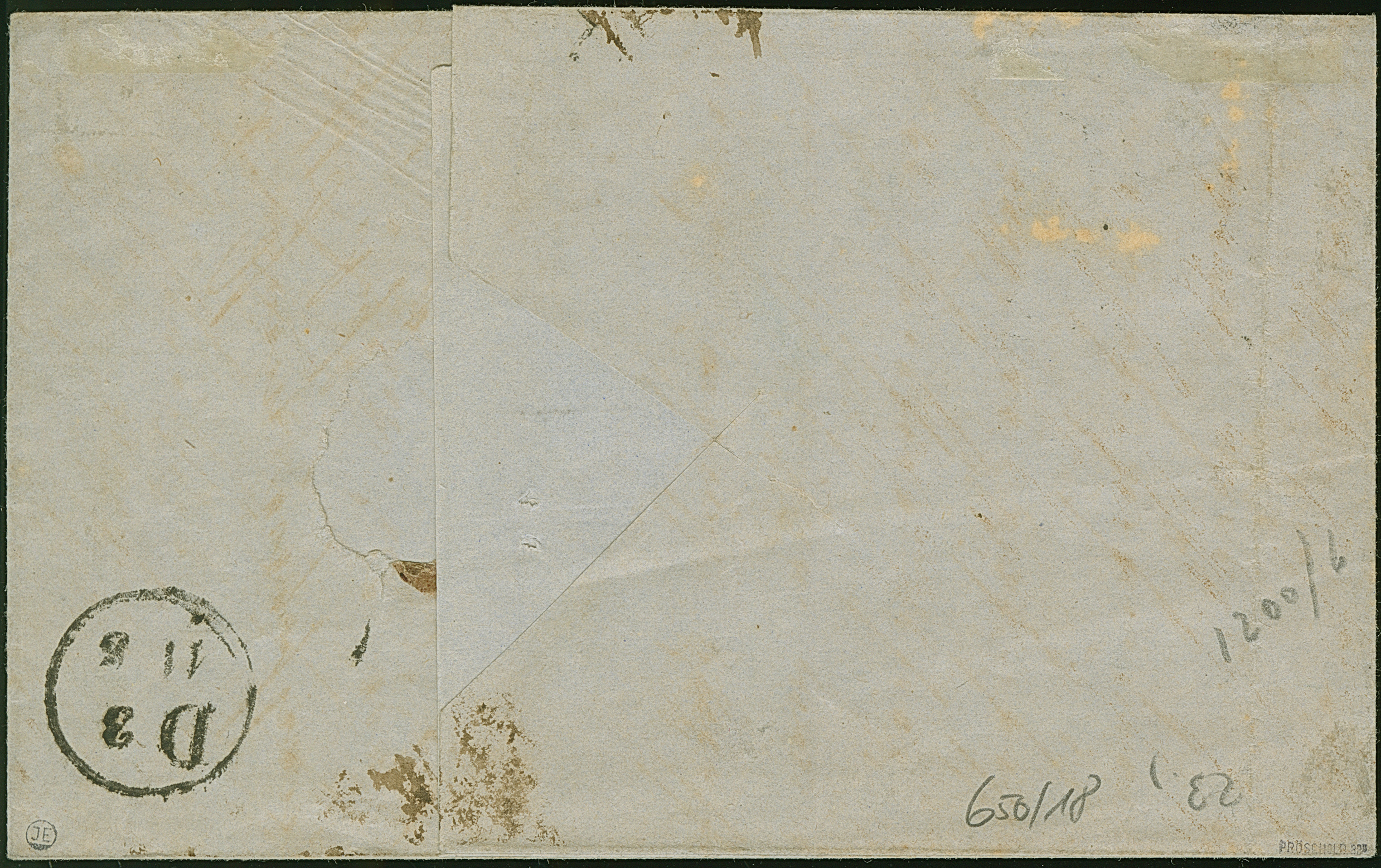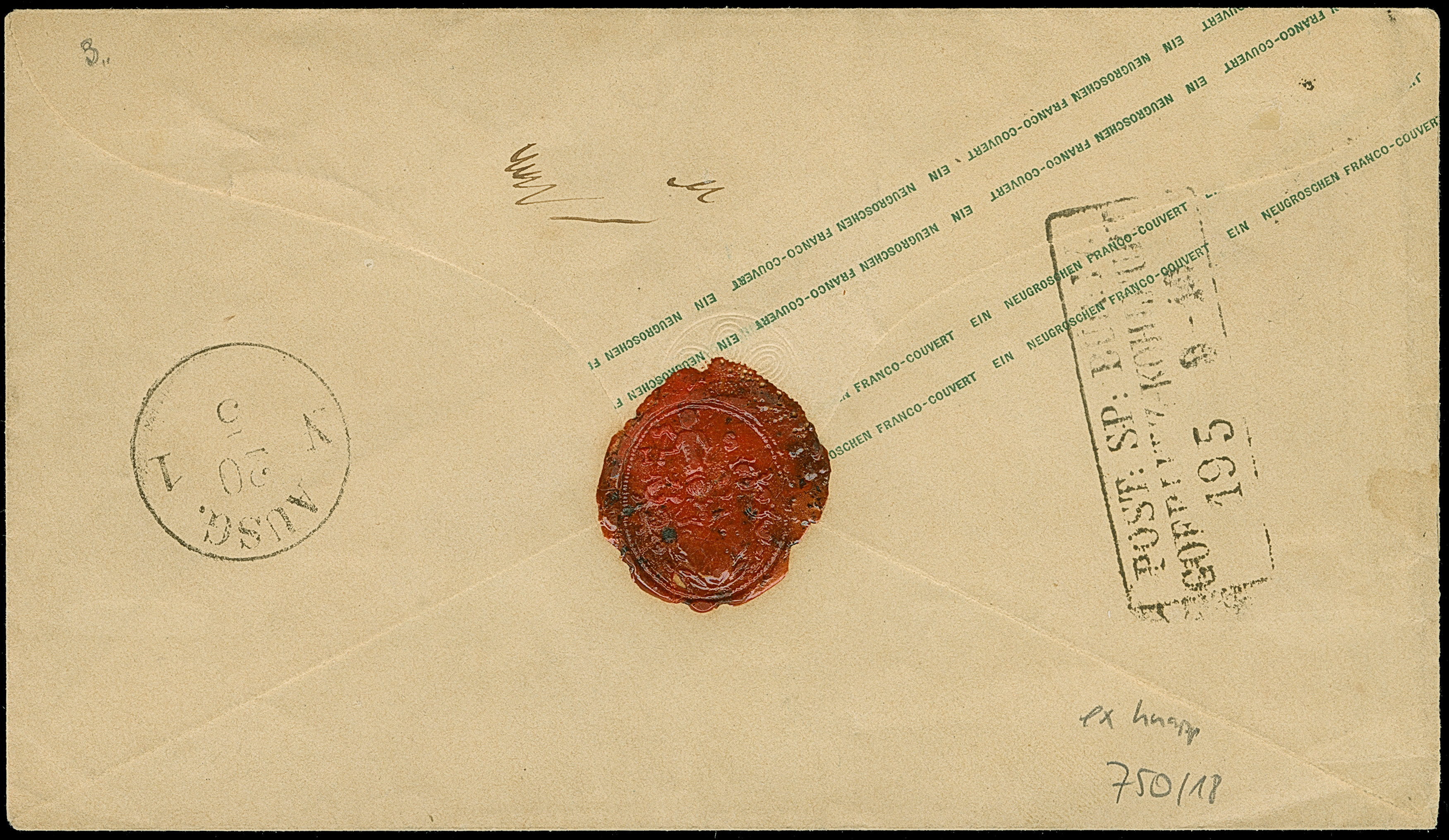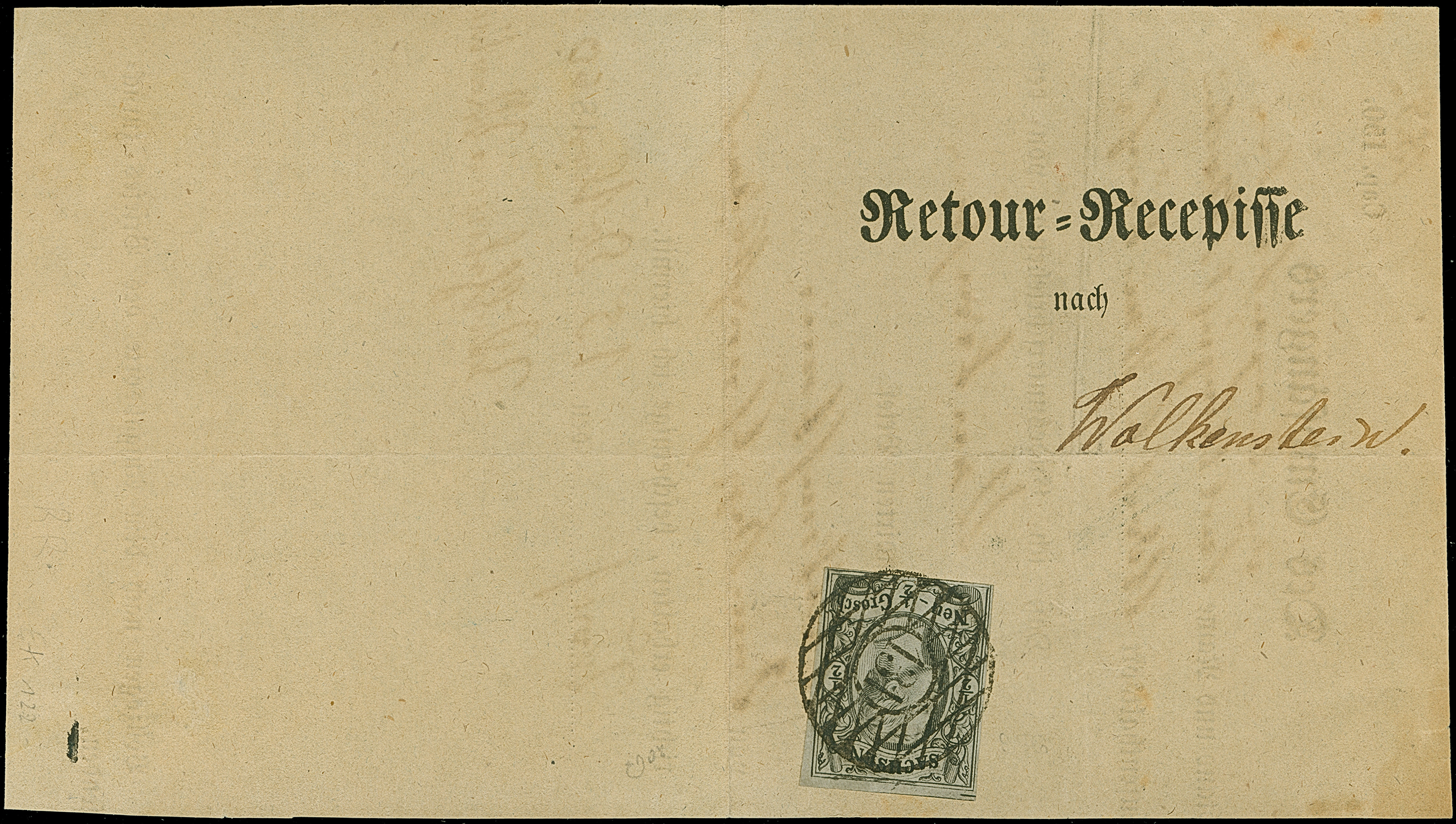 ½ Ngr. auf grau, unten etwas berührt, sonst voll- bis breitrandig, mit Nr. "131"auf etwas beschnittener Retour-Recepisse nach Wolkenstein. Ein attraktives und sehr seltenes Stück in schöner Erhaltung. PROFI hat nur 2 weitere Recepissen mit Johann-Frankatur registriert.