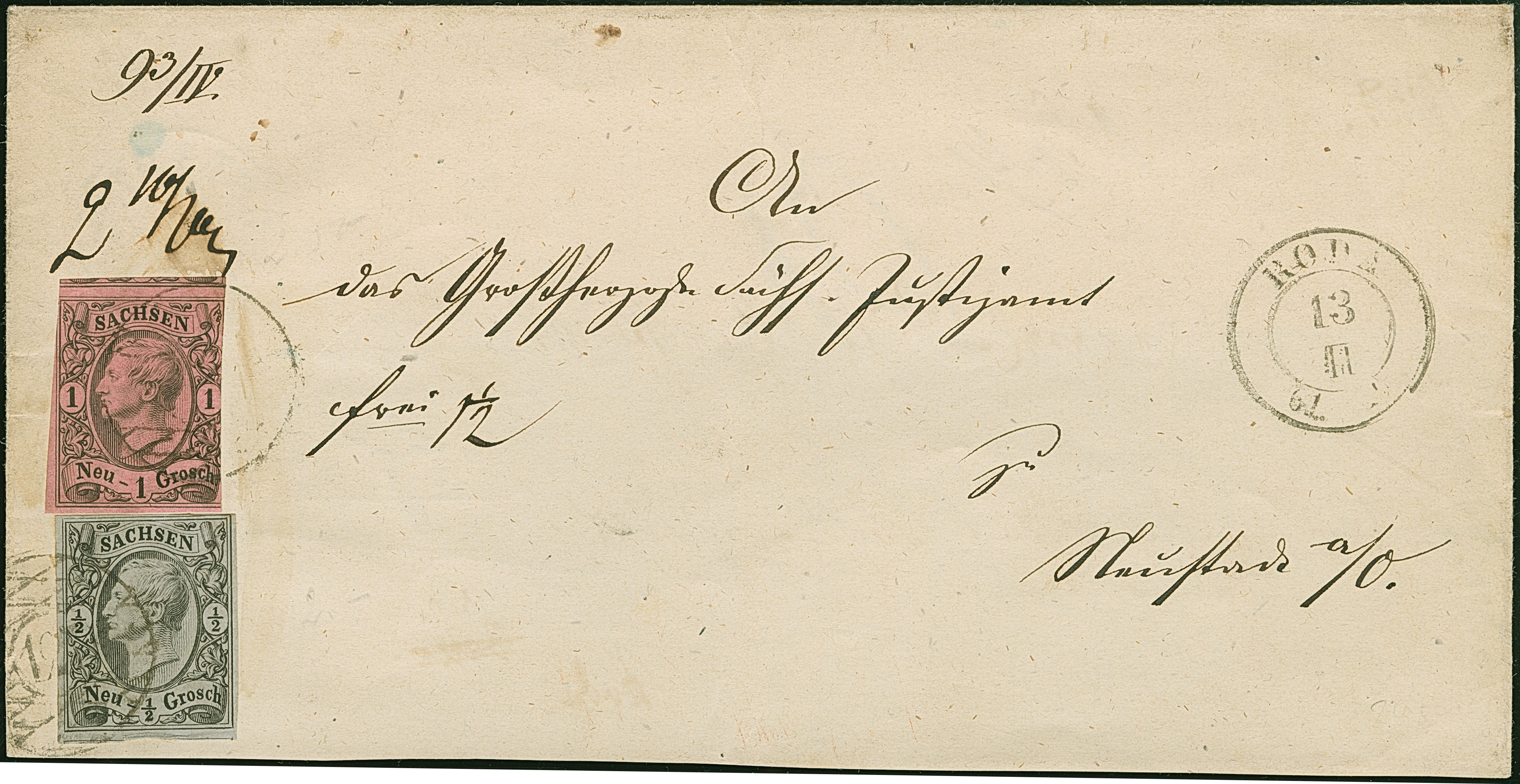 ½ Ngr. auf grau und 1 Ngr. auf hellrötlichkarmin (letztere rechts angeschnitten), mit Nr. "127" und sauber nebengesetztem Doppelkreisstempel "RODA 13/II 61" auf Briefvorderseite der 3.Gewichtsstufe mit einer Rückklappe (darauf Durchgangsstempel von Eisenberg) nach Neustadt an der Orla, im Gebiet von Thurn und Taxis. Eine außerordentlich seltene Portostufe in den Taxis'schen Grenzrayon; es ist nur ein weiteres Ganzstück registriert.