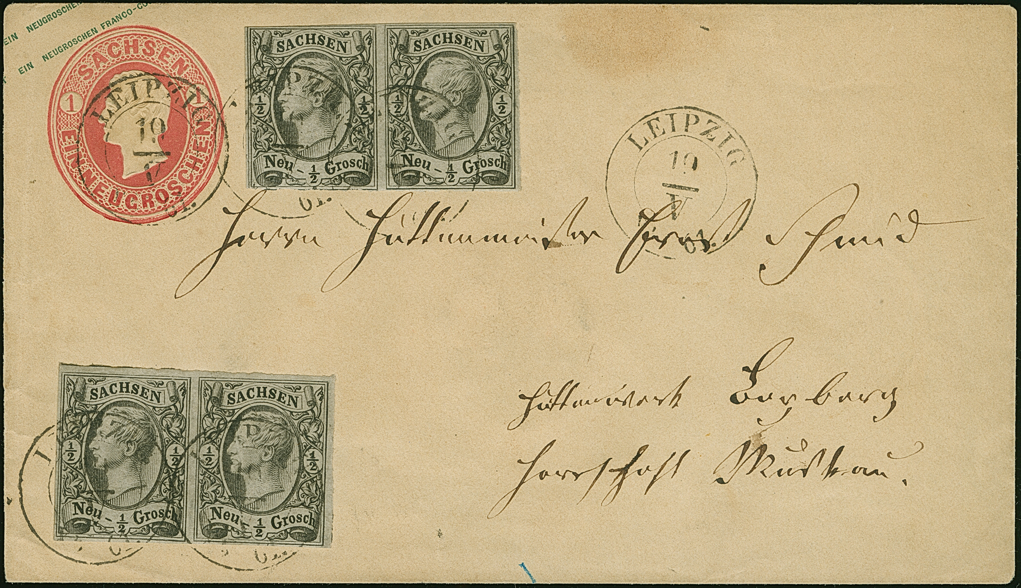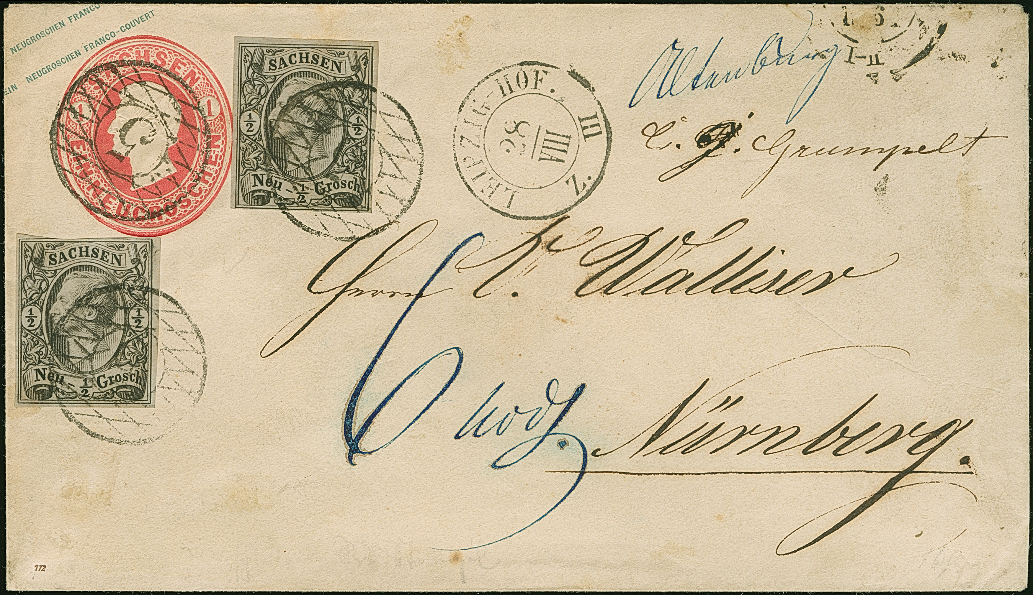 ½ Ngr. auf grau, 2 Einzelwerte (eine oben etwas berührt) als Zufrankatur auf Ganzsachenumschlag 1 Ngr. rosa, mit Nr. "5" (große Type) und nebengesetztem DKr. "LEIPZIG-HOF 28 VIII" sowie Aufgabevermerk "Altenburg", nach Nürnberg. Der Brief war für diese Distanz unterfrankiert, daher mit "6" Kreuzern nachtaxiert. Eine sehr seltene und attraktive Frankaturkombination.