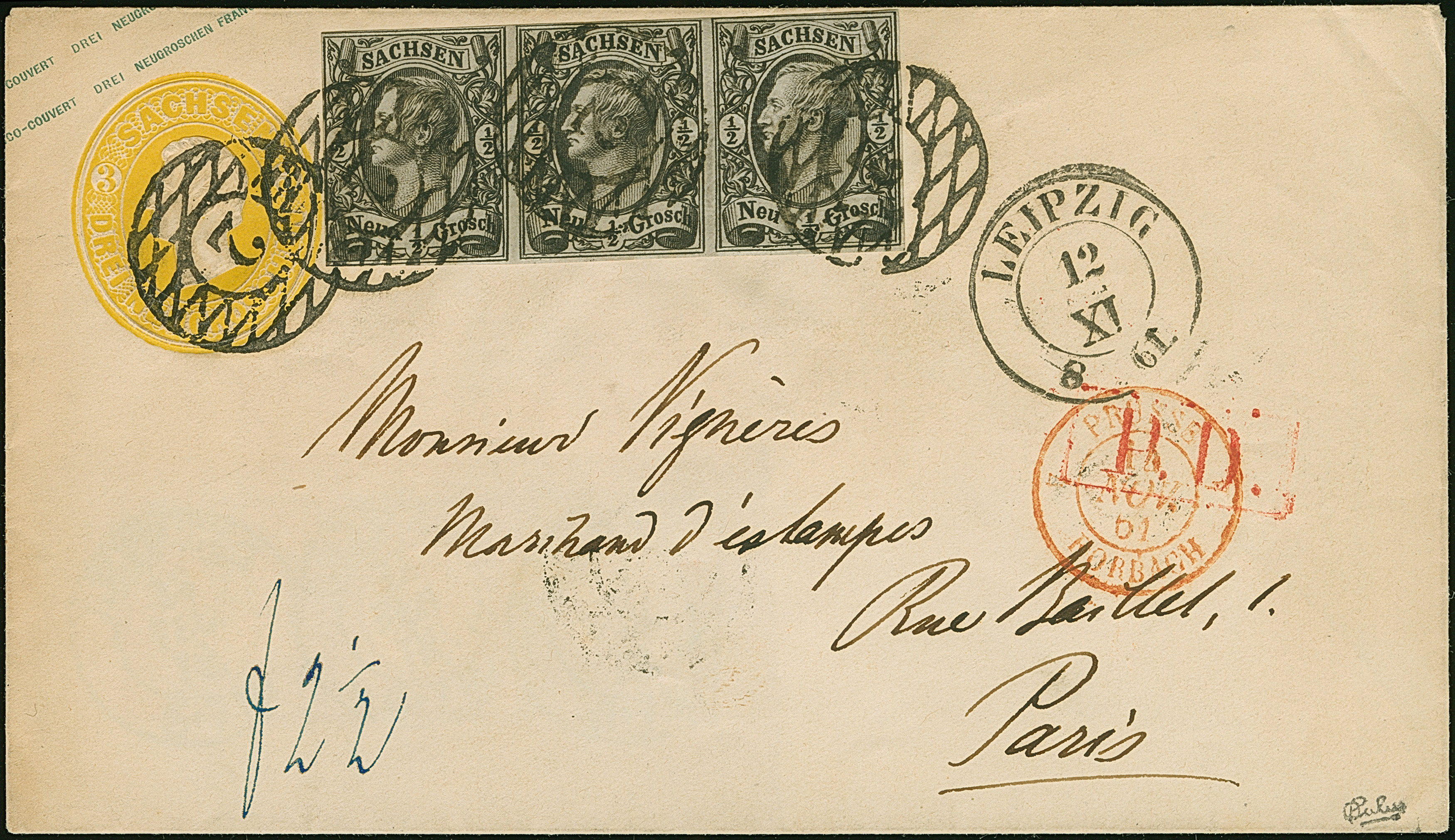 ½ Ngr. auf grau im waagerechten 3er-Streifen, links leicht berührt, sonst noch voll- bis breitrandig, mit Nr. "2" und mit nebengesetztem DKr. "LEIPZIG 12 XI 61" nach Paris, mit vorderseitigen Übergangsstempel "PRUSSE FORBACH". Schöne und einwandfreie Erhaltung. Ein in dieser Form einmaliger Auslandsbrief. Signiert Calves.