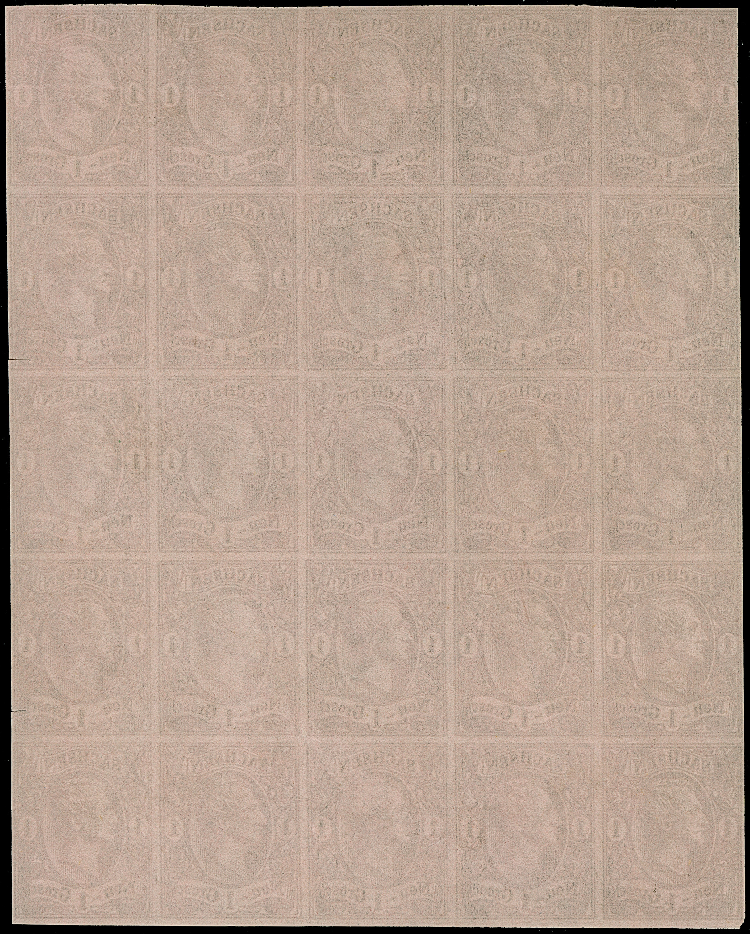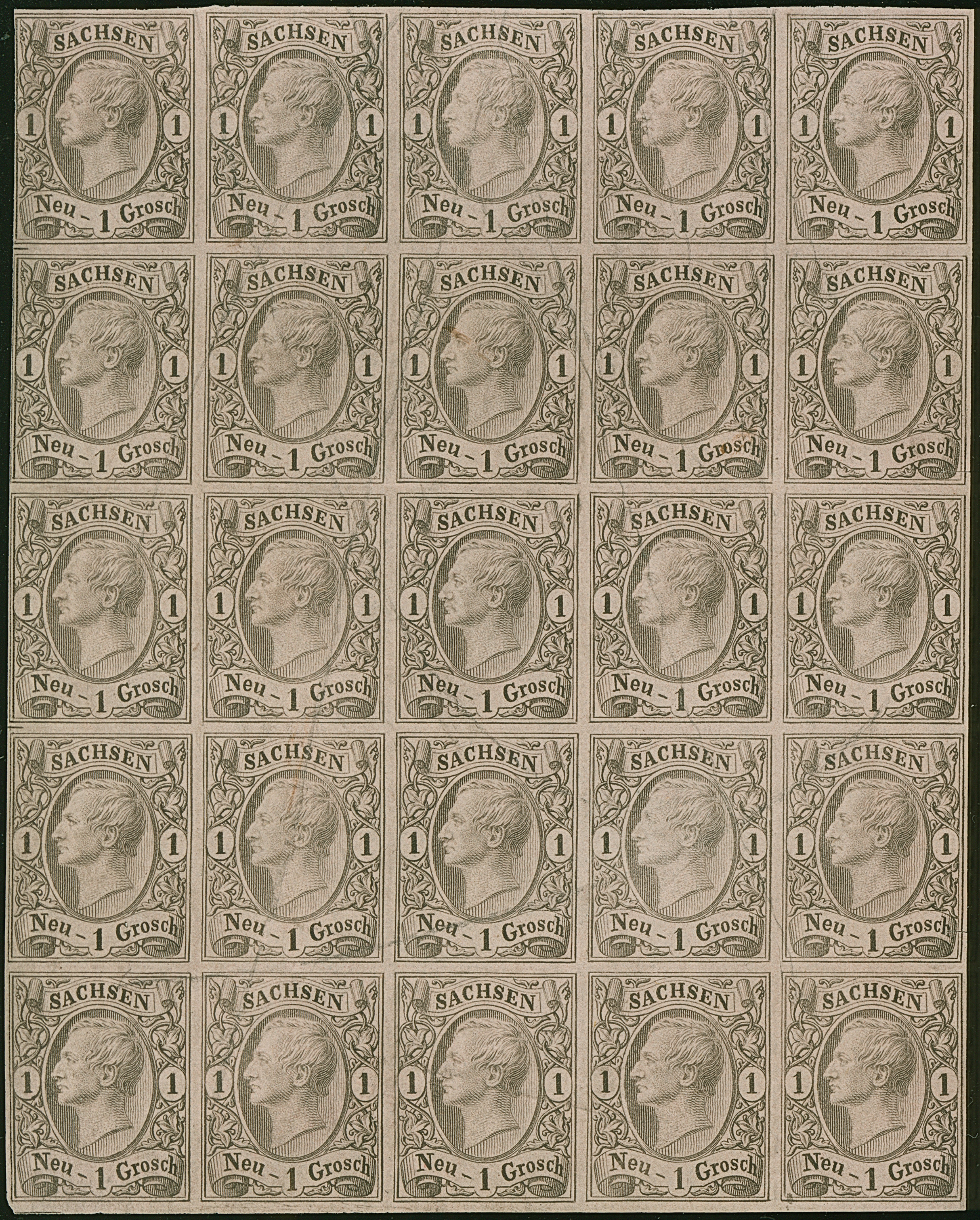 1 Ngr. auf rosa im senkrechten 25er-Block, links oben etwas berührt, sonst voll-bis breitrandig, ungebraucht ohne Gummi mit schwachen Entwertungs-Federzügen. Nach dem 50er-Bogenteil der feuerroten Nuance größte ungebrauchte Einheit dieser Marke.