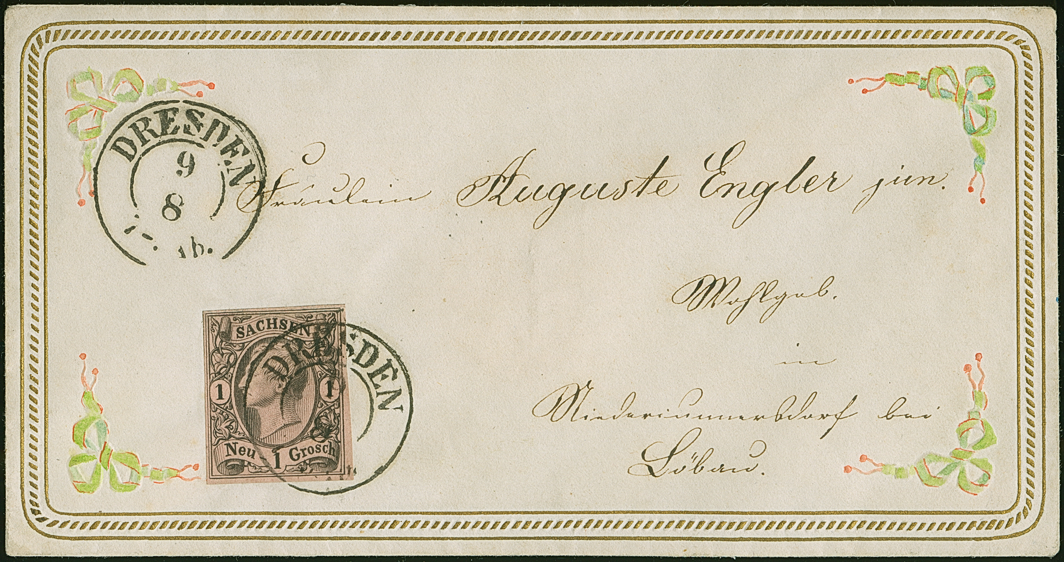 1 Ngr. auf mattgraurot mit sauber auf- und nebengesetztem Doppelkreisstempel "DRESDEN 9 8" auf Zierbrief mit in Gold geprägter Borde und handcolorierten Eckschleifen, nach Löbau mit Ankunftsstempel. Der Oberrand der Marke kunstvoll ergänzt, sonst gute und frische Erhaltung. Ein besonders attraktiver Brief.