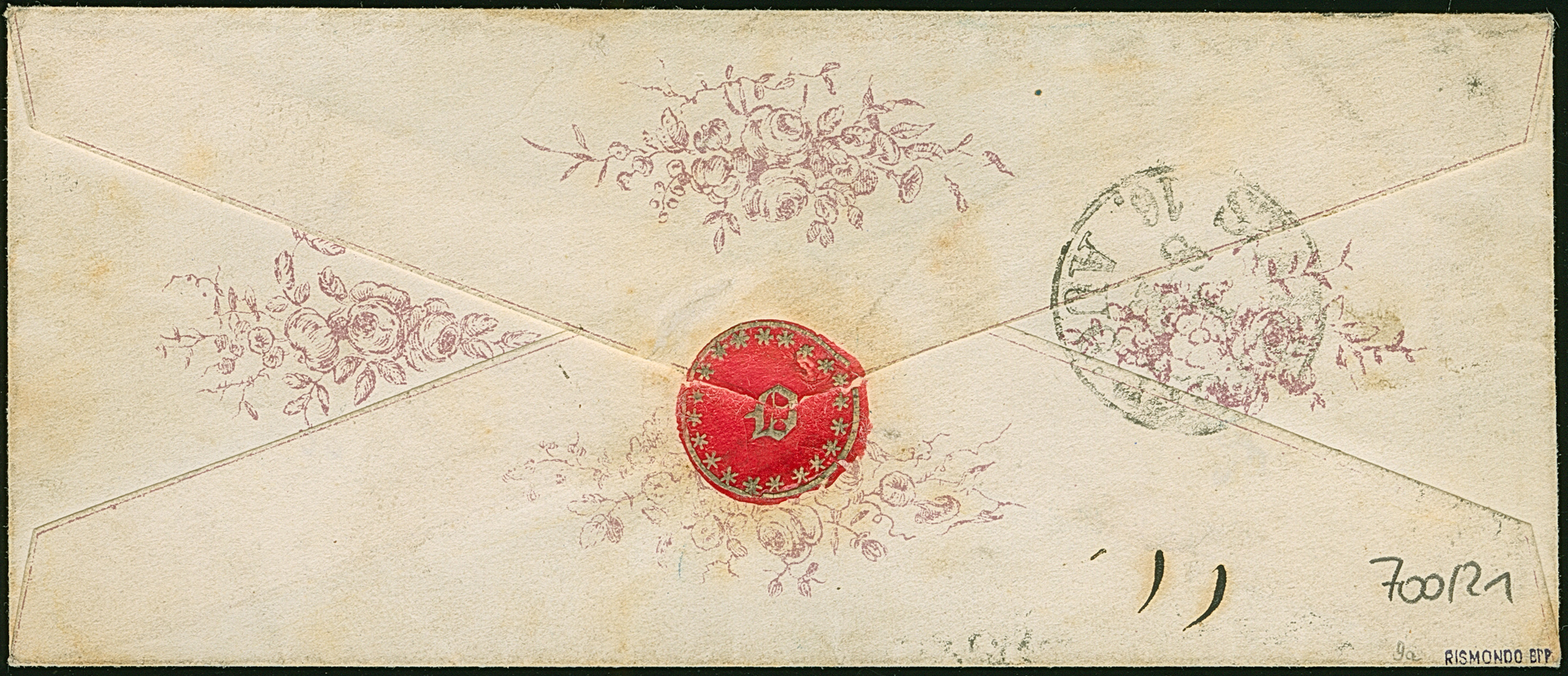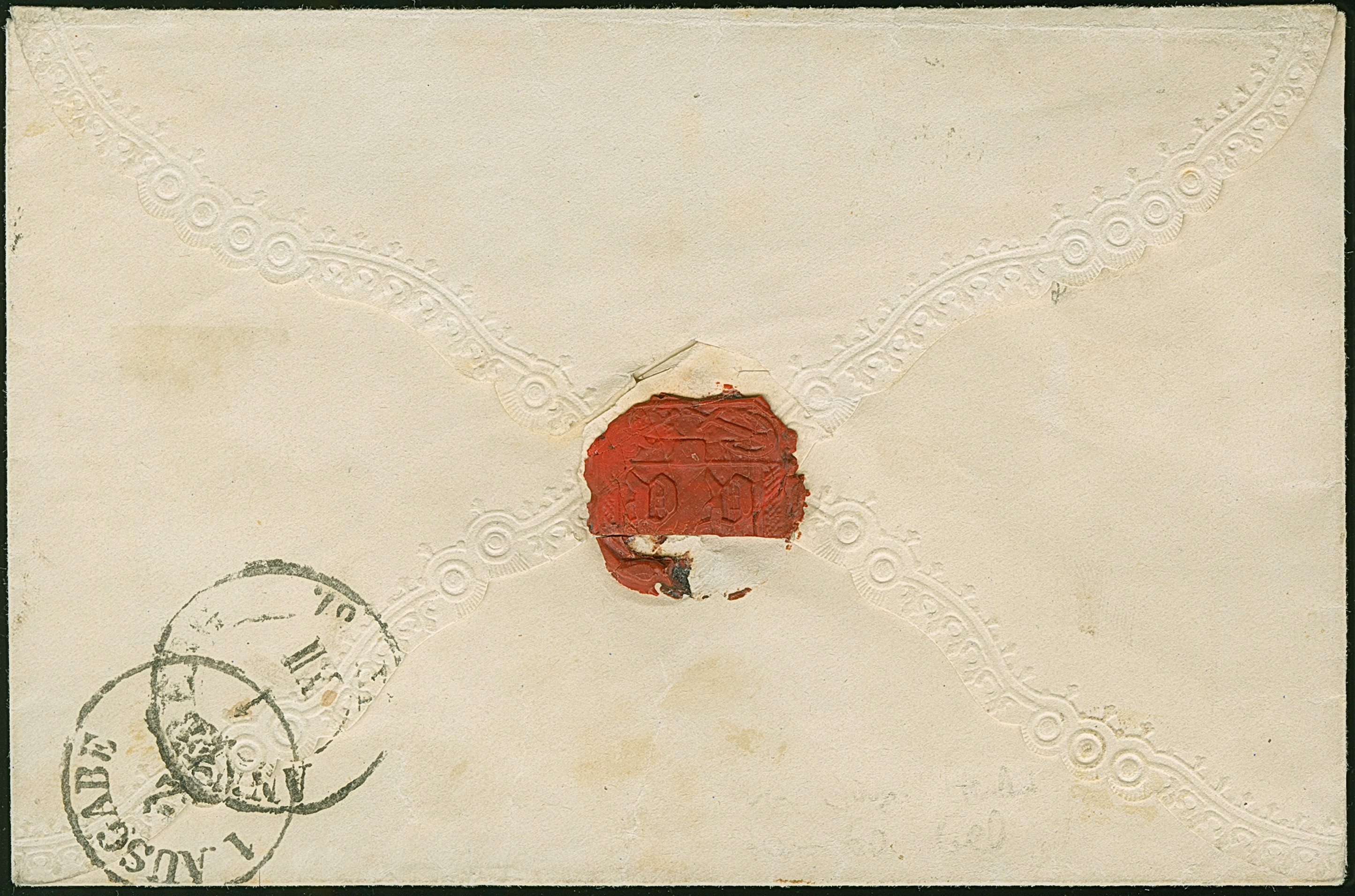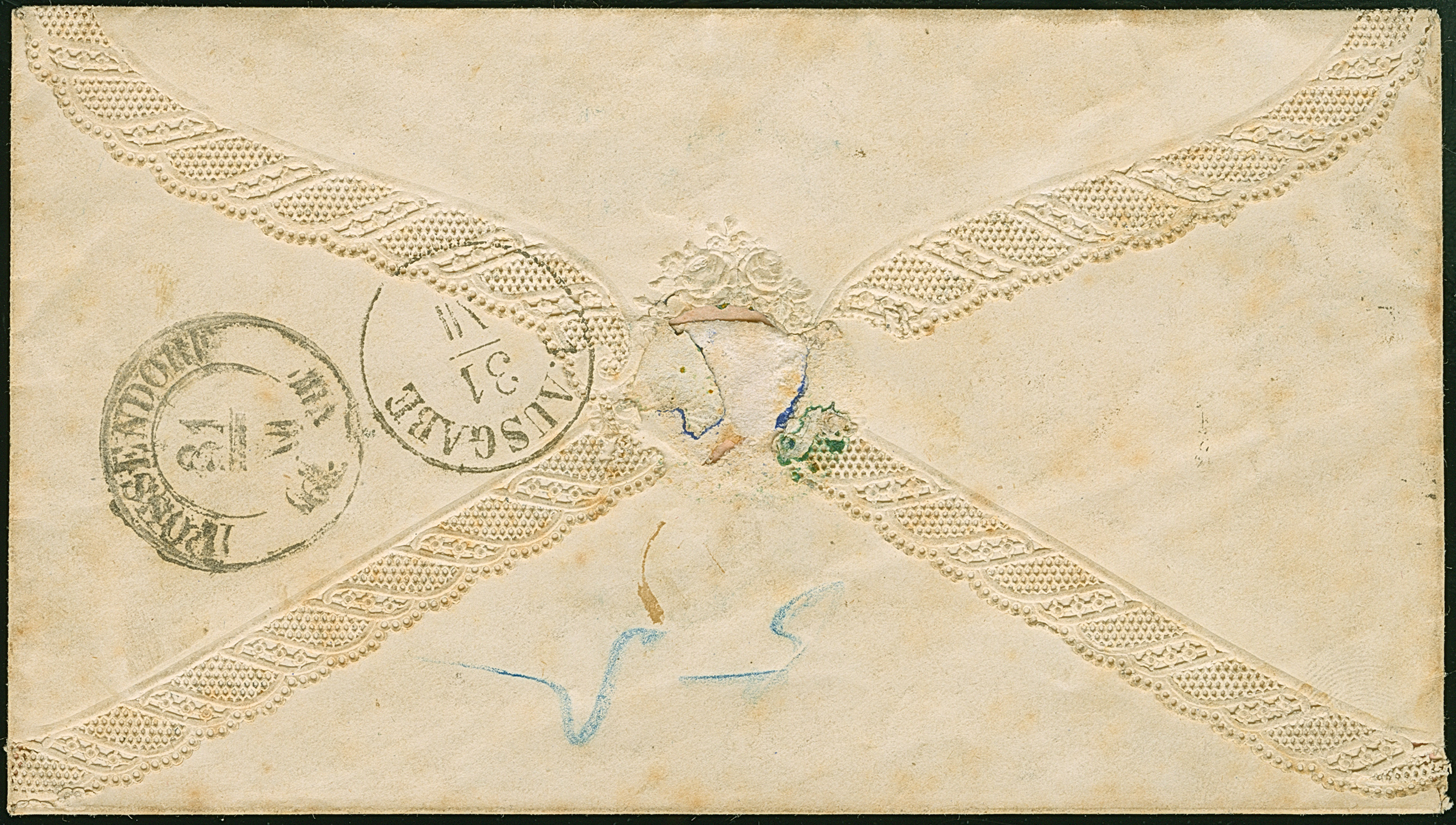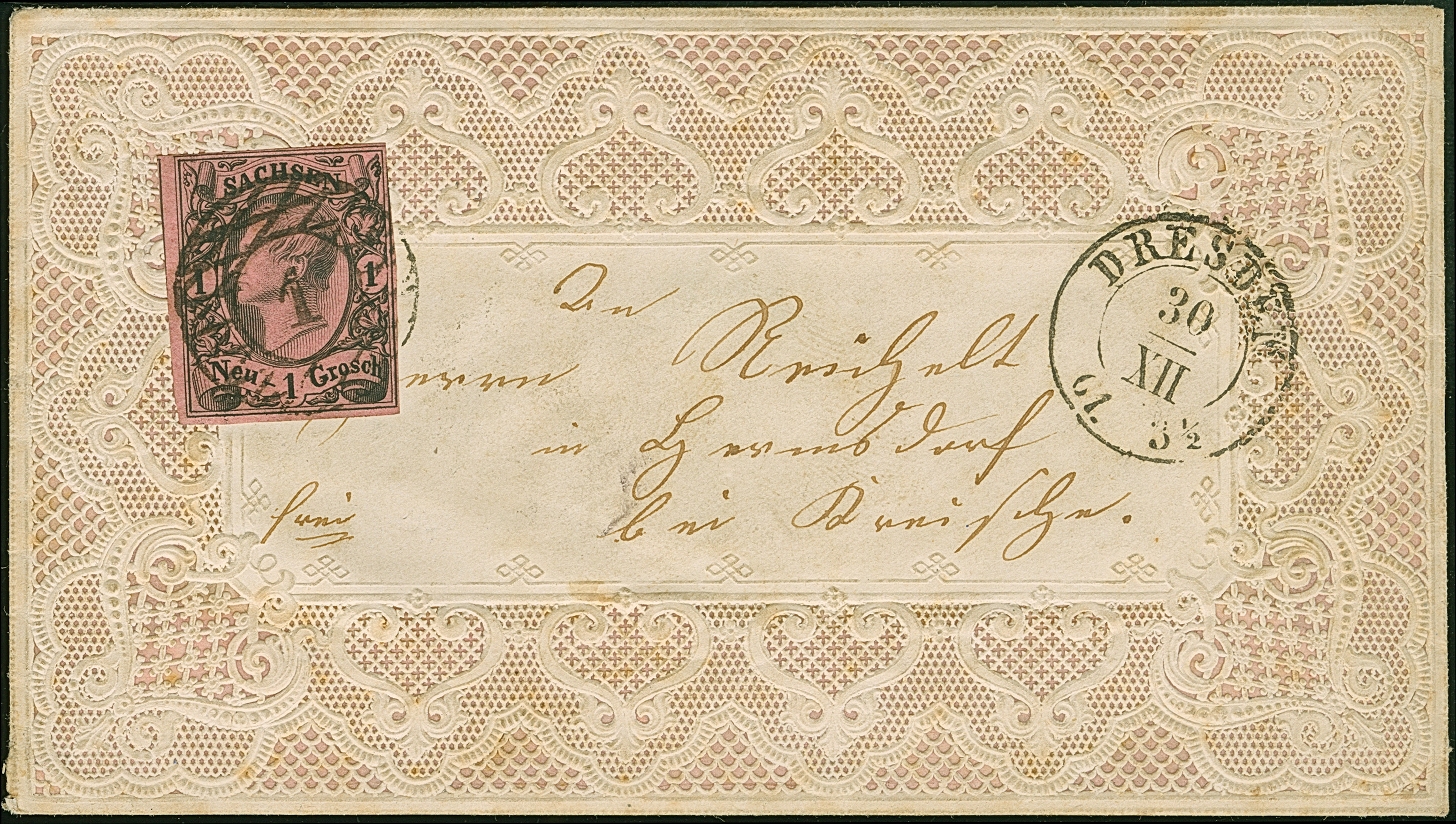 1 Ngr. auf mattgraurot, rechts oben leicht berührt, sonst voll- bis überrandig, mit sauber aufgesetzter Nr. "1" und klar nebengesetztem Doppelkreisstempel "DRESDEN 30/XII 61" auf Zier-Kuvert mit prachtvoller, spitzenartig durchbrochener Zierborde, rosa hinterlegt, nach Hermsdorf bei Kreischa. Ein wundervolles Stück in hervorragender Erhaltung. Fotoattest Rismondo BPP (2010)
