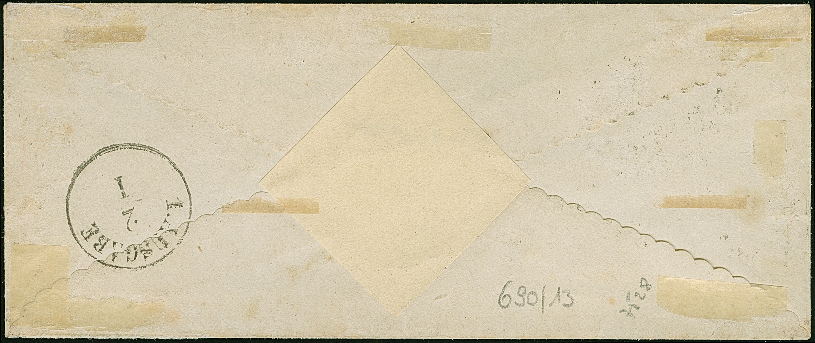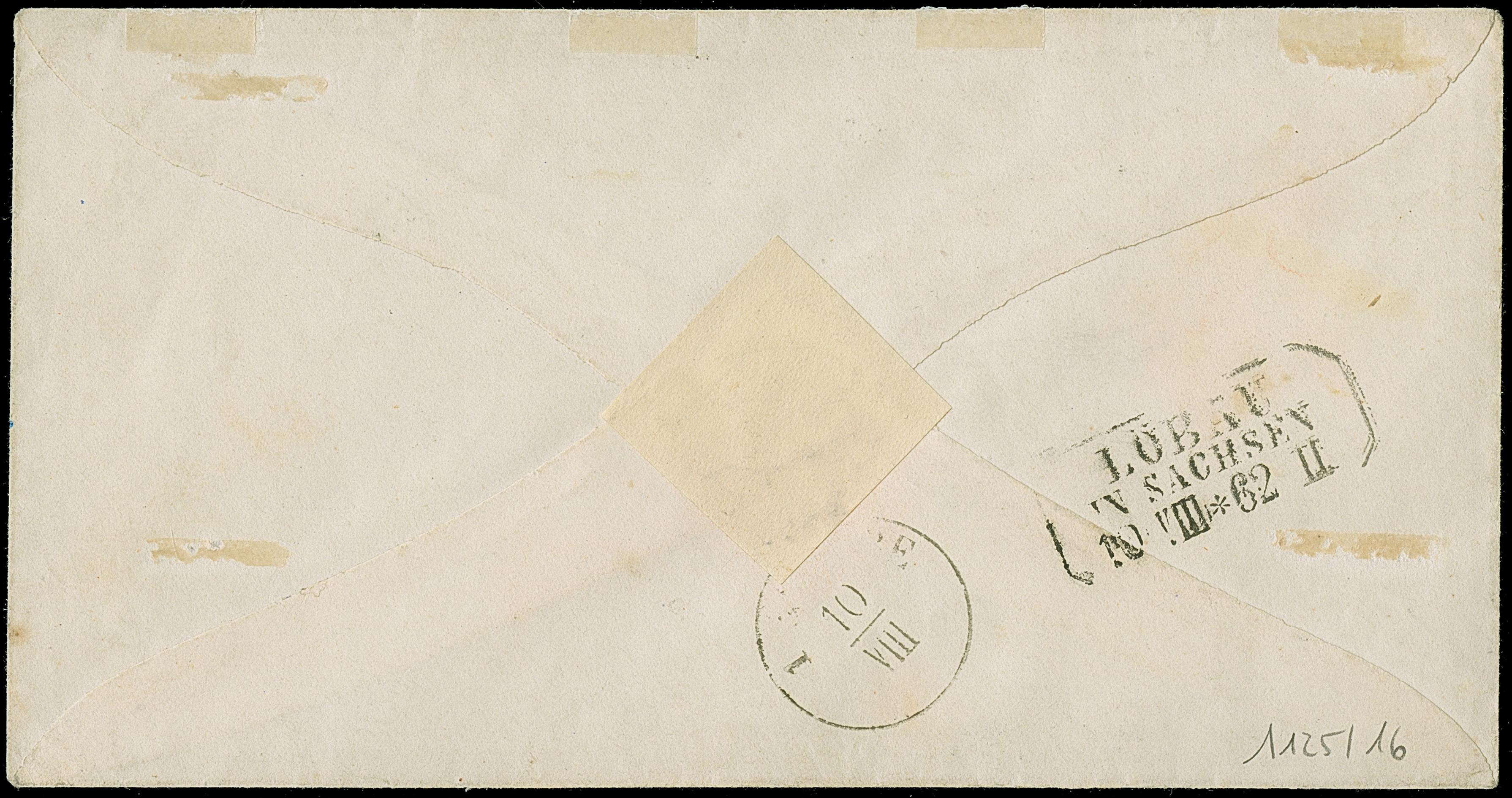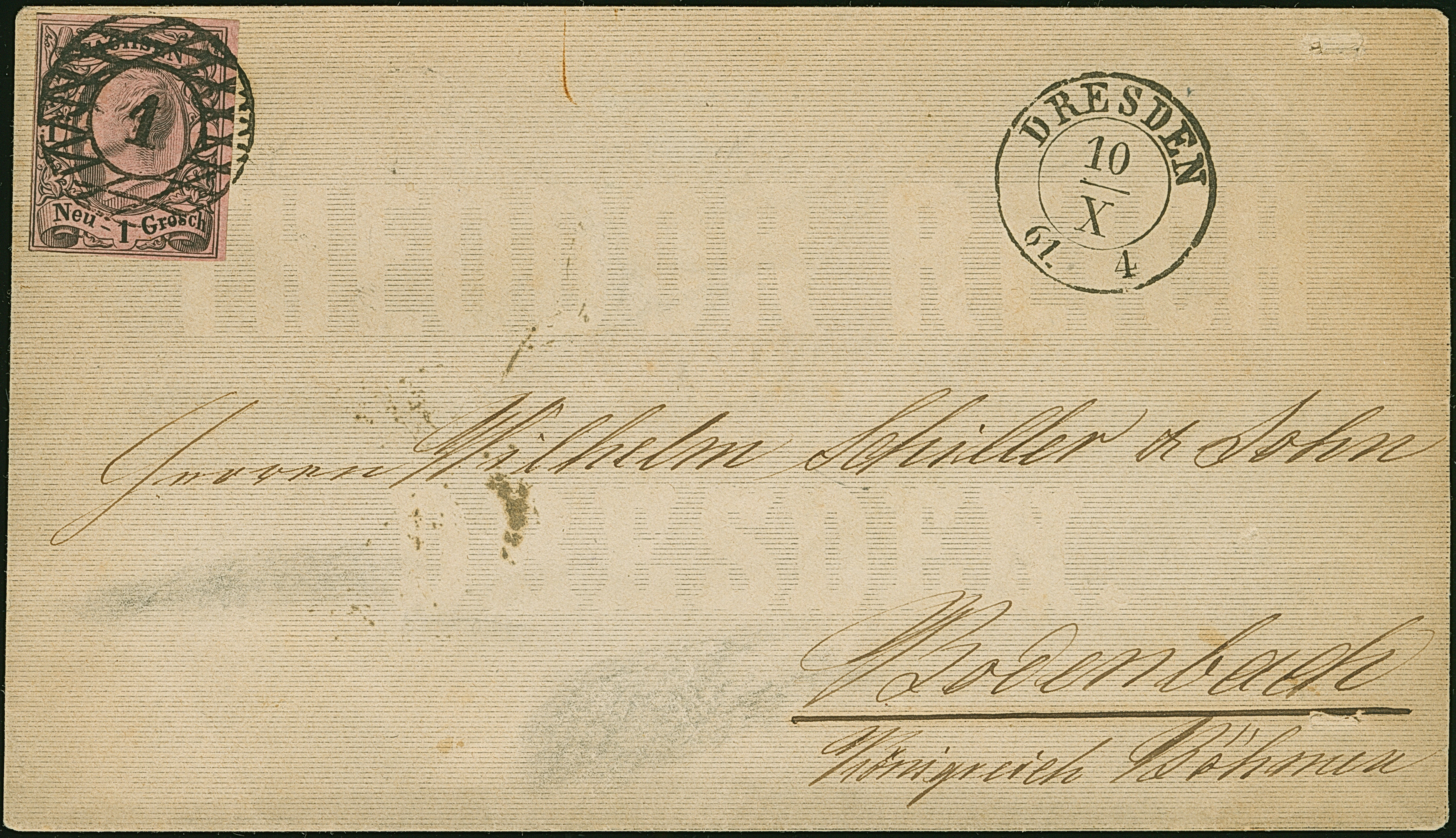1 Ngr. auf mattgraurot, noch voll- bis breitrandig, mit sauber aufgesetzter Nr. "1" und klar nebengesetztem Doppelkreisstempel "DRESDEN 10/X 61" auf Kuvert mit flächiger Firmenreklame "THEODOR REICH/DRESDEN", nach Bodenbach in Böhmen, mit Ankunftsstempel. Sehr selten.