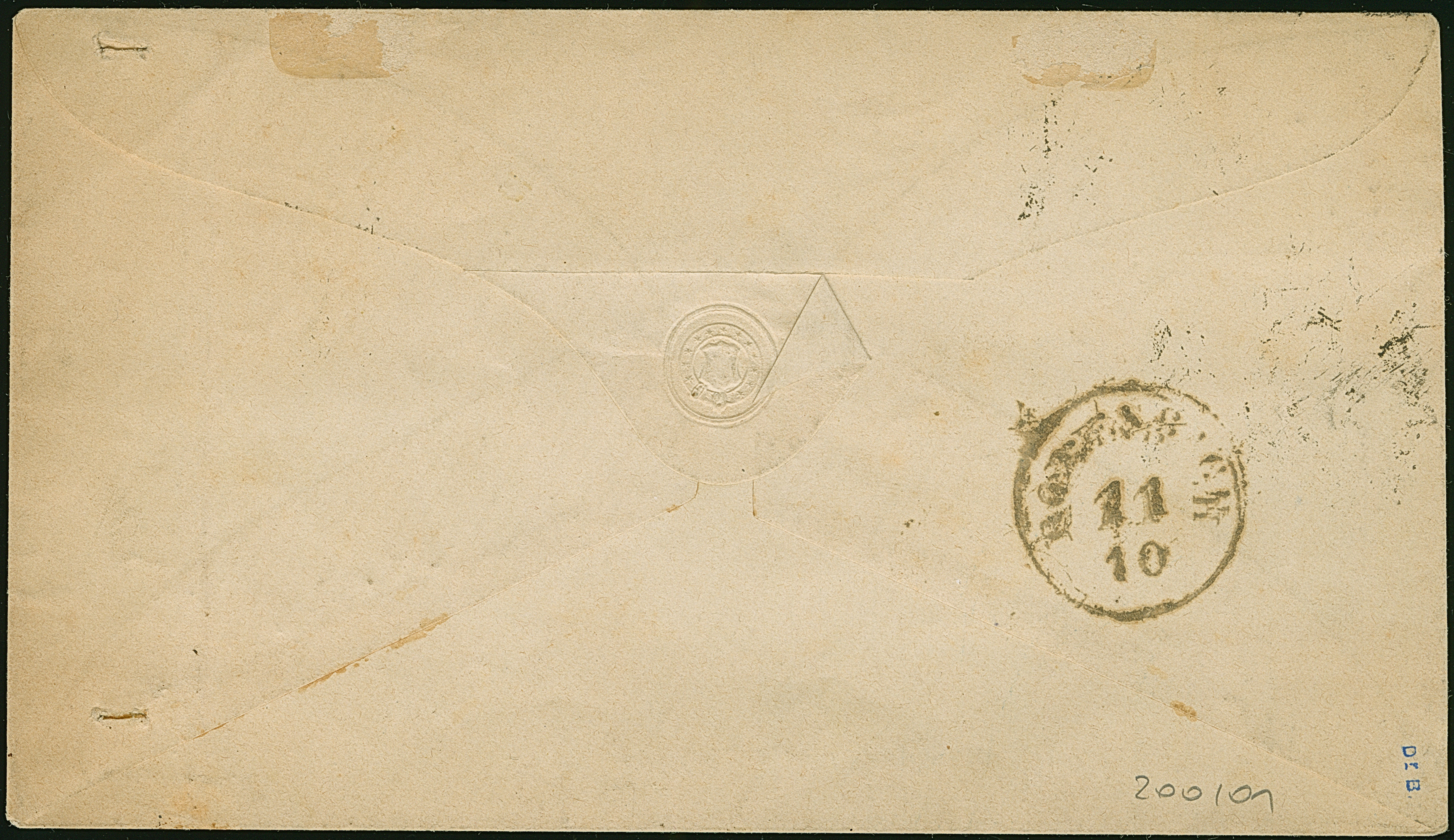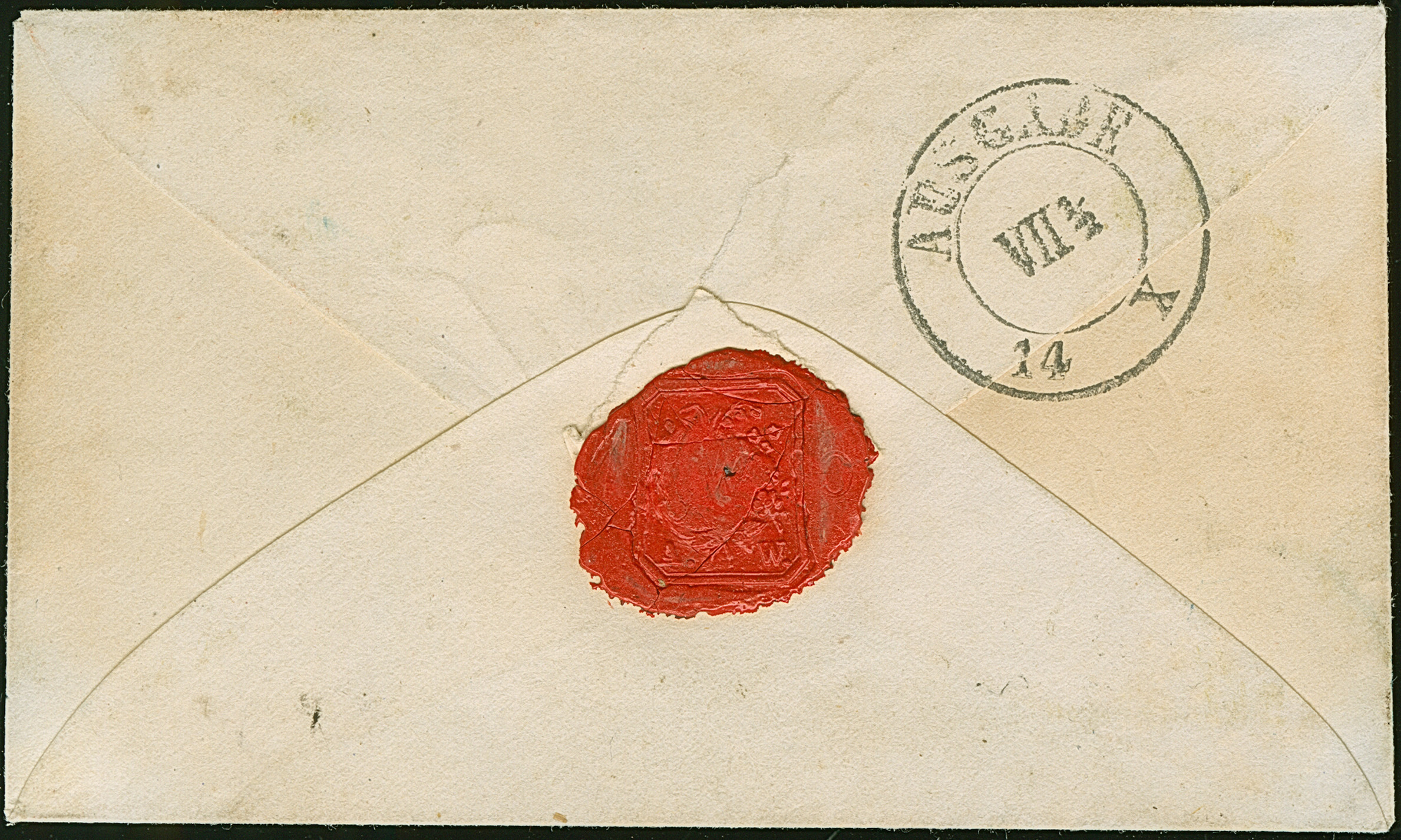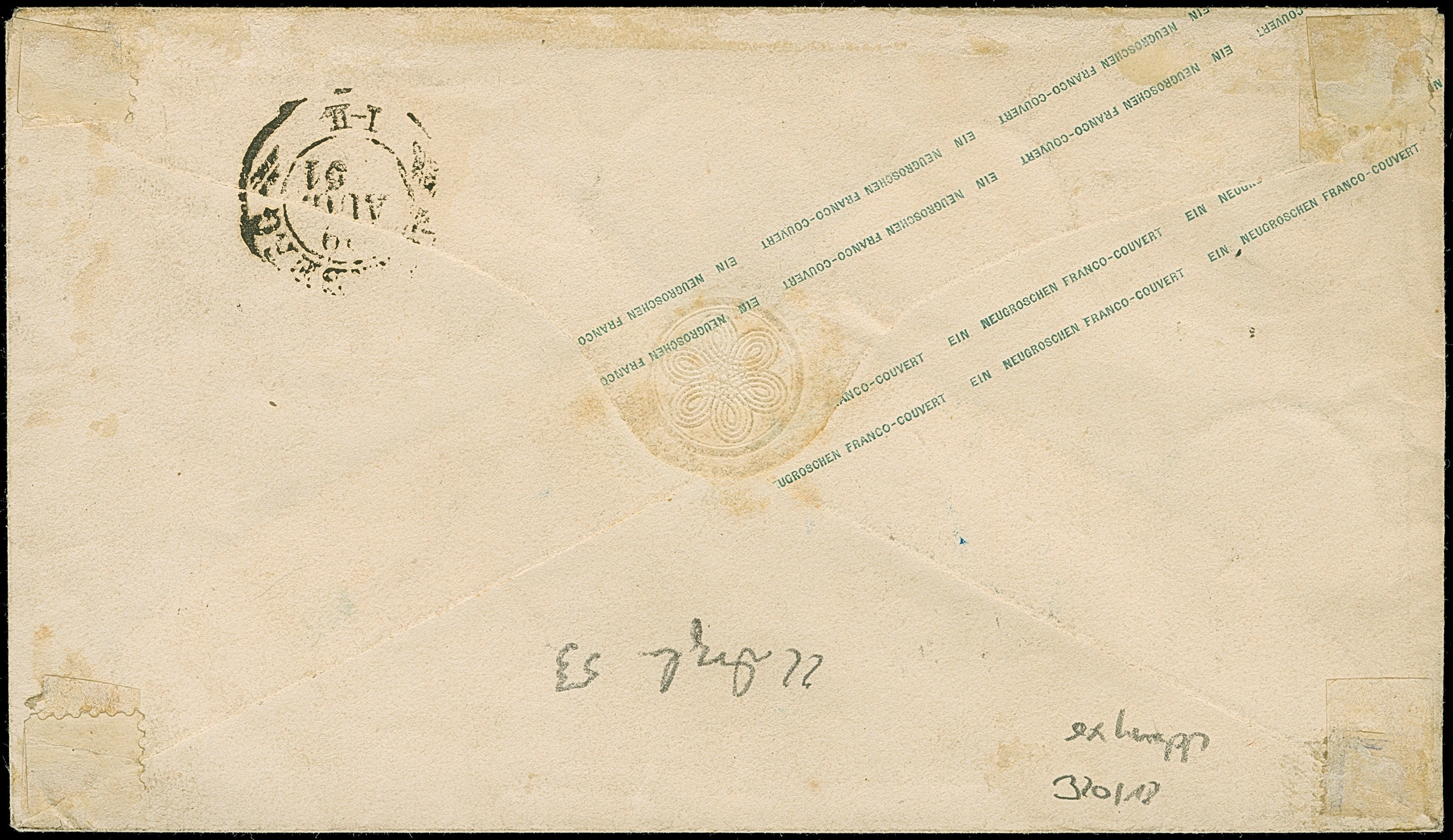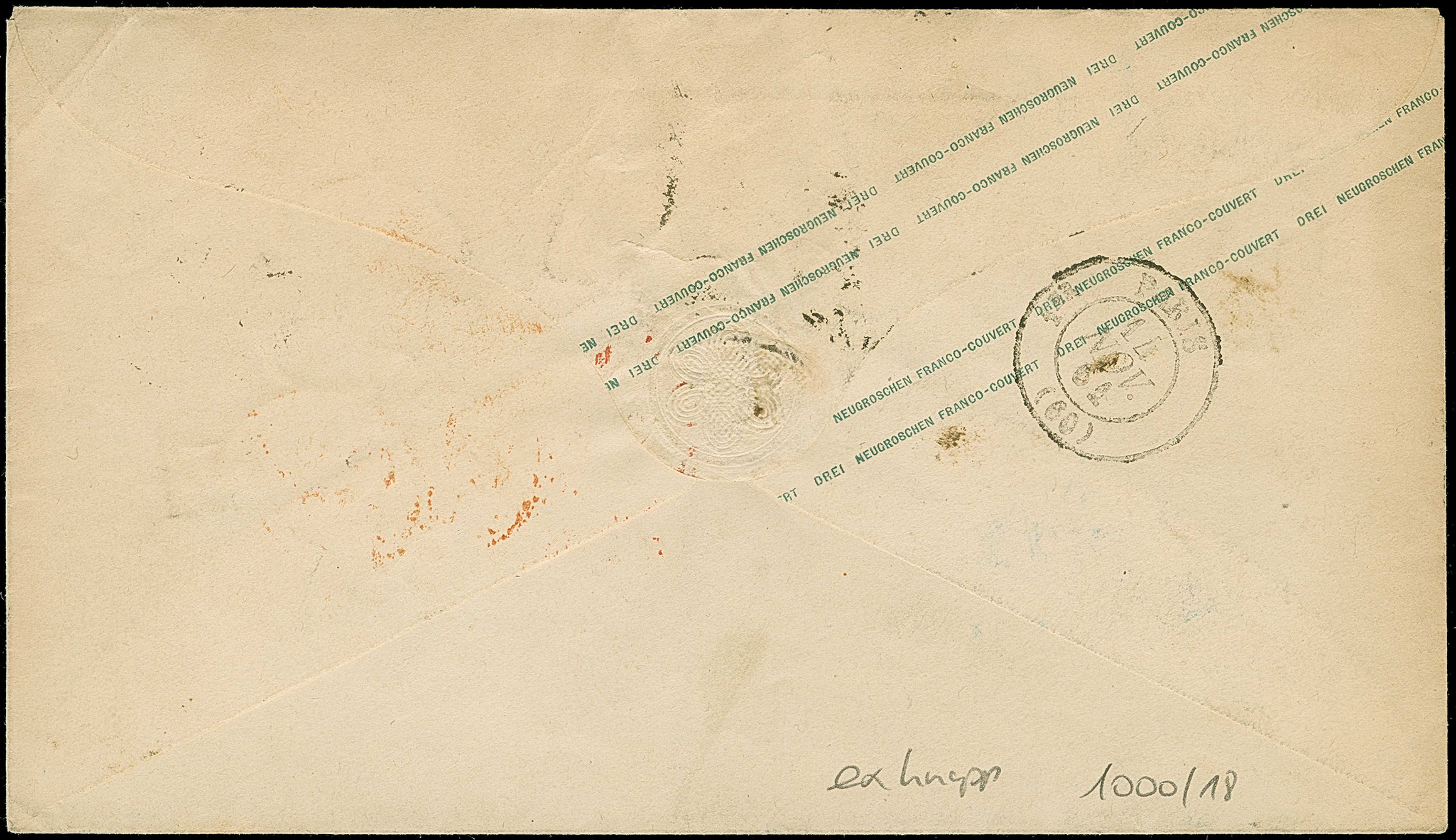 1 Ngr. auf mattgraurot, noch voll- bis breitrandig, mit sauber aufgesetzter Nr. "1" und klar nebengesetztem Doppelkreisstempel "DRESDEN 10/X 61" auf Kuvert mit flächiger Firmenreklame "THEODOR REICH/DRESDEN", nach Bodenbach in Böhmen, mit Ankunftsstempel. Sehr selten.