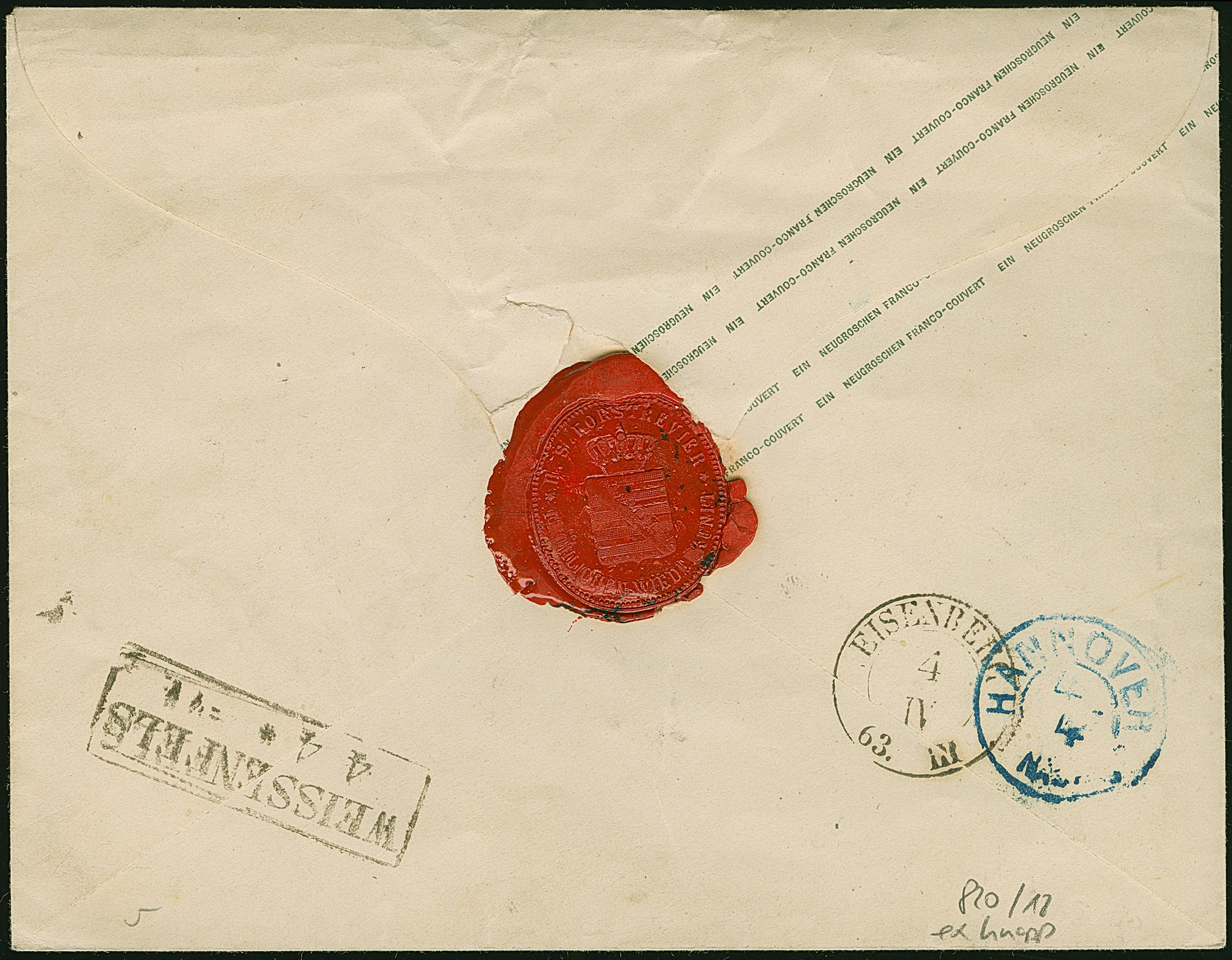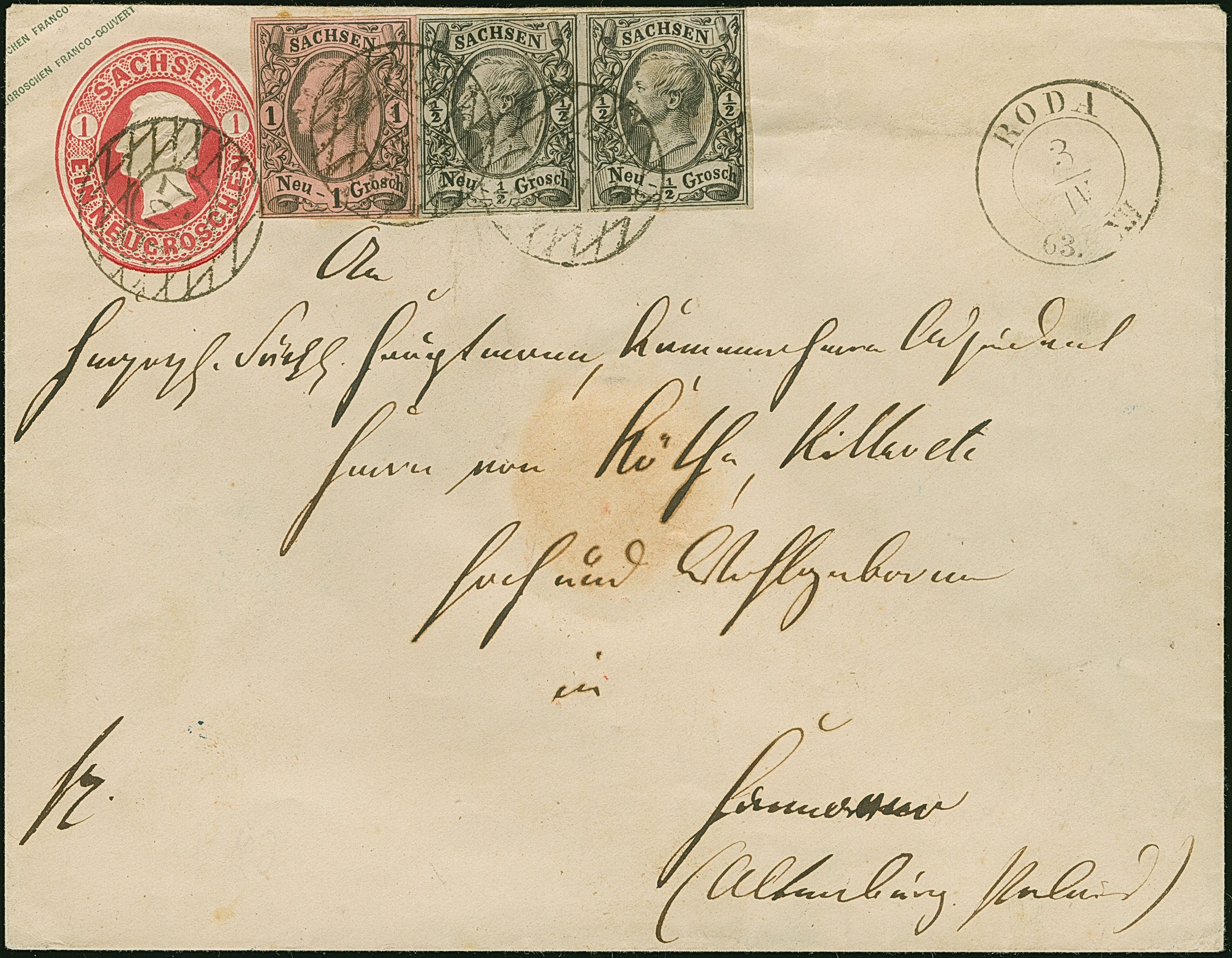 ½ Ngr. auf grau, waagerechtes Paar und 1 Ngr. auf mattgraurot, letztere links unten berührt, sonst alle voll- bis breitrandig, mit Nr. "127" und nebengesetztem Doppelkreisstempel "RODA 3 IV 63", nach Hannover, mit Ankunftsstempel. Im Kuvert kleiner Siegelfleck und im Bereich der Frankatur etwas knittrig, sonst gute und ursprüngliche Erhaltung. Eine einmalige Kombination; Profi hat kein weiteres Exemplar dieses Umschlages mit 2-farbiger Zufrankatur registriert.