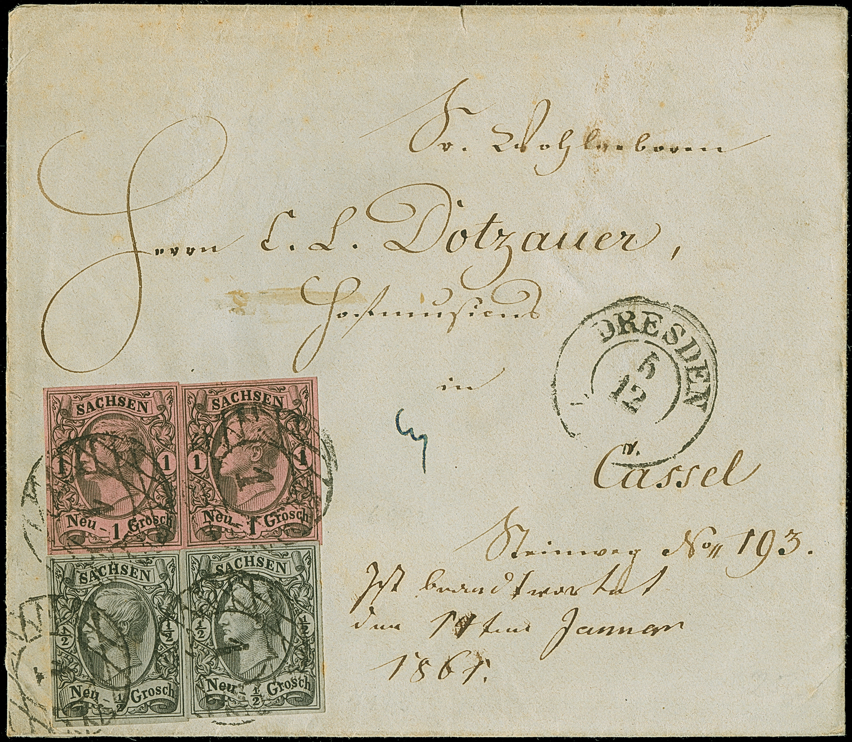 ½ Ngr. auf grau und 1 Ngr. auf mattgraurot, je 2 Einzelwerte, alle voll- bis breitrandig, mit Nr. "1" und nebengesetztem Doppelkreisstempel "DRESDEN 5/12" auf Briefkuvert nach Kassel. Eine attraktive und seltene Darstellung des 3 Ngr.-Portos.