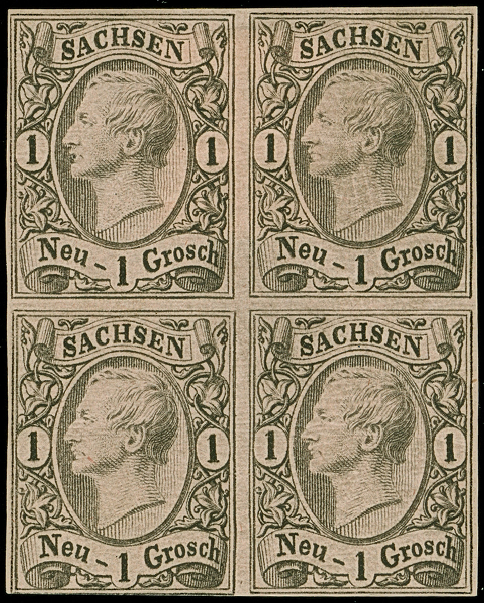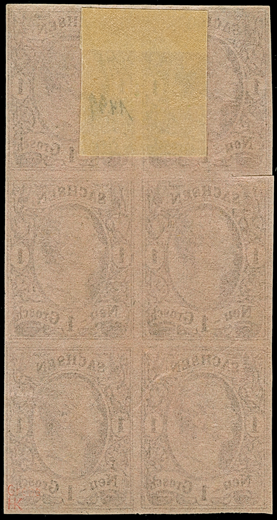 1 Ngr. auf mattgraurot, Type I, im Viererblock, farbfrisch, unten links leicht berührt, sonst vollrandig, ungebraucht mit Originalgummi. Schöne und sonst einwandfreie Erhaltung. Die Type I ist in ungebrauchter Erhaltung sehr selten; es gab – außer Makulatur und ungummierten Bogen in den Postarchiven – keine Restbestände. Größte ungebrauchte Einheit dieses Plattentyps; es ist nur eine weitere registriert.