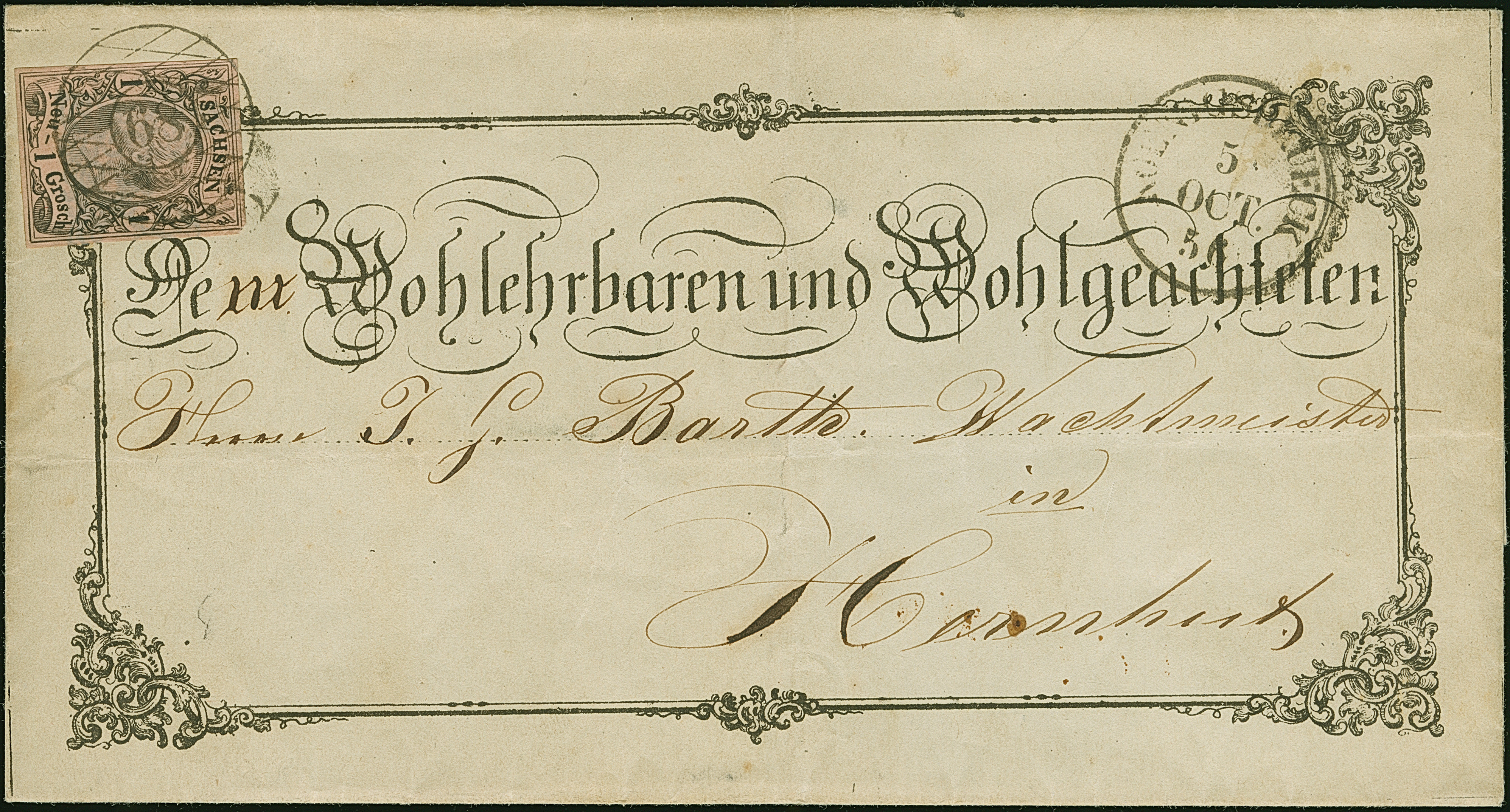 1 Ngr. auf mattgraurot, Type I, voll- bis breitrandig, mit klar aufgesetzter Nr. "15" und sauber nebengesetztem Einkreisstempel "ZITTAU 1/1 60" auf Zierbrief mit dekorativ geprägter und handkolorierter Borde (Kolorierung u.E. Zeitgerecht aber nicht sicher nachweisbar), nach Radeberg, mit Ausgabestempel. Ein außerordentlich attraktiver Neujahrs-Brief in sehr schöner Erhaltung.