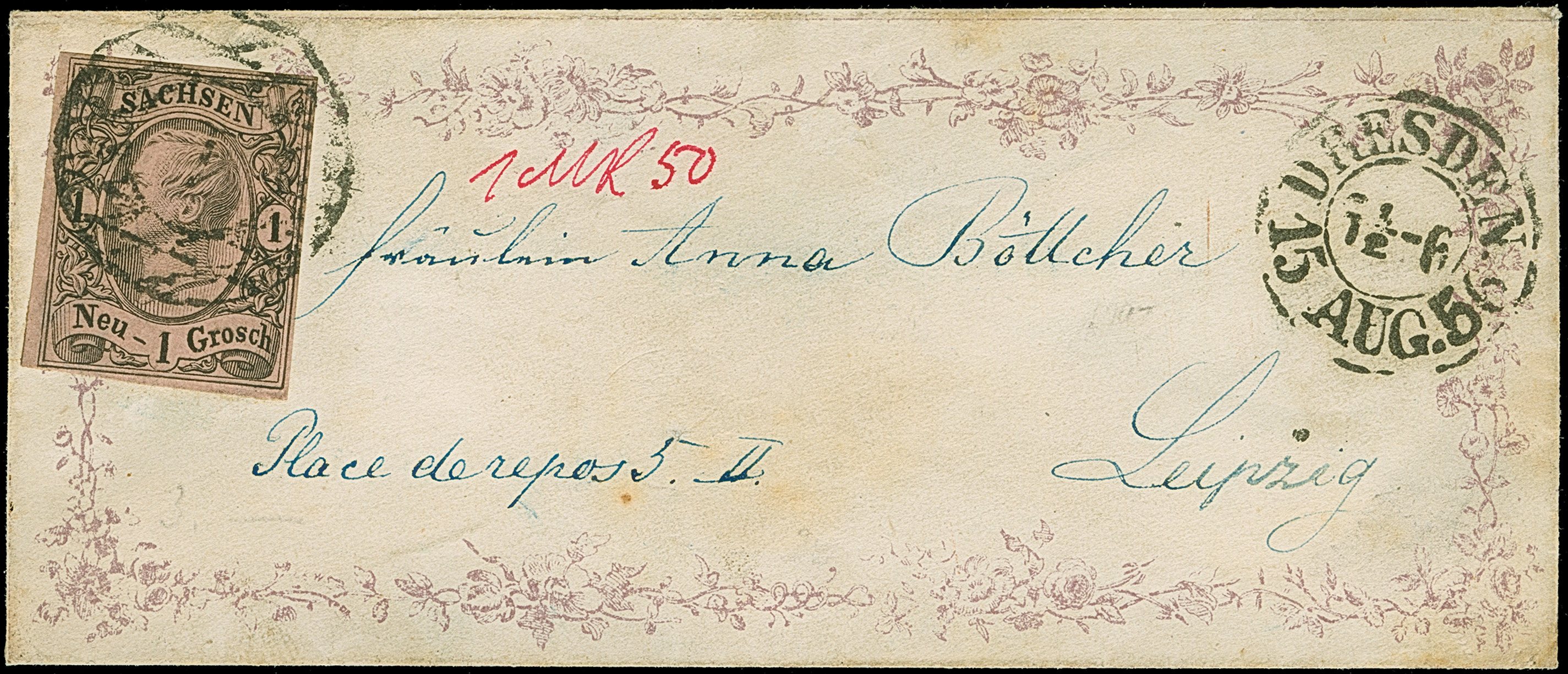 1 Ngr. auf mattgraurot, Type I, voll- bis breitrandig, mit Nr. "1" und nebengesetztem Doppelkreisstempel "DRESDEN 15 AUG 56" auf Zierbrief mit gedruckten violetten Blumenranken, nach Leipzig. Kleine Fremdbeschriftung, sonst einwandfrei. Signiert Rismondo BPP.