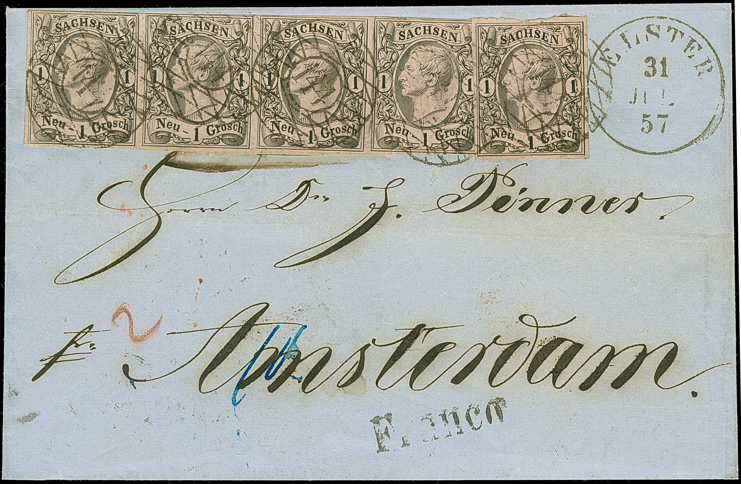 1 Ngr. auf mattgraurot, waagerechter 4er-Streifen und Einzelstück, mit einzeln aufgesetzter Nr. "144" und sauber nebengesetztem Einkreisstempel "ELSTER 31 JUL 57", auf Briefhülle nach Amsterdam. Eine Marke des Streifens oben leicht berührt, sonst soweit sichtbar alle voll- bis breitrandig; ein Wert schwache senkrechte Bugspur. Eine einmalige Darstellung des 5 Ngr.-Portos in die Niederlande.