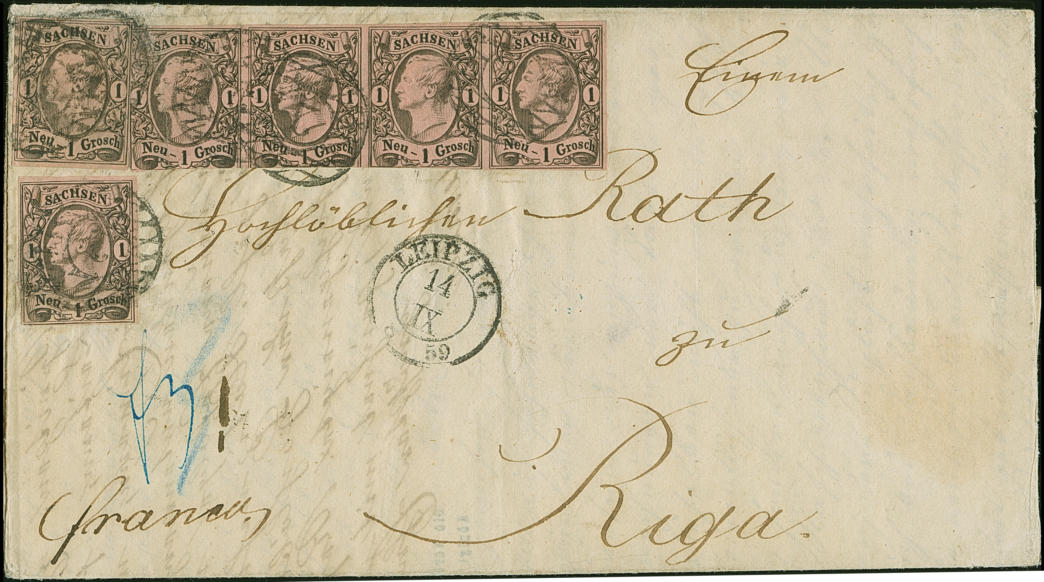 1 Ngr. auf mattgraurot, waagerechter 4er-Streifen und 2Einzelstücke, mit Nr. "2" und sauber nebengesetztem Doppelkreisstempel "LEIPZIG 14 IX 59", auf komplettem Faltbrief nach Riga, mit rückseitigem Eingangsstempel. Das Weiterfranko von 3 Silbergroschen ist vorder- und rückseitig vermerkt. Der Streifen unten etwas angeschnitten, sonst praktisch alle voll- bis breitrandig. Eine ganz außergewöhnliche Mehrfachfrankatur nach Russland.