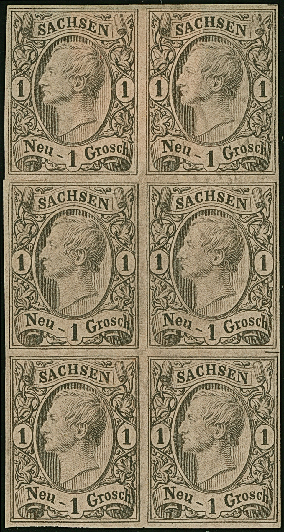 1 Ngr. auf mattgraurot im senkrechten 6er-Block, voll- bis breitrandig, ungebraucht mit Originalgummi. Eine äußerst seltene Einheit, nicht aus der Makulatur stammend.