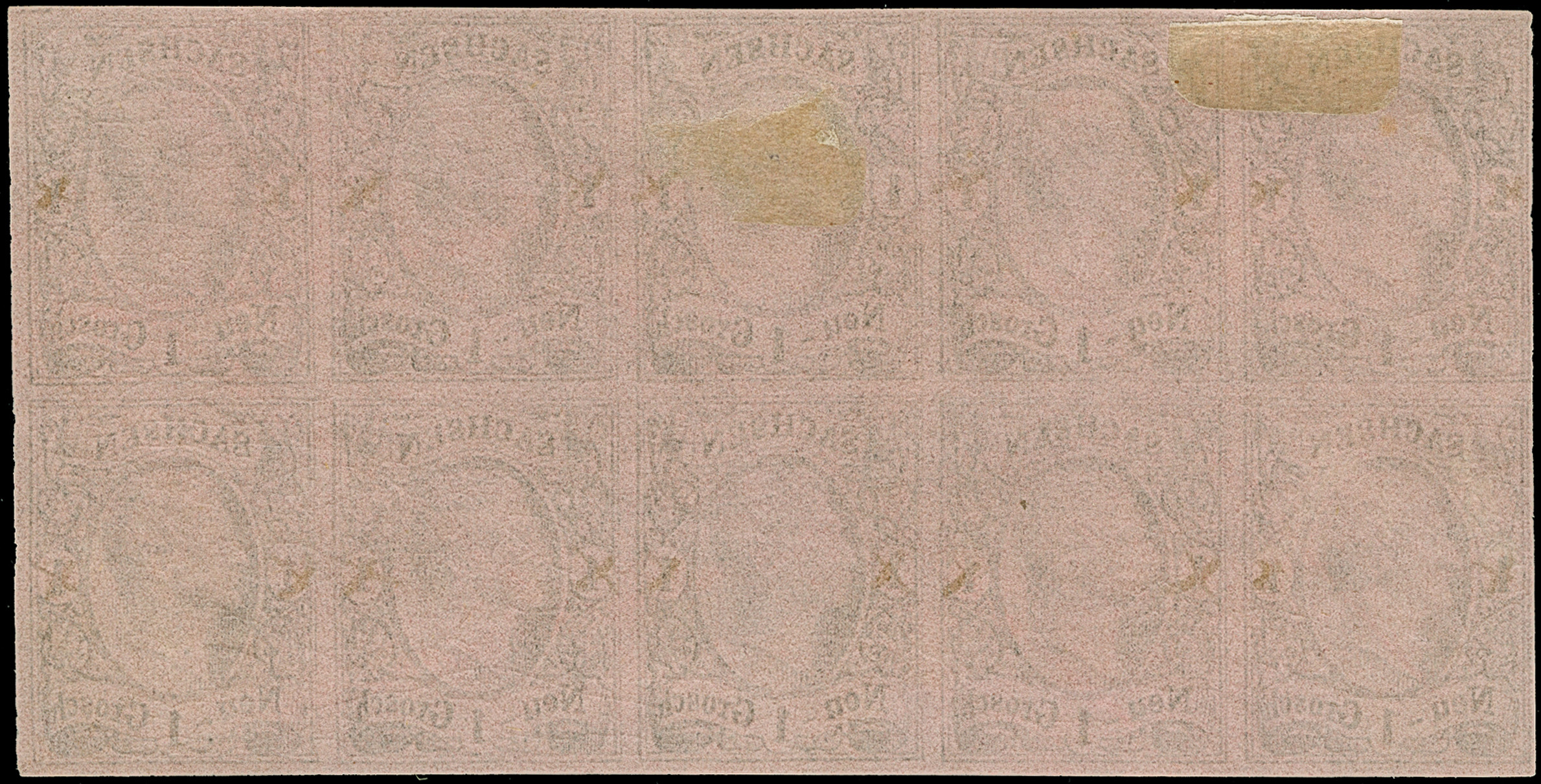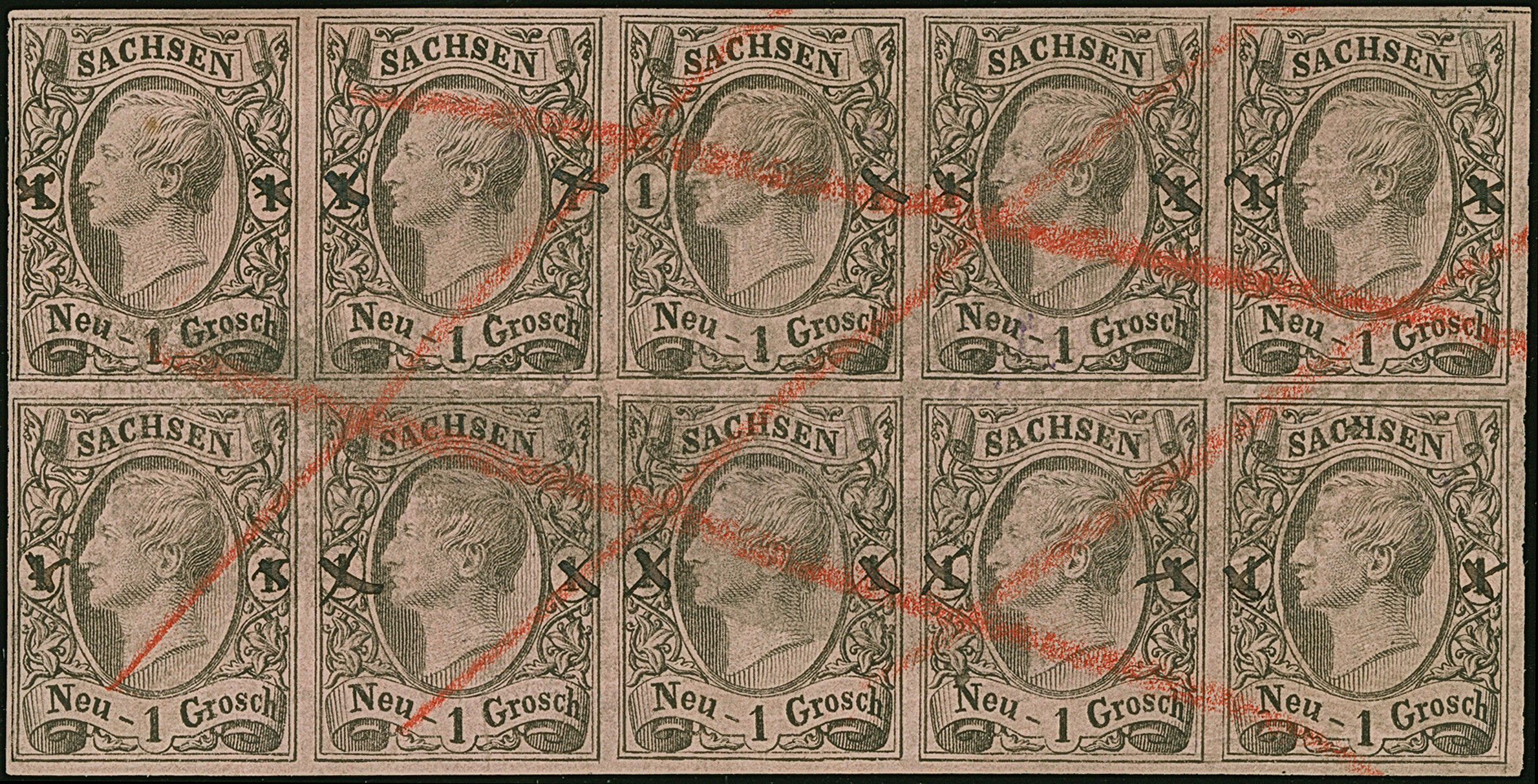 1 Ngr. auf mattgraurot im waagerechten 10er-Block aus der Makulatur, voll- bis breitrandig, entwertet durch roten Kreidestift und zusätzlich die seitlichen Wertziffern einzeln mit Federkreuzen durchgestrichen. In dieser Form sehr ungewöhnlich.