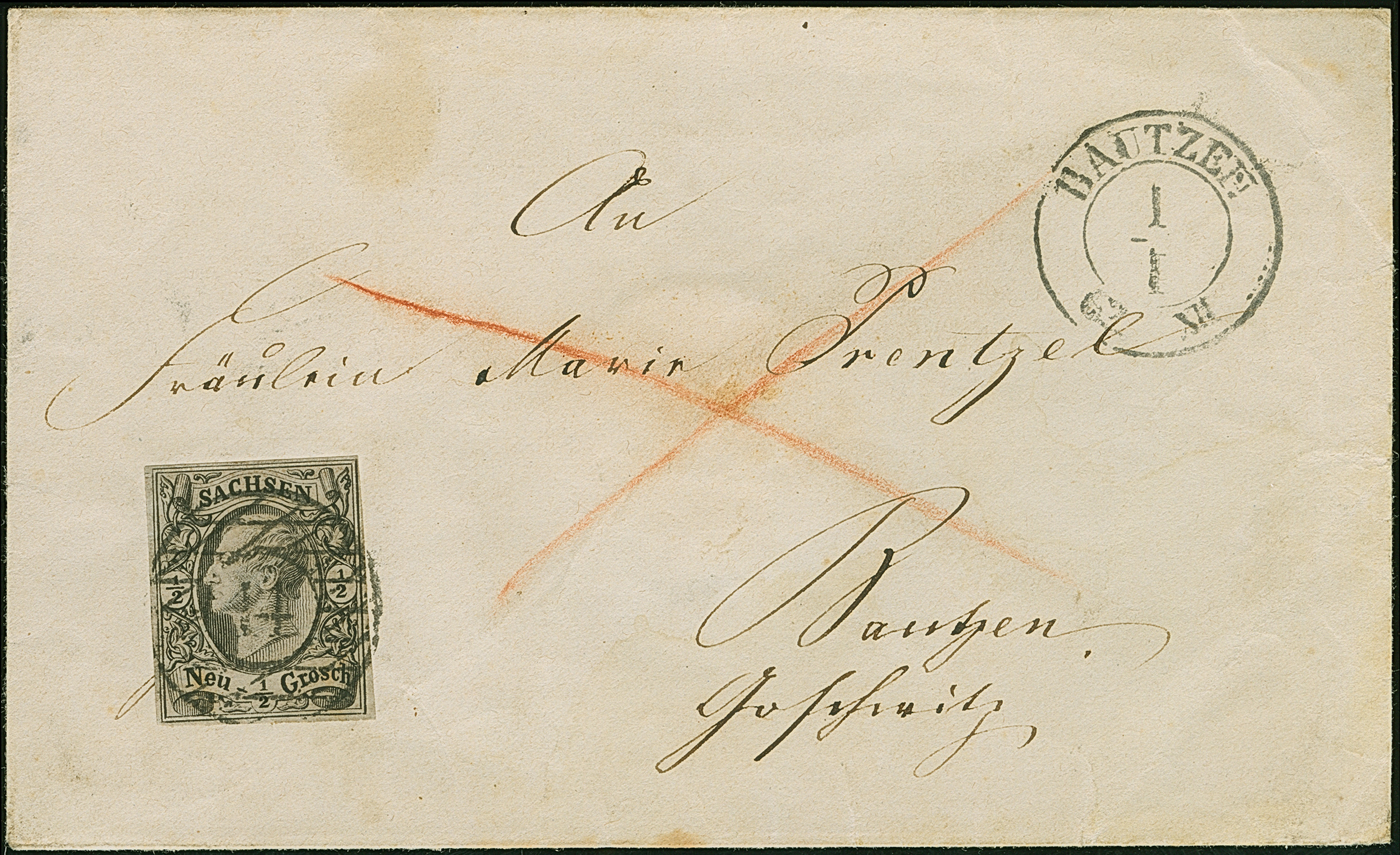 ½ Ngr. auf grau, Type II, voll- bis breitrandig, mit Nr."14" und nebengesetztem Doppelkreisstempel "BAUTZEN 1/1 63" auf kleinem Ortsbrief.