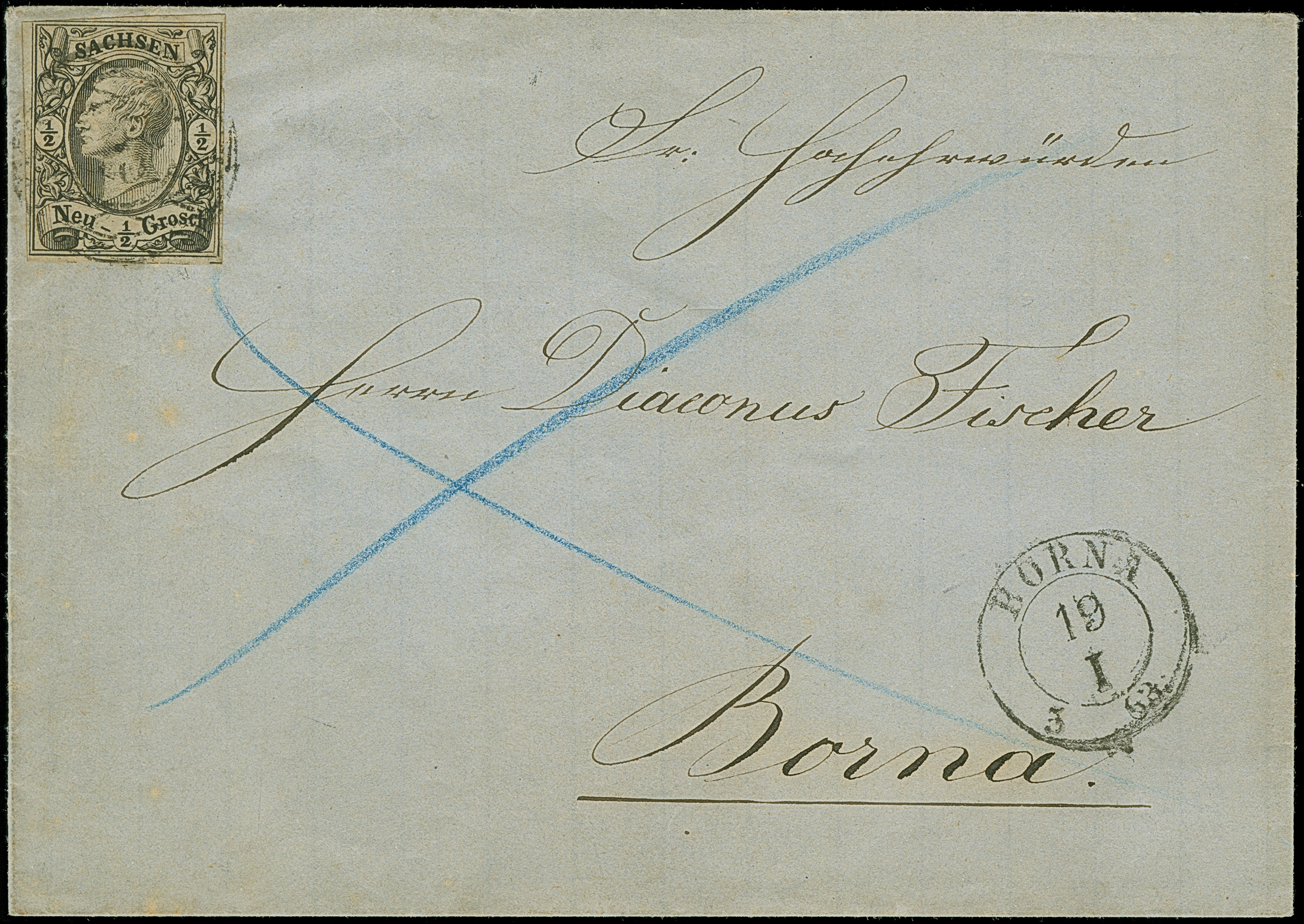 ½ Ngr. auf grau, Type II, teils leicht berührt, mit Nr."16" und nebengesetztem Doppelkreisstempel "BORNA 19/1 63" auf kleinem Ortsbrief.