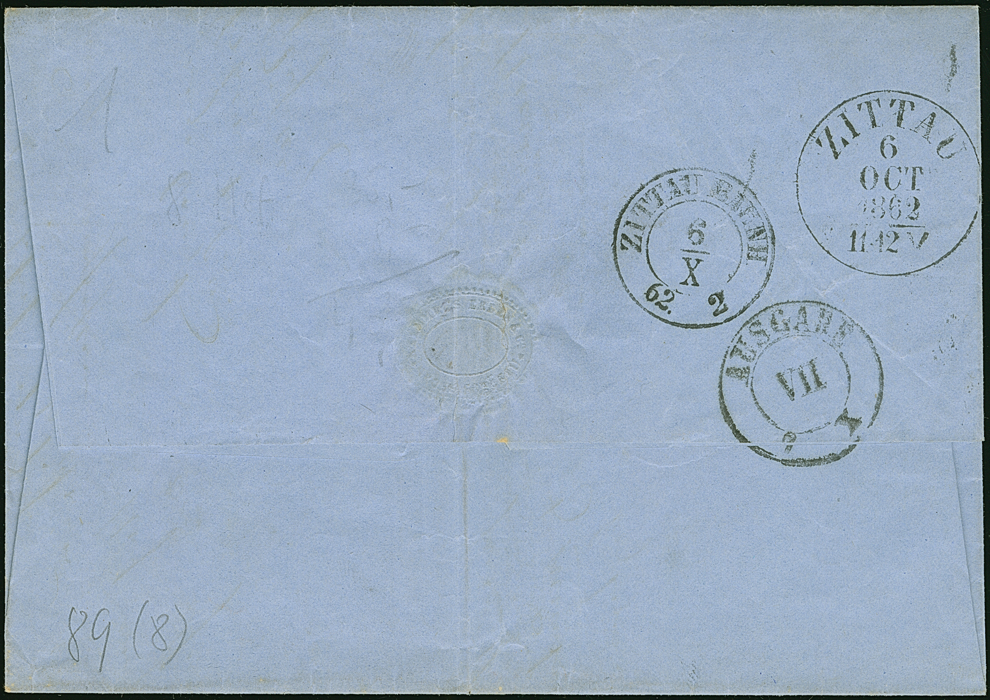 ½ Ngr. auf grau, waagerechtes Paar, voll- bis breitrandig, mit klar aufgesetzter Nr. "89" und nebengesetztem Rahmenstempel "SCHÖNAU 6/X 62" auf Briefhülle nach Leipzig, mit Durchgangstempeln von Zittau. Der Brief fiel in die 2. Gewichtsstufe und wurde mit "1 E.P." (1 Ngr. Ergänzungsporto) belegt. Ein interessanter Brief.