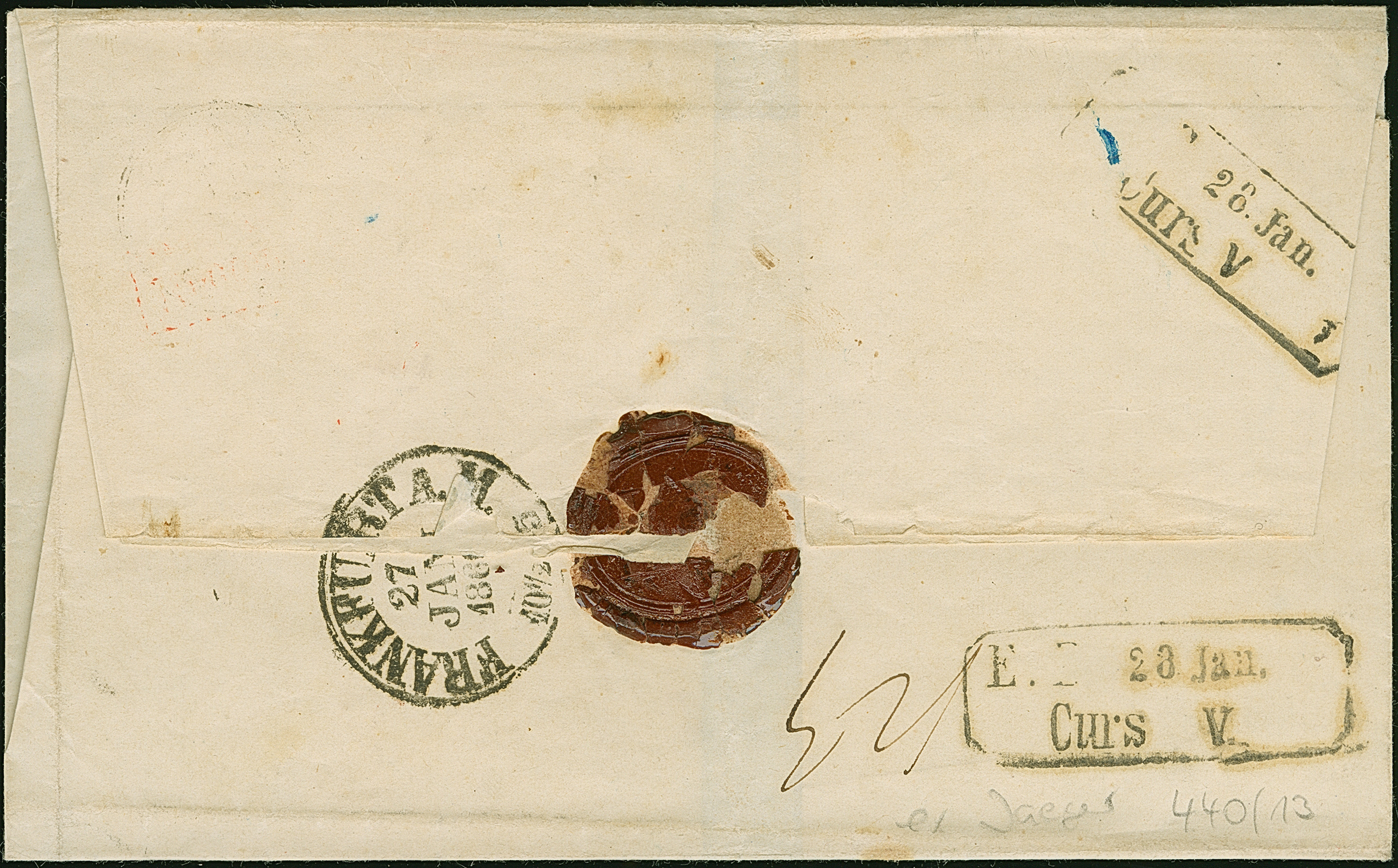 1 Ngr. auf mattgraurot, 5 Einzelwerte, meist voll- bis breitrandig, mit klar aufgesetzter Nr. "2" auf Reco-Briefhülle mit nebengesetztem Doppelkreisstempel "LEIPZIG 27.I.60" und rotem Ra1 "Recomandirt" via Frankfurt nach Schonach bei Triberg in Baden. Vorderseitig blaue Taxe "2" (Kr.) für die Landpost-Bestellung. Die linke untere Marke leichter Briefbug.