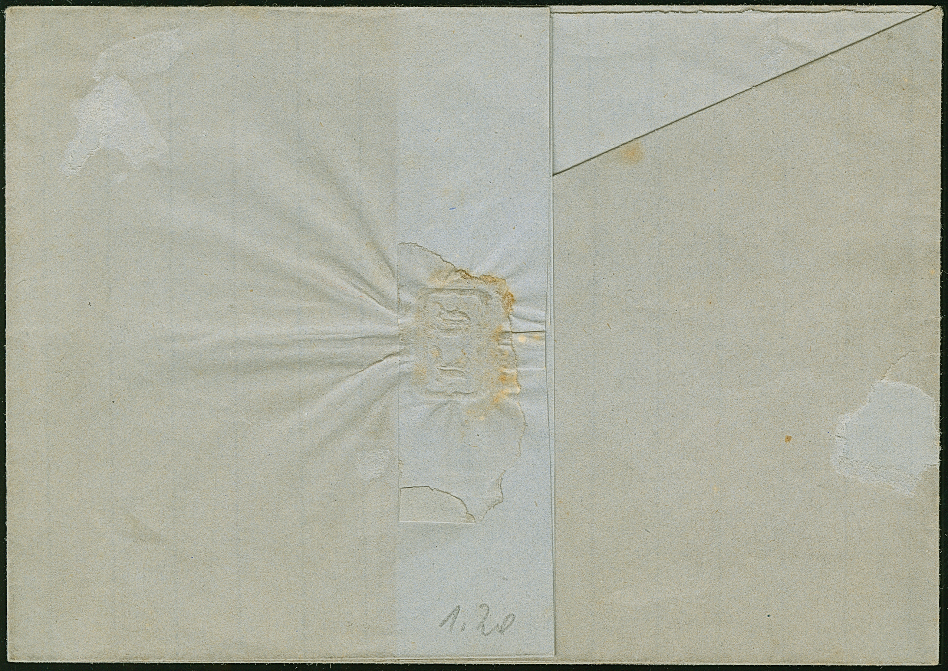 1 Ngr. auf mattgraurot, voll- bis breitrandig, mit Nr. "159" und nebengesetztem Einkreisstempel "OBERWIESENTHAL 30 11 61" auf Briefkuvert mit dekorativer, farblos geprägter Zierborde, nach Meißen. Die Marke wohl durch die prägungsbedingte Knitterspuren im oberen Bereich, sonst schöne Erhaltung.