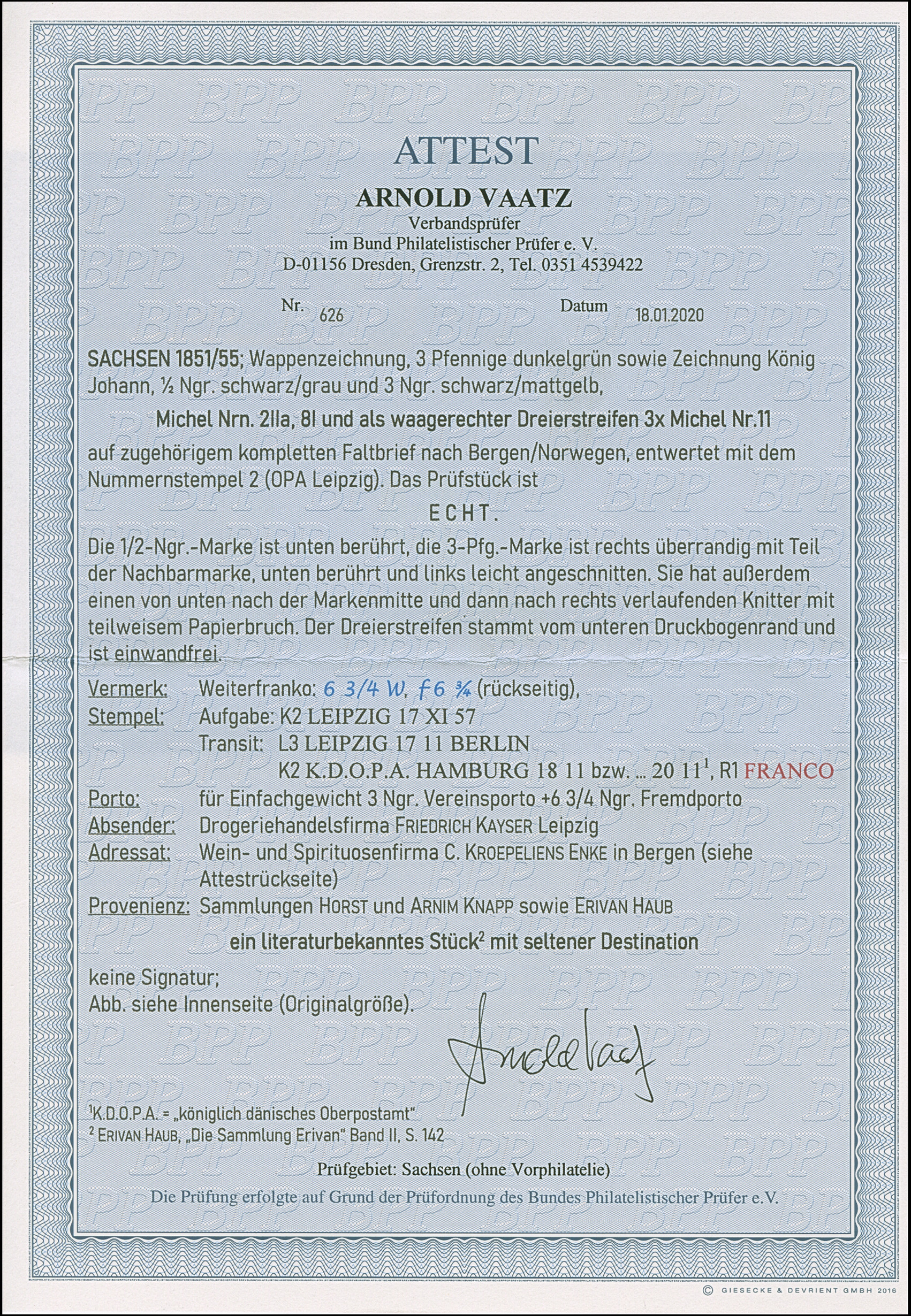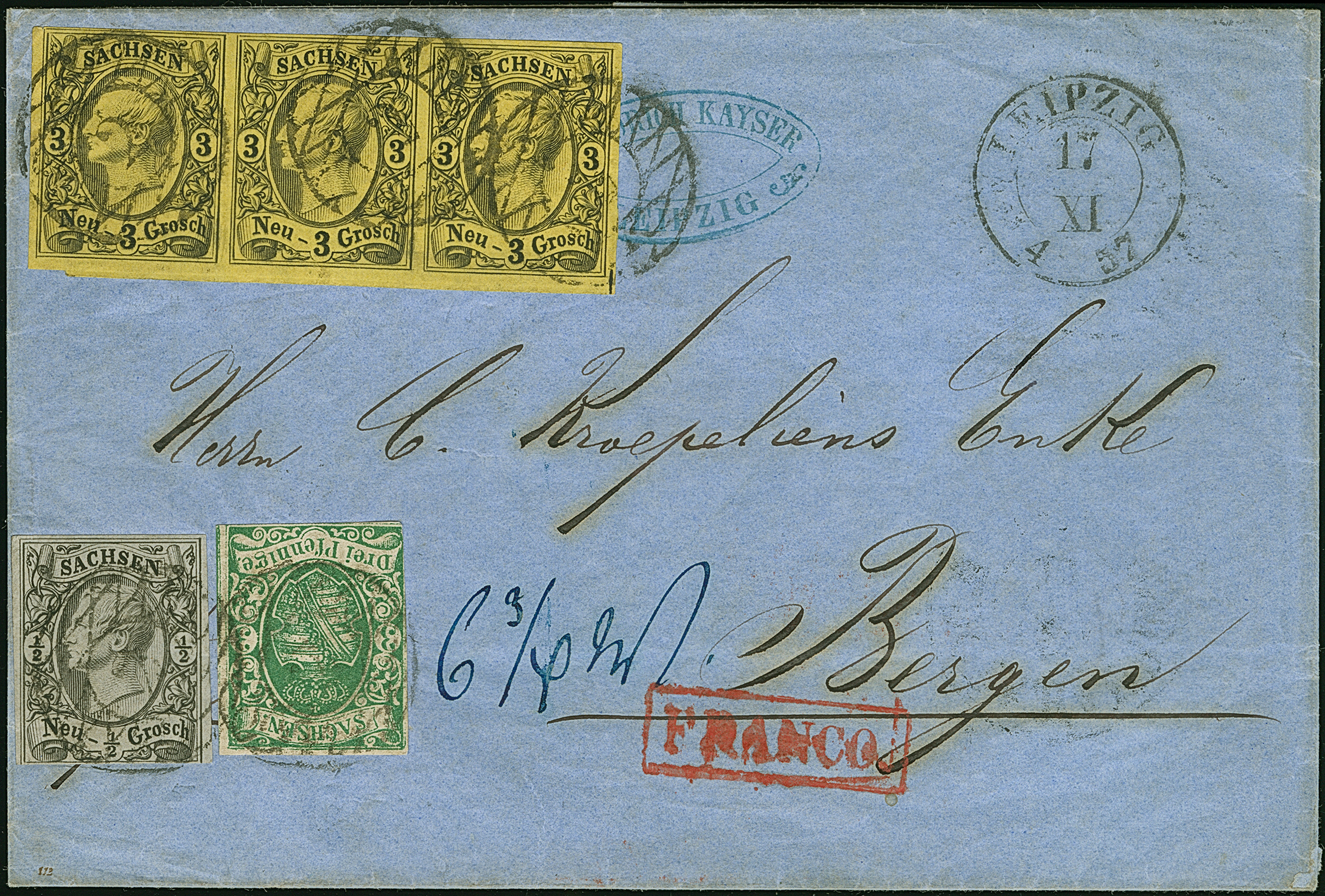 3 Ngr. auf gelb im waagerechten 3er-Streifen, voll- bis überrandig, unten mit breitem Bogenrand, und in leuchtend frischer Farbe, zusammen mit etwas berührter ½ Ngr. auf grau sowie 1851/63, Wappen 3 Pfg. grün (kleiner Knitter mit unmerklichem kleinem Papierbruch), mit Nr. "2" auf komplettem Faltbrief von "LEIPZIG 17 XI 57" nach Bergen, Norwegen, mit Durchgangsstempeln des dänischen Oberpostamtes in Hamburg vom 18. und 20. November. Die Beförderung erfolgte über Dänemark und Schweden; das Porto setzte sich zusammen aus 3 Ngr. Vereinsporto, 2 Ngr. dänischem Transit, 2½ Ngr. schwedischem Transit sowie 2¼ Ngr. norwegischem Porto. Ein besonders attraktiver und mit dieser Frankatur einmaliger 'Winterbrief'.