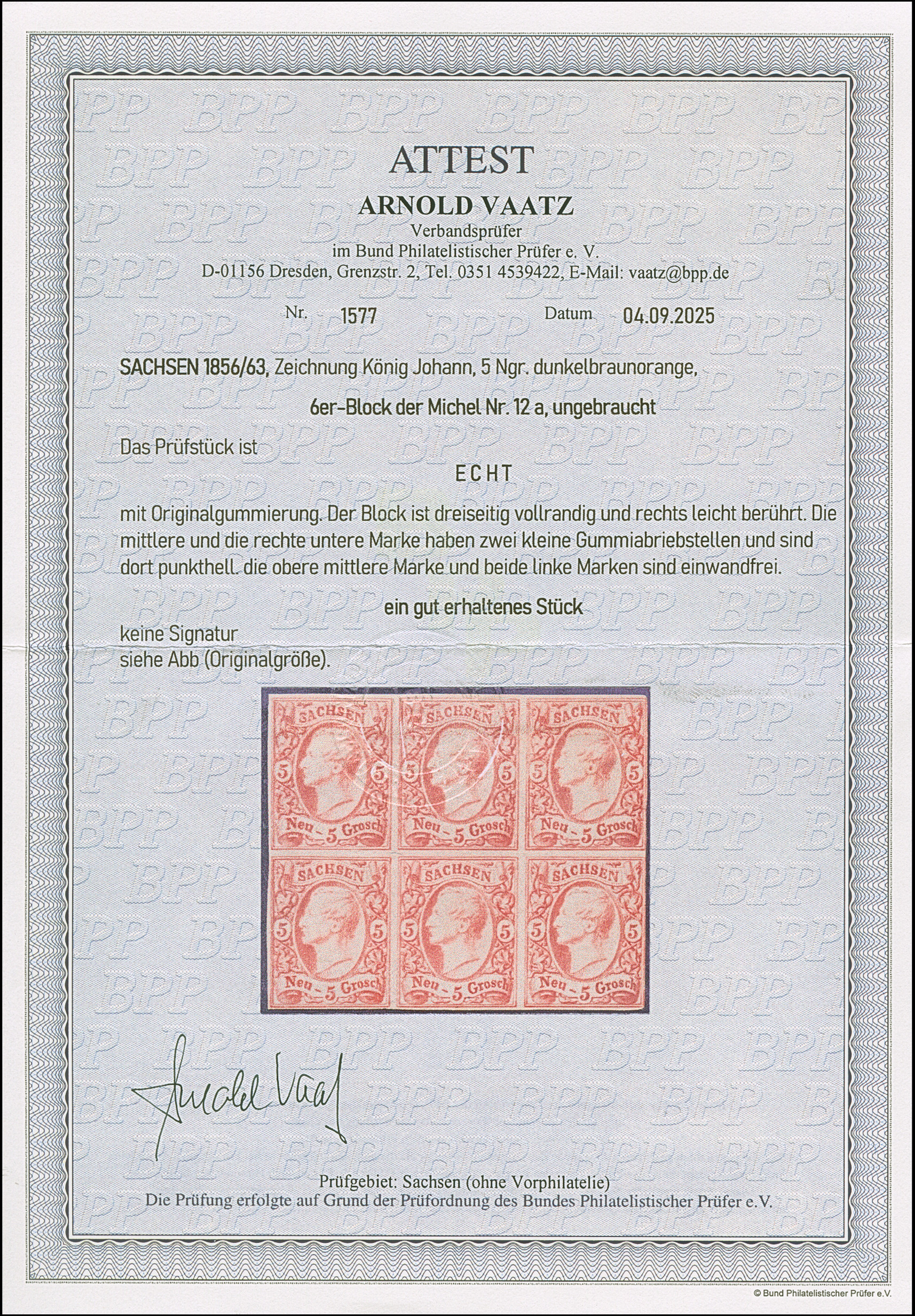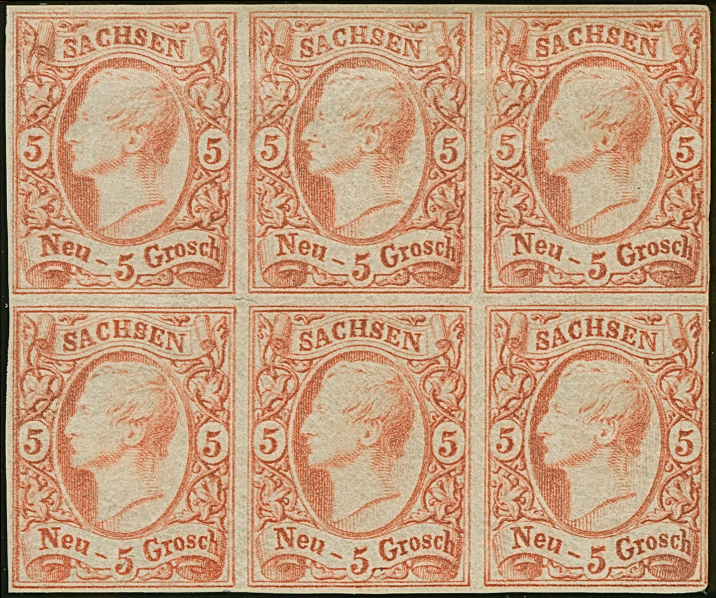 5 Ngr. ziegelrot (orangerot Nuance aus einer frühen Auflage), waagerechter 6er-Block, rechts leicht berührt, sonst voll- bis breitrandig, ungebraucht mit Originalgummi. Schöne und einwandfreie Erhaltung. (zwei im Attest erwähnte "Gummiabriebstellen" sind auch unter VSC nicht feststellbar). Fotoattest Vaatz BPP (2025)