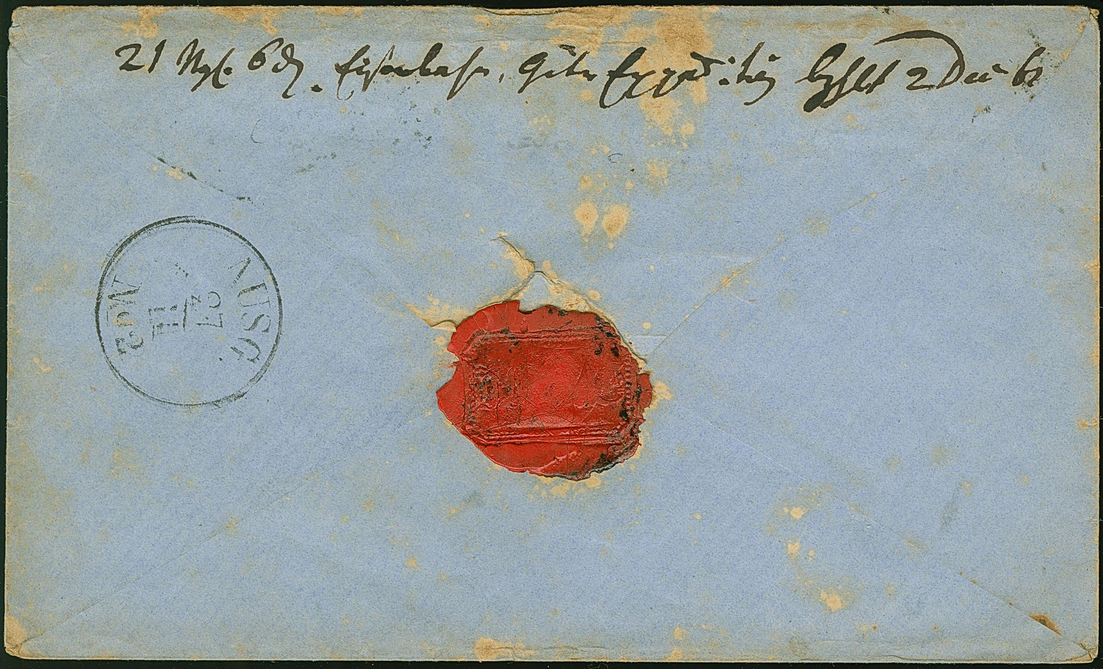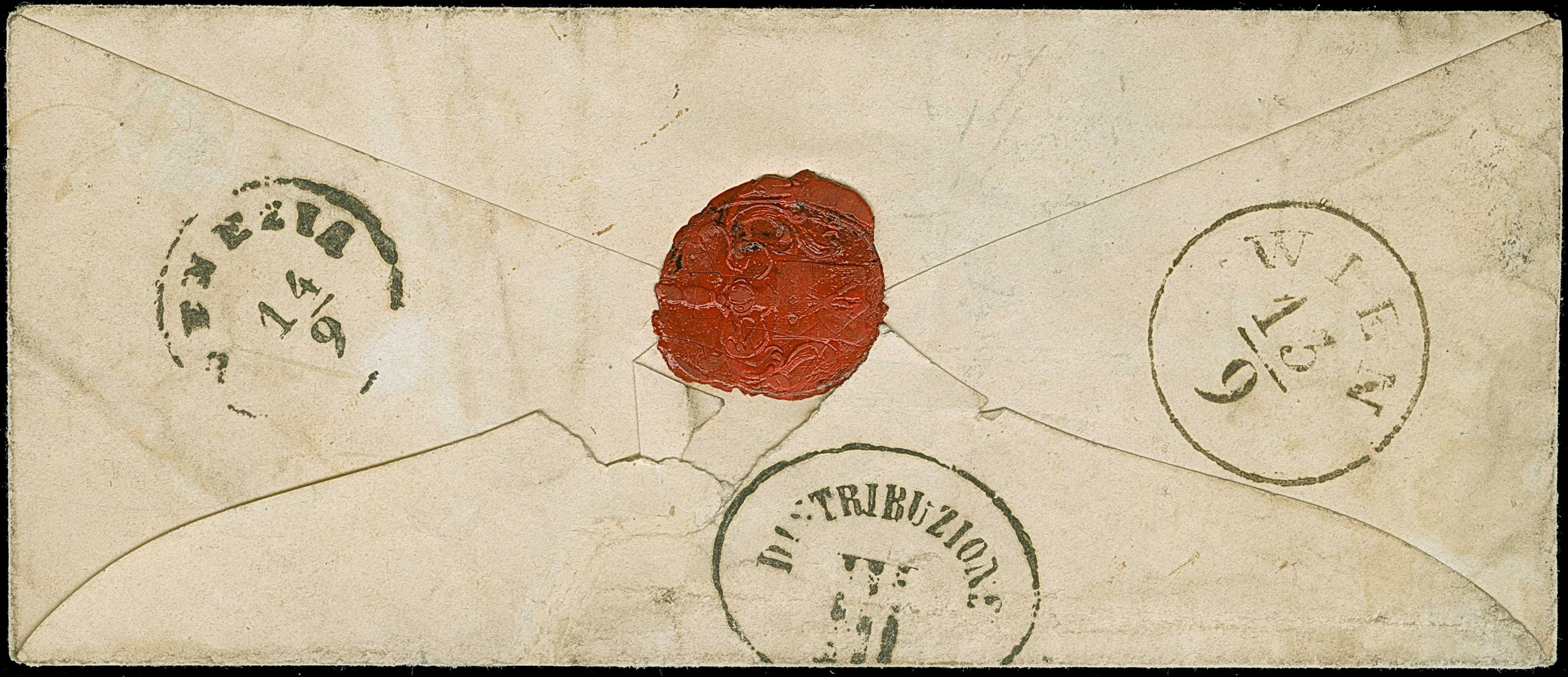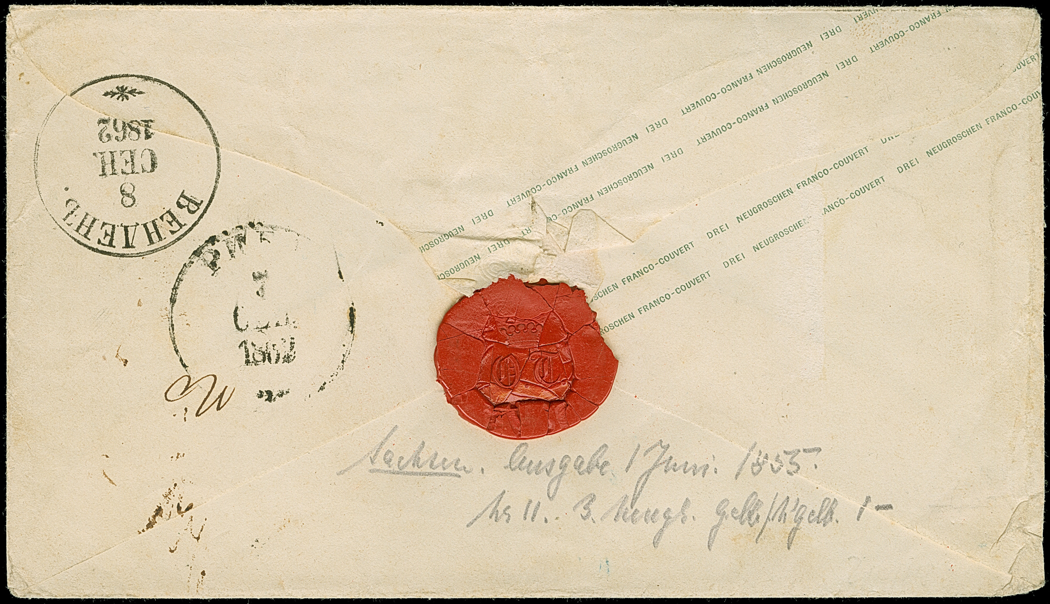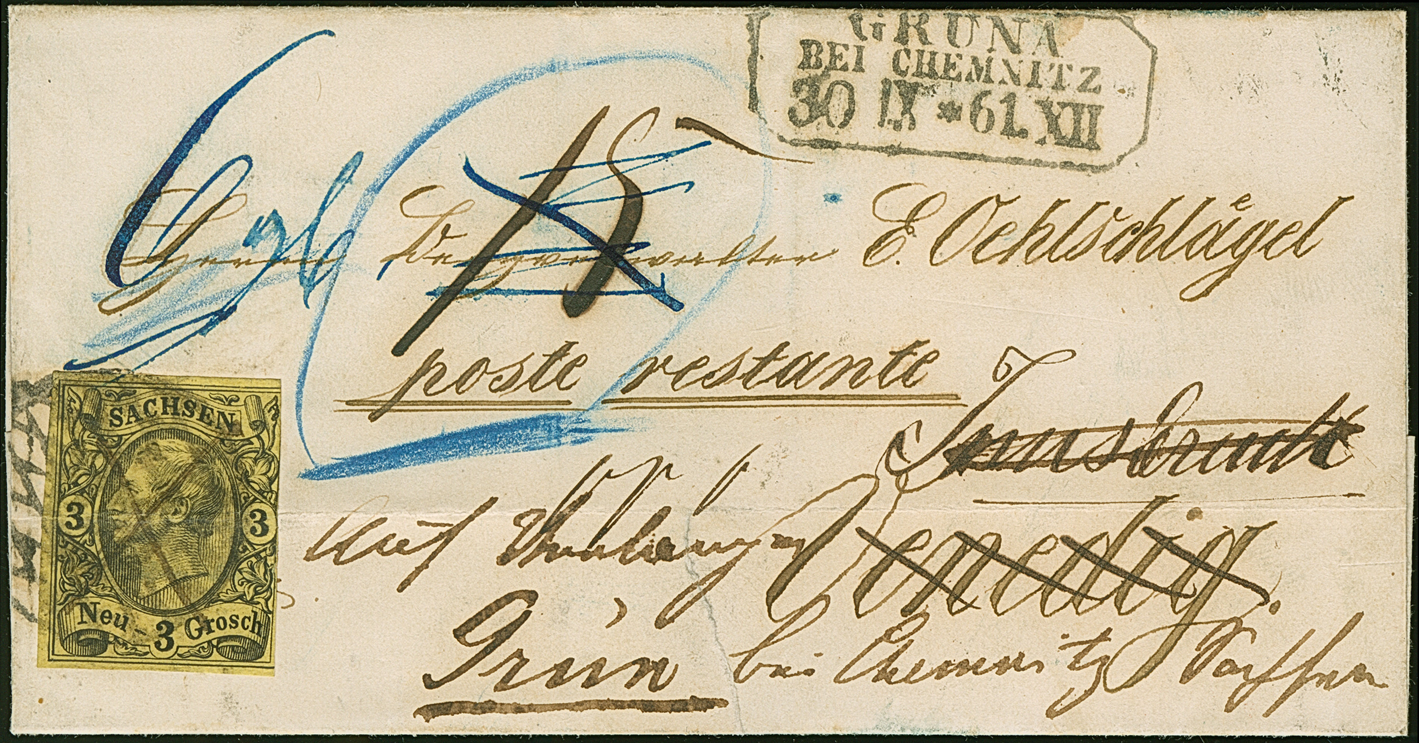 3 Ngr. auf gelb, mit Nr. "119" und Federkreuz, mit sauber nebengesetztem Ra3 "GRÜNA BEI CHEMNITZ 30 IX 61" auf kleiner Briefhülle nach Venedig, poste restante, und von hier nachgesandt nach Innsbruck, dafür von der österreichischen Post "15" Kreuzer taxiert. Offensichtlich wurde der Brief nicht abgeholt und zurückgesandt nach Grüna, hier insgesamt belastet mit "6" Ngr.Durch die Marke verläuft ein nicht störender waagrechter Briefbug. Ein interessanter und in dieser Form seltener Beleg im Wechselverkehr mit Österreich.