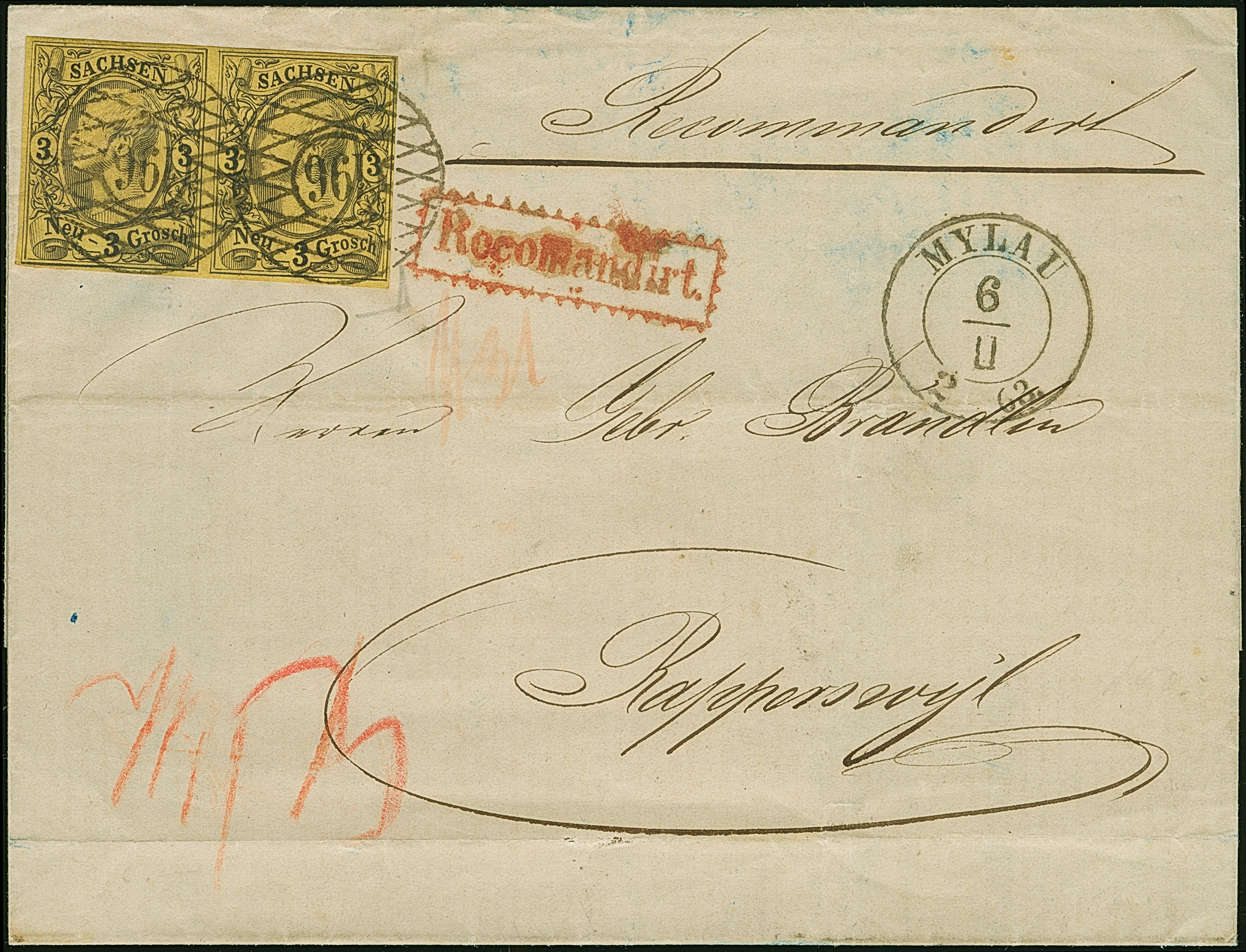 3 Ngr. auf gelb im waagerechte Paar, voll- bis breitrandig und farbfrisch mit klarer Nummer "196" auf rekommandierter Briefhülle von "MYLAU 6/II 63" nach Rapperswil im 1.Schweizer Rayon. Briefbüge außerhalb der Frankatur, sonst sehr frische Erhaltung.