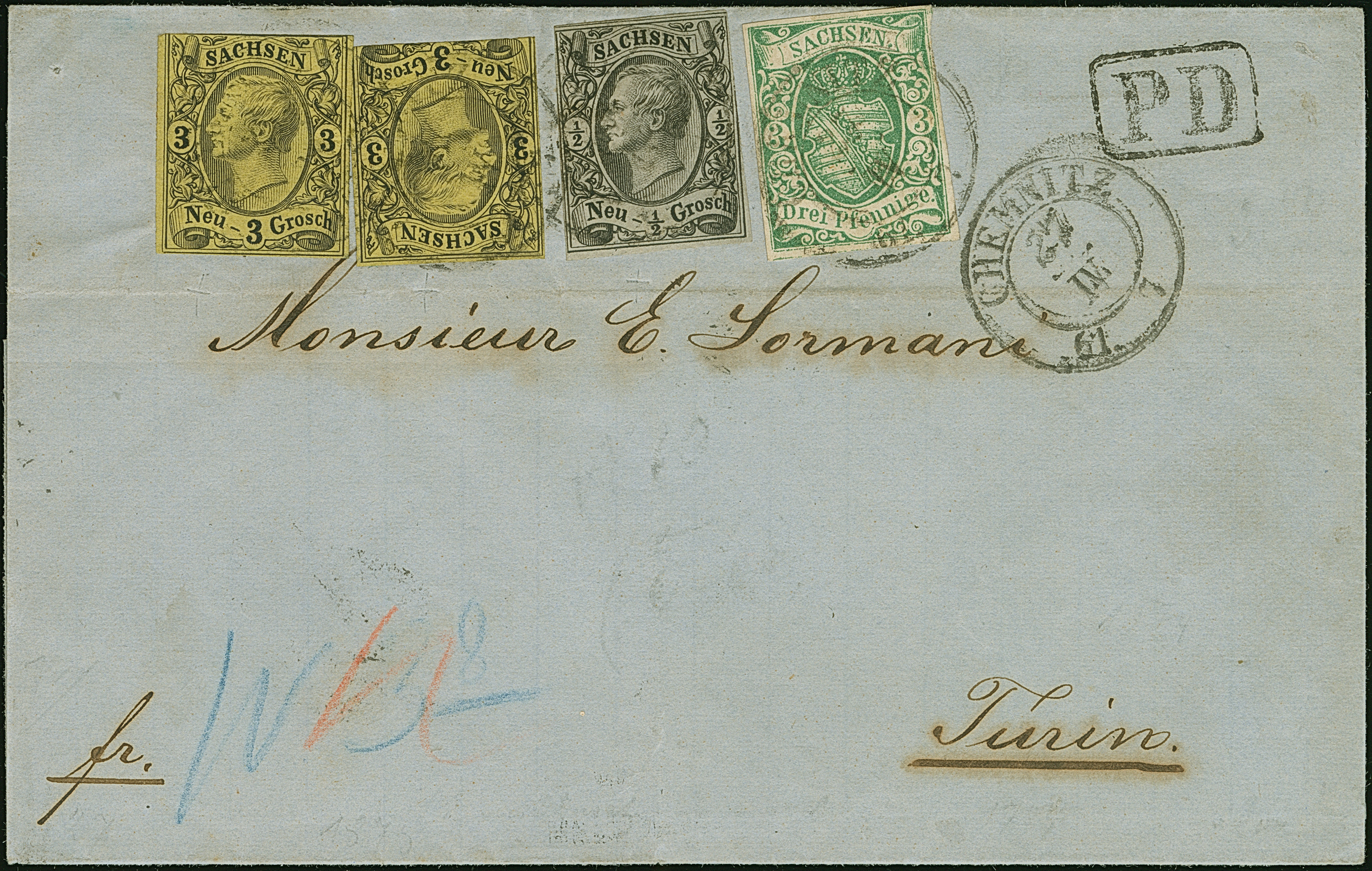 3 Ngr. auf gelb, 2 Einzelwerte, mit ½ Ngr. auf grau und 1851/63, 3 Pfg. grün, letztere voll-bis breitrandig, mit Doppelkreisstempel "CHEMNITZ 27/IV 61" auf Briefhülle über Chur und Verbano nach Turin, Königreich Italien. Der Brief ist portogerecht frankiert mit 3 Ngr. Vereinsporto, 2 Ngr. Schweizer Transit und 1 8/10 Ngr. italienischem Porto. 3 Werte unauffällige diagonale Bugspur, sonst gute Erhaltung.