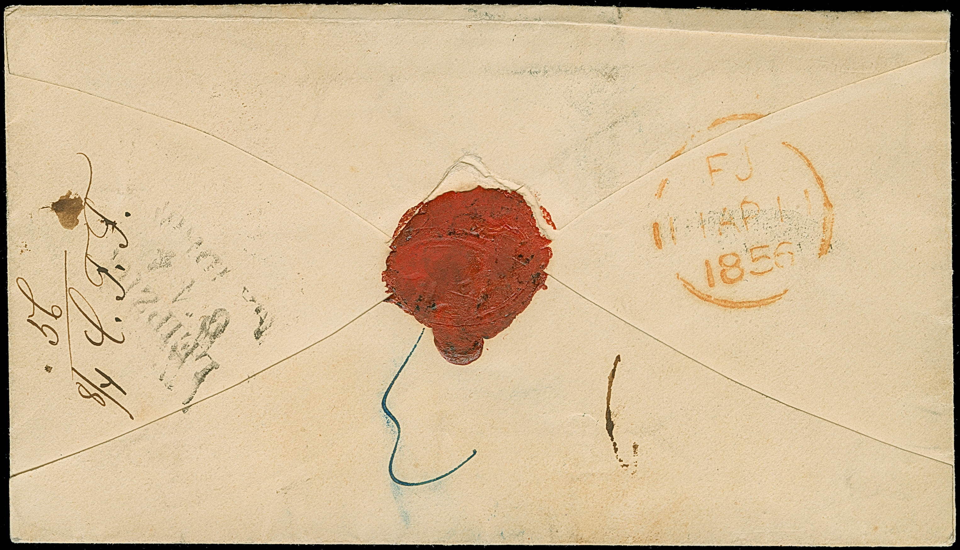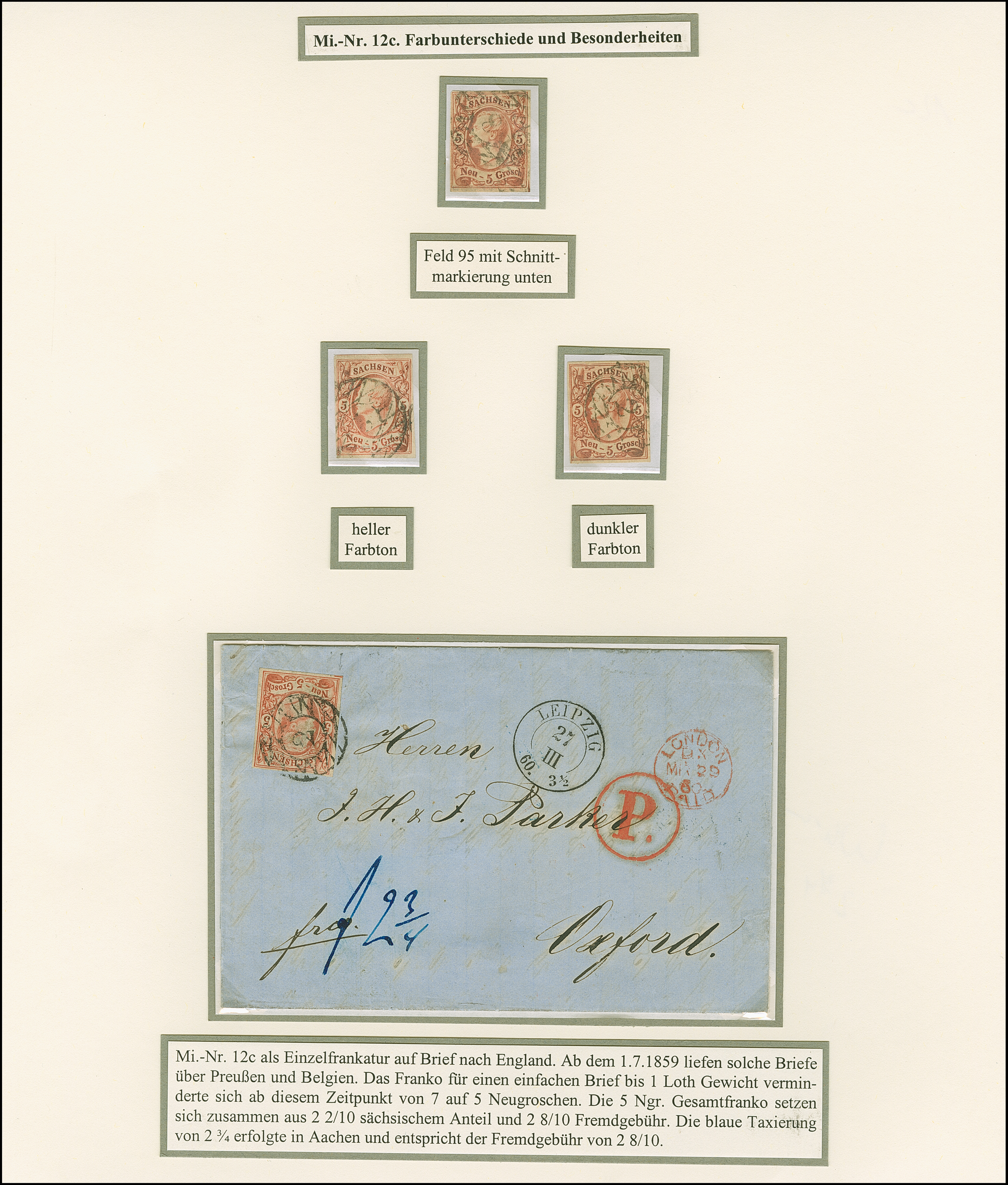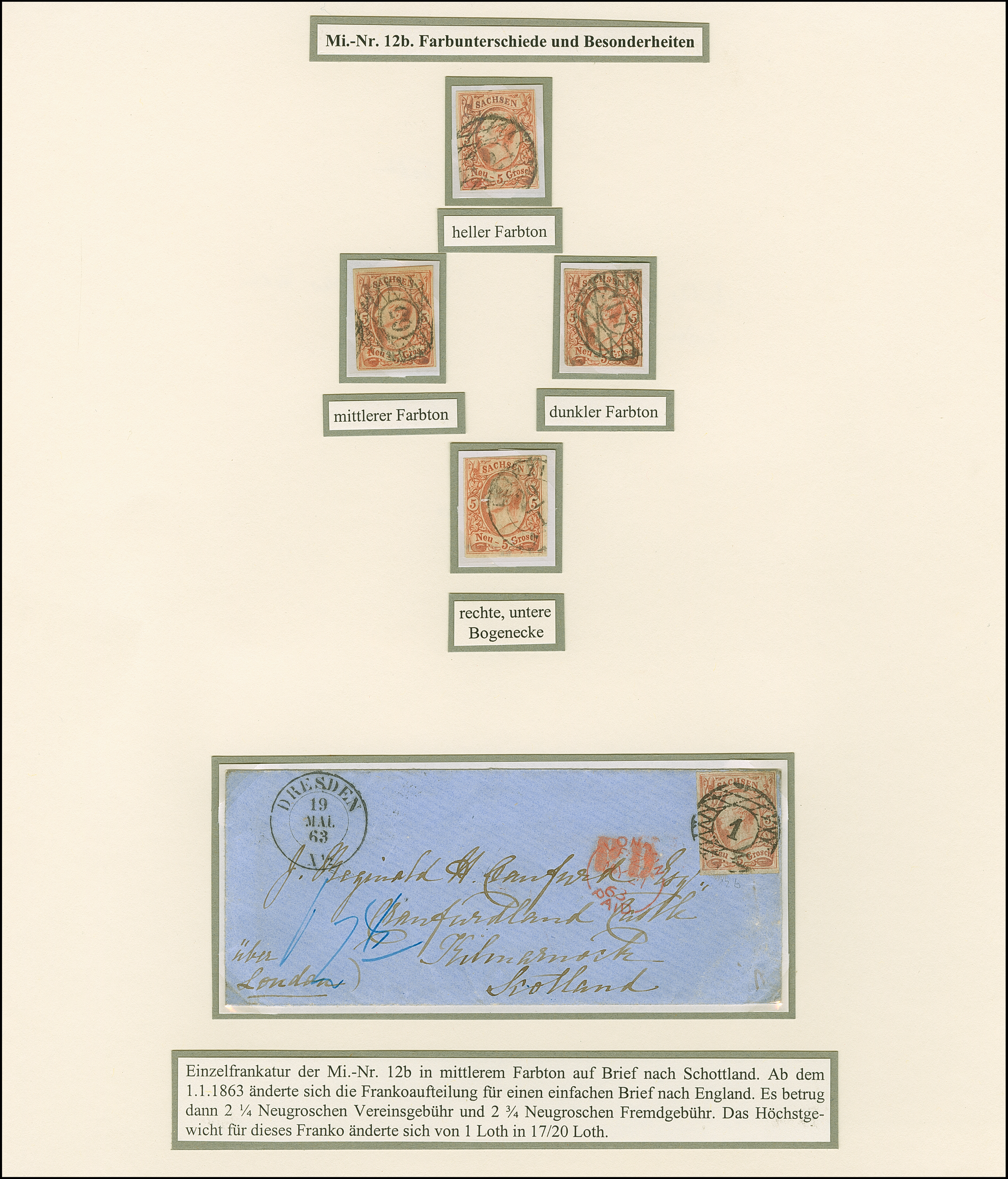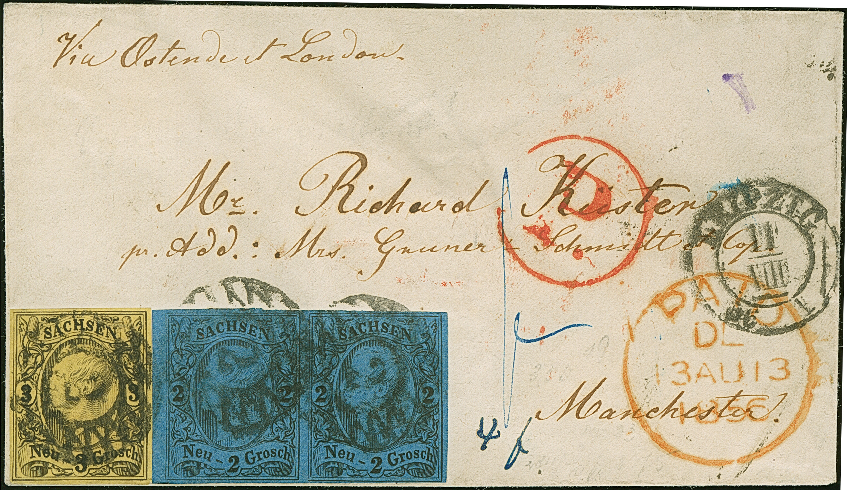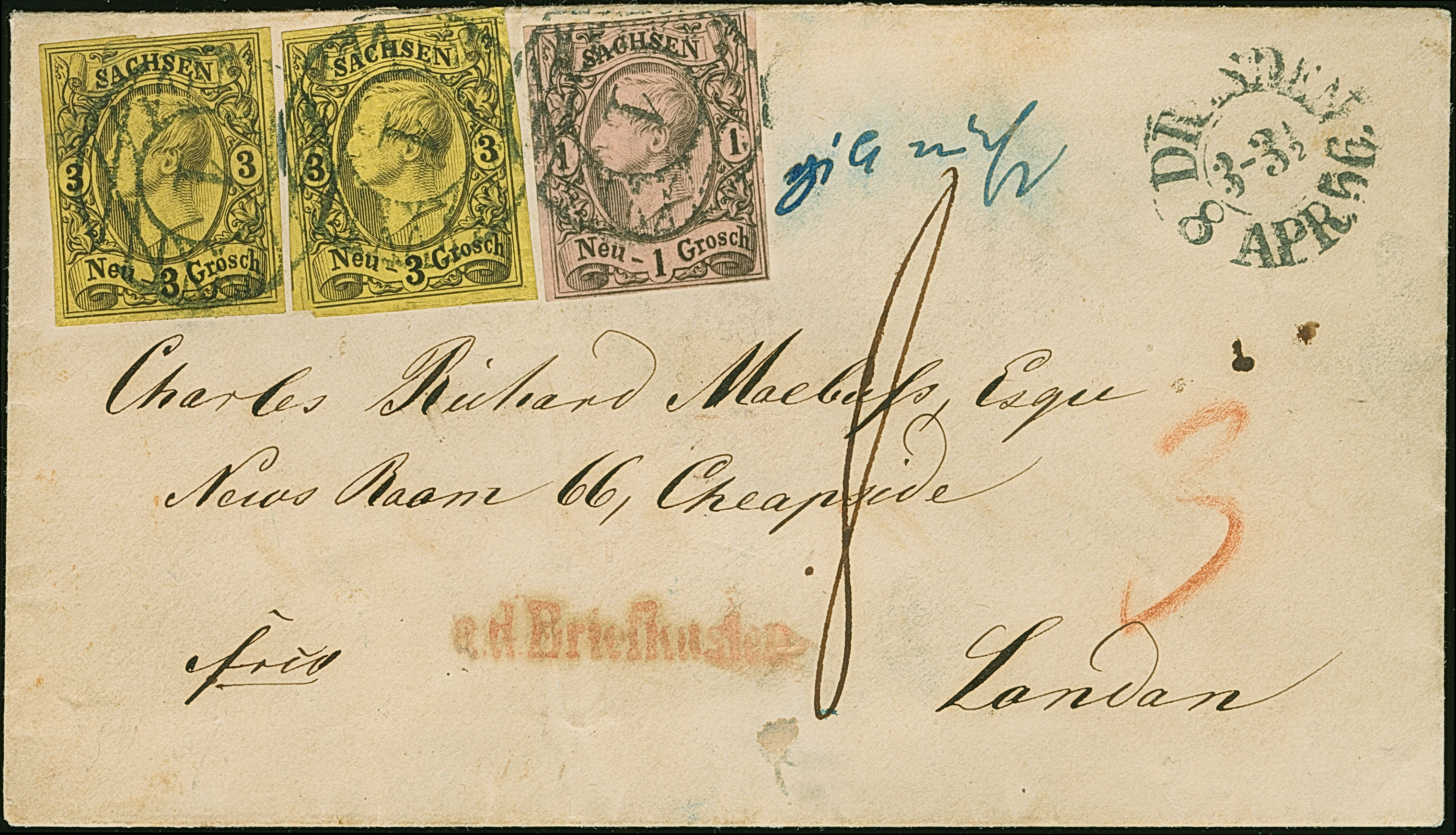 3 Ngr. auf gelb, 2 Einzelwerte, mit 1 Ngr. auf graurot, letztere oben berührt und kleiner Eckbug, sonst alle voll-bis breitrandig, mit Nr. 1 und sauber nebengesetztem Doppelkreisstempel "DRESDEN 8 APR 56" auf kleinem Briefkuvert mit nebengesetztem roten "a.d.Briefkasten" nach London. Die Frankierung von Auslandsbriefen war in Sachsen erst ab dem 1. Mai 1856 gestattet, entsprechender Vermerk neben den Marken "gilt nicht" und in England wie ein unfrankierter Brief mit "8" Pence taxiert. Ein postgeschichtlich hochinteressanter und äußerst seltener Brief, der früheste ‘frankierte’ Auslandsbrief der Johann-Ausgabe, dazu noch sehr attraktiv.