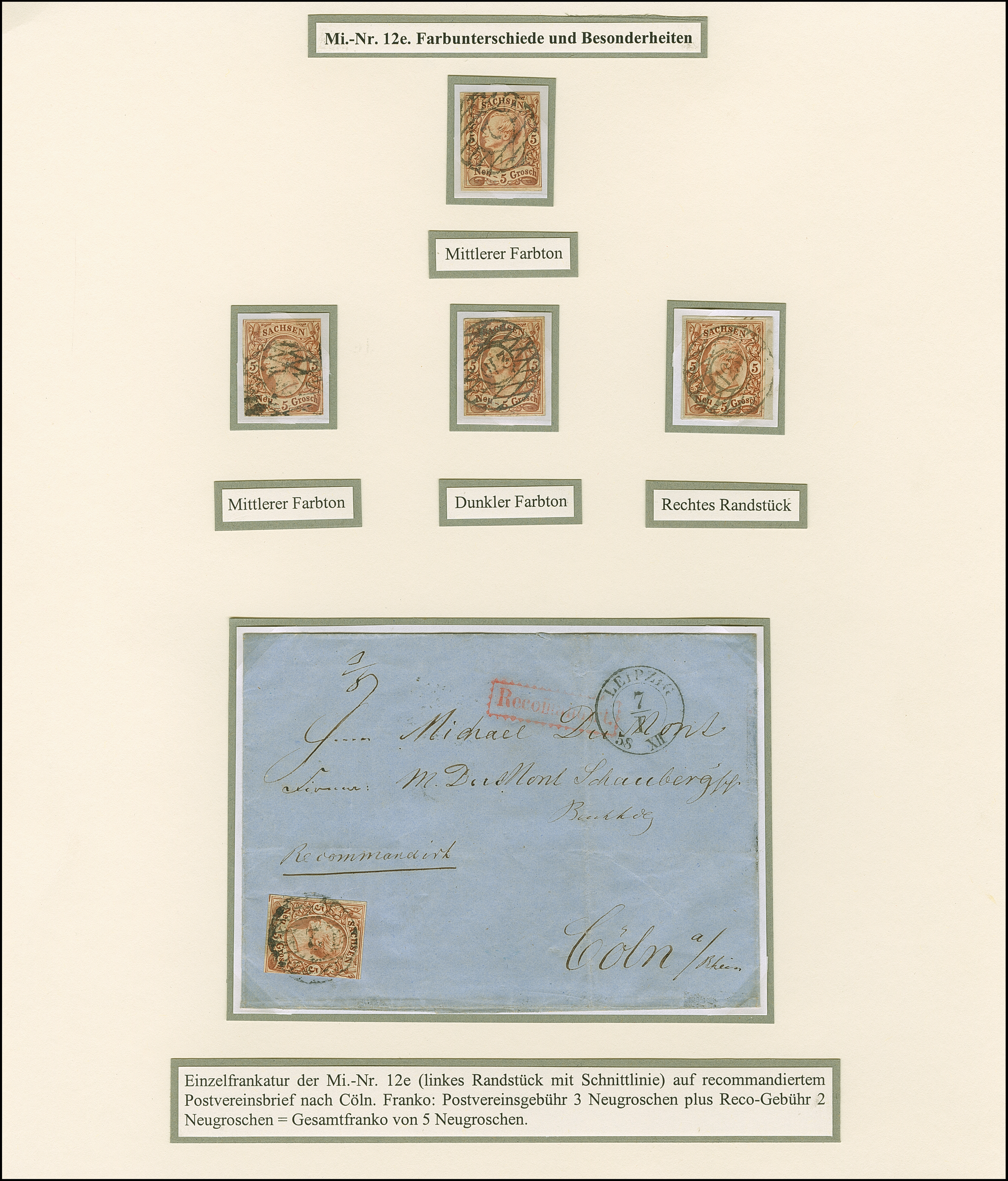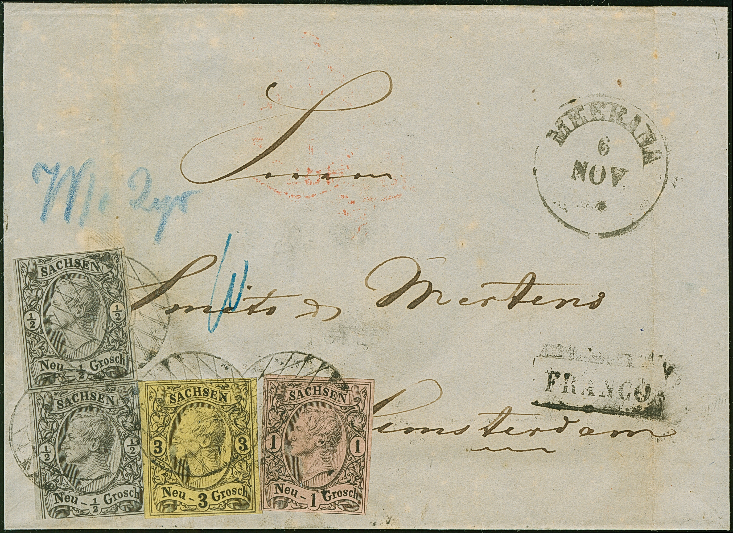 3 Ngr. auf gelb, voll- bis breitrandig, mit teils berührten 1 Ngr. auf mattgraurot und 2 Einzelwerten ½ Ngr. auf grau, mit Nr. "53" und nebengesetztem Einkreisstempel "MEERANE 6 NOV." (1860) auf Briefhülle nach Amsterdam. Durch die zwei ½ Ngr. verläuft ein senkrechter Briefbug, sonst gute Erhaltung. Eine einmalige Darstellung des 5 Ngr.-Portos.