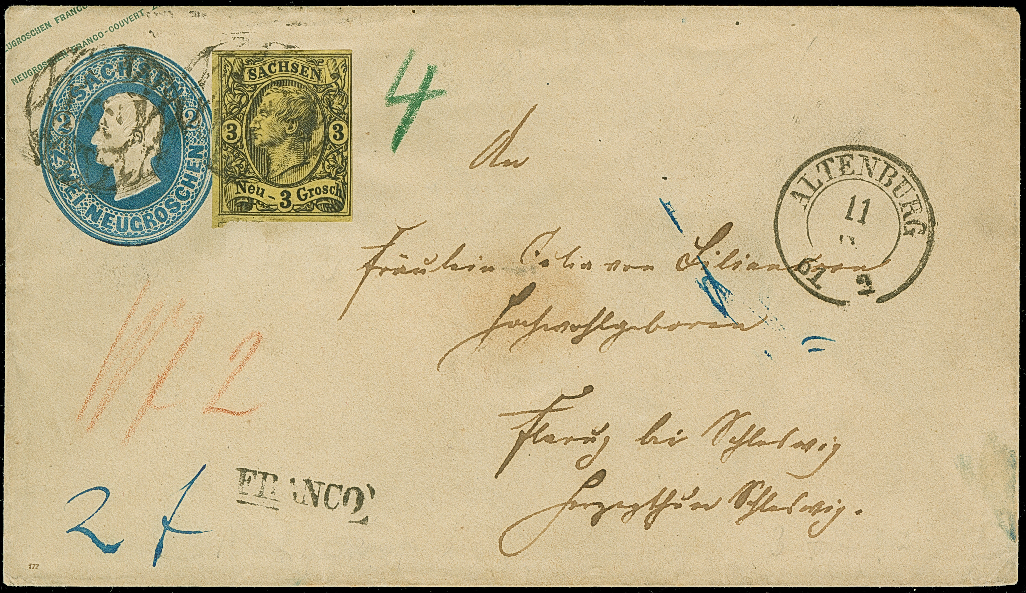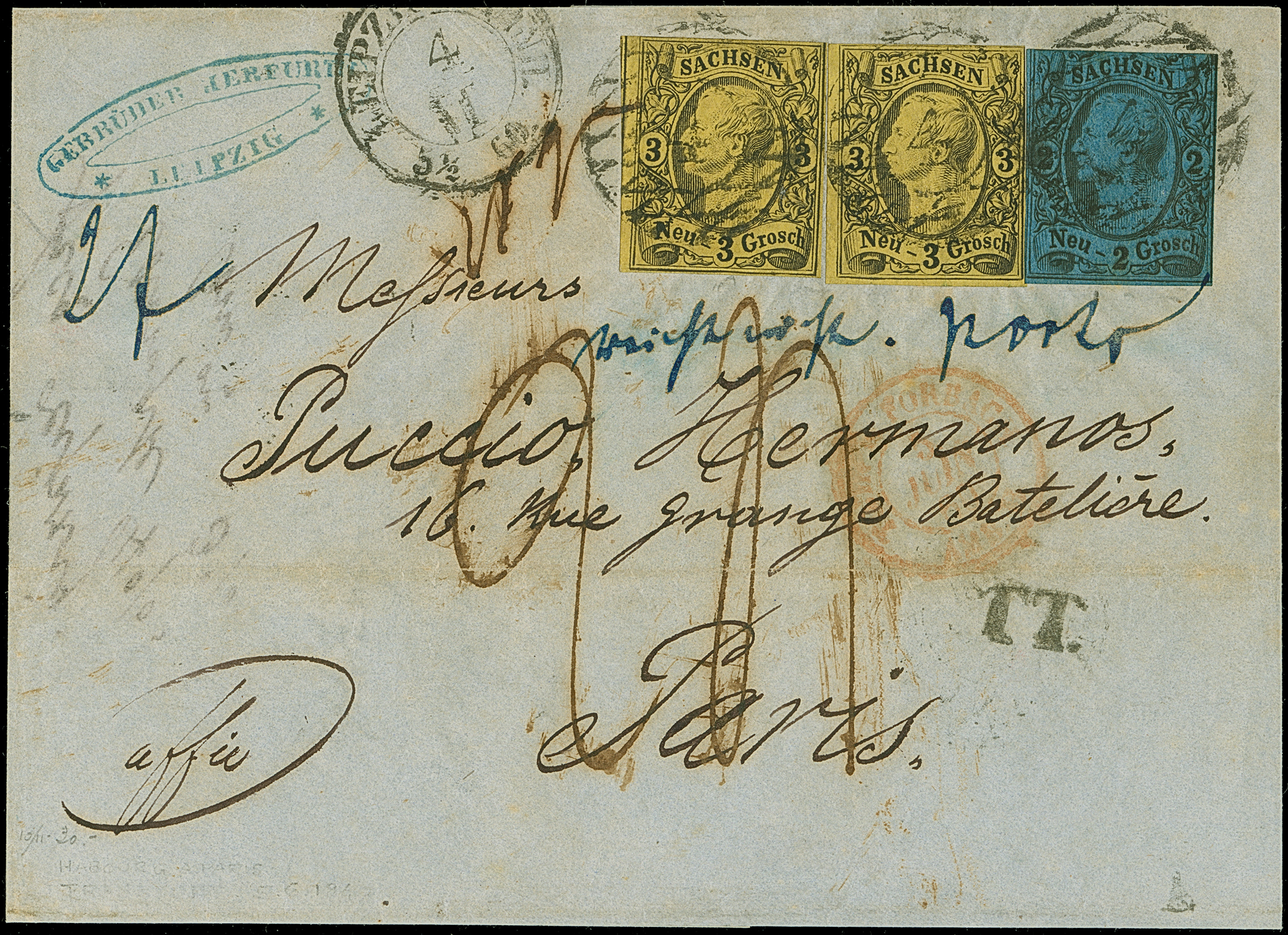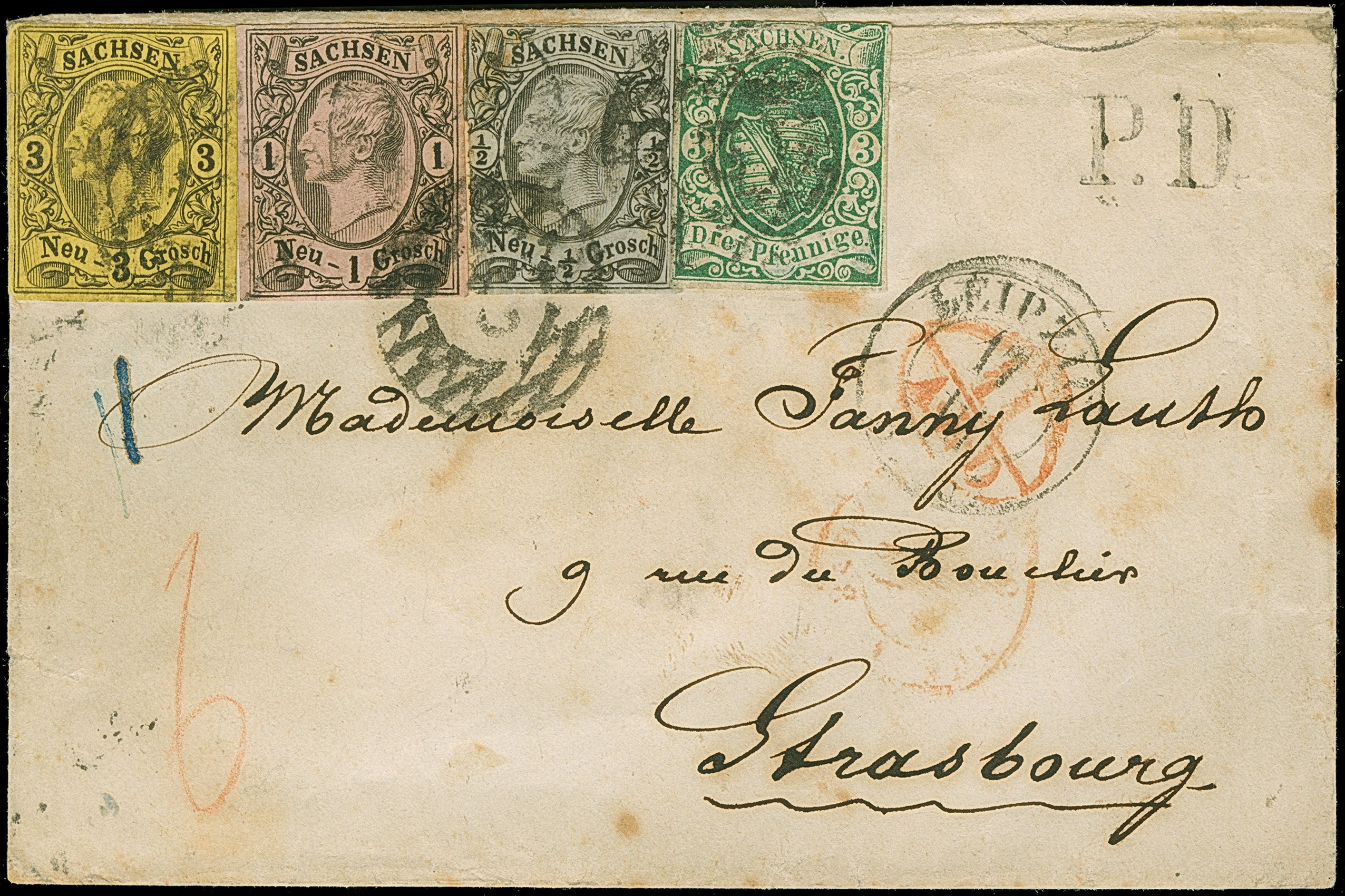 3 Ngr. auf gelb, 1 Ngr. auf mattgraurot, ½ Ngr. auf grau und 1851/63, 3 Pfg. grün, mit Nr. "2" und nebengesetztem Doppelkreisstempel "LEIPZIG 17 III.." auf kleinem Briefkuvert über Baden nach Straßburg, korrekt frankiert mit 3 Ngr. Vereinsporto und 1 8/10 Ngr. französischem Porto. Die Frankatur teils berührt, 3 Pfg. am Oberrand etwas fehlerhaft. Eine attraktive und sehr seltene 4-Farben-Frankatur; PROFI hat nach Frankreich keine weitere solche registriert.