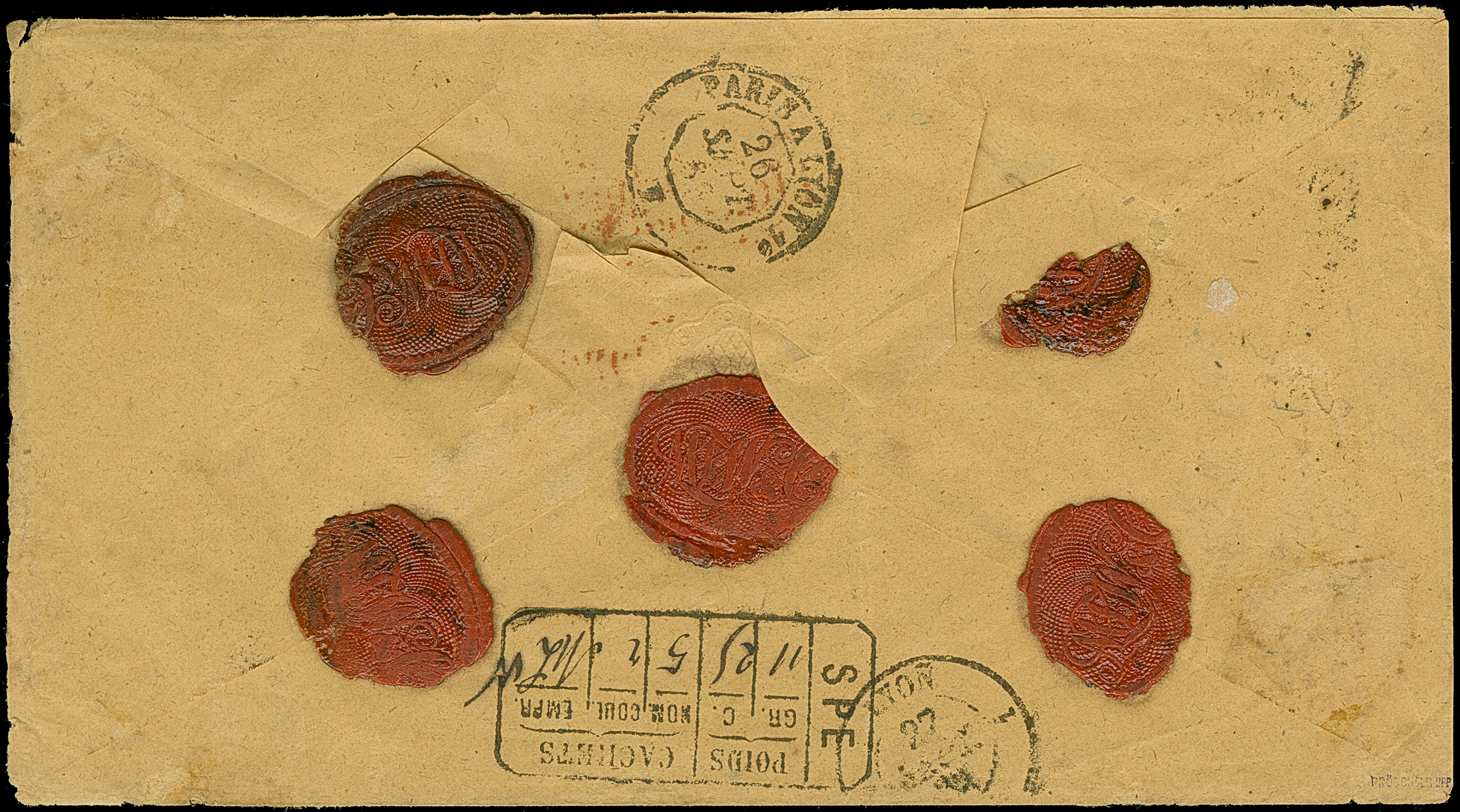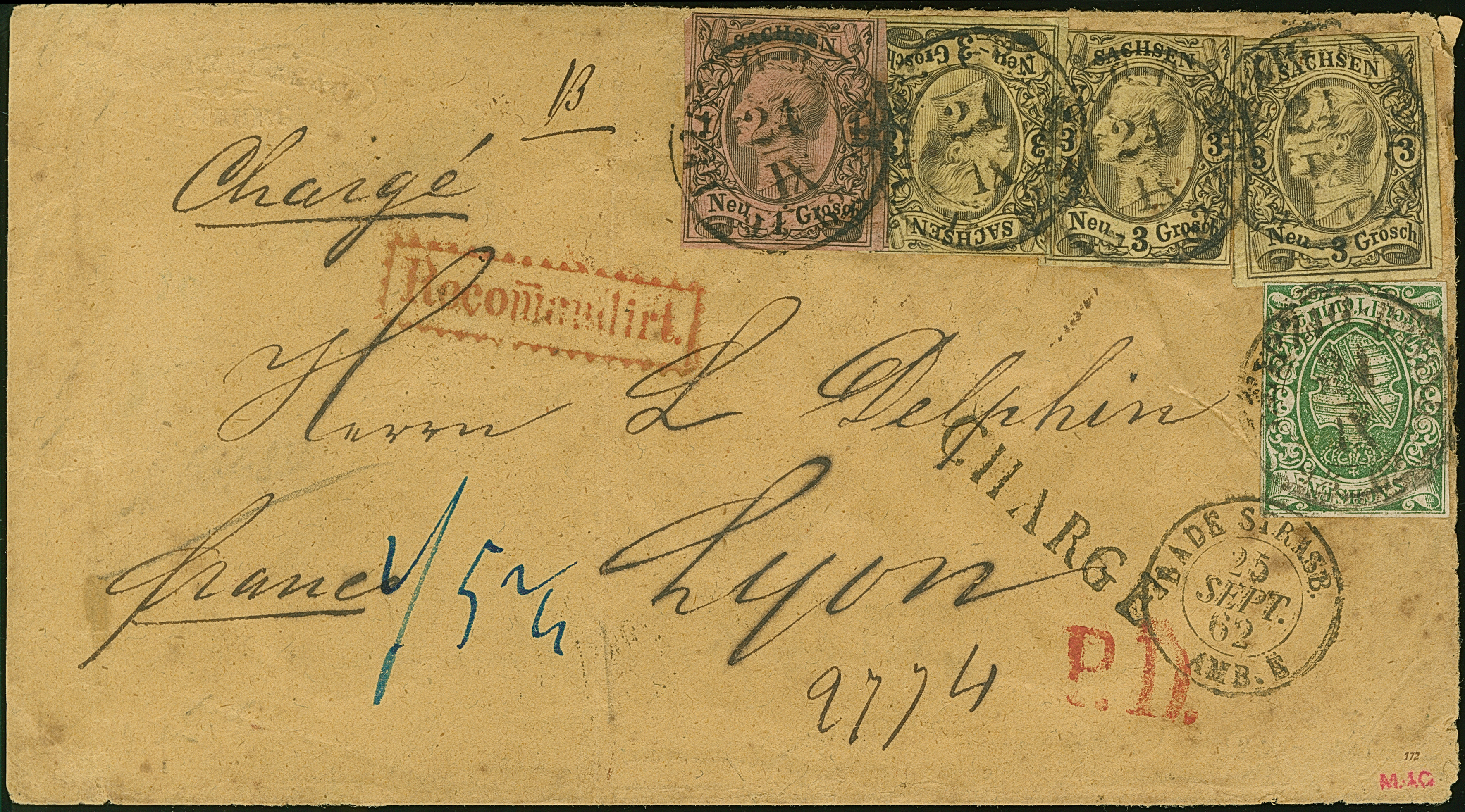 3 Ngr. auf gelb, 3 Einzelwerte, mit 1 Ngr. auf mattgraurot und 1851/63, 3 Pfg. grün, mit Doppelkreisstempel "LEIPZIG 24/IX 62" auf dreiseitig geöffnetem, recommandirtem Briefkuvert der 2. französischen Gewichtsstufe über Baden nach Lyon, korrekt frankiert mit 3 Ngr. Vereinsporto, 2 Ngr. Reco-Gebühr sowie 18 Kreuzer (gleich 5 2/10 Ngr.) französischem Porto. Die Frankatur teils leicht berührt, das Kuvert kleine Beförderungspuren. Eine in dieser Form einmalige Frankaturkombination nach Frankreich.