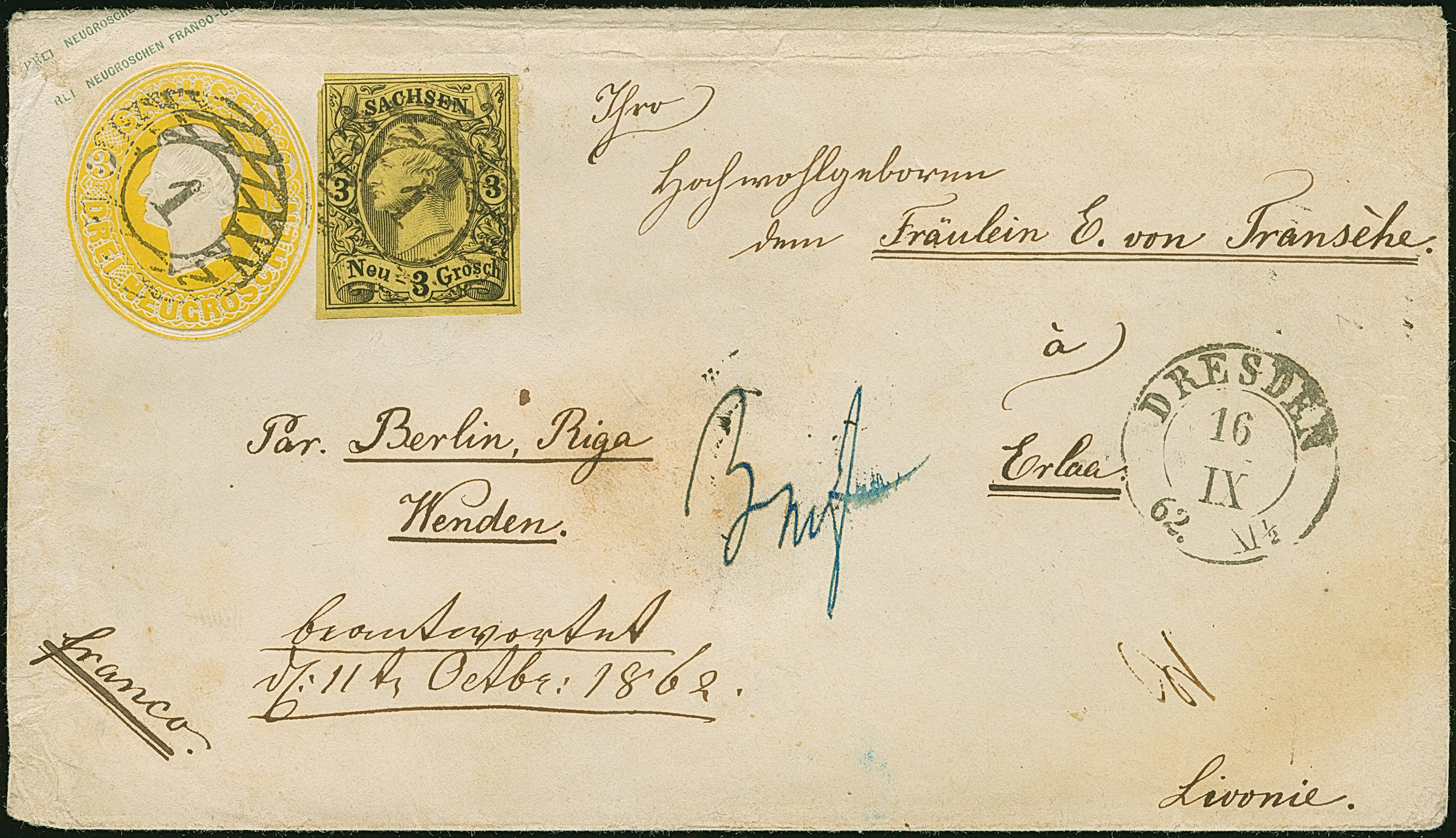 3 Ngr. auf gelb, oben gering berührt, sonst voll- bis breitrandig, als Zufrankatur auf Ganzsachenumschlag 3 Ngr. gelb, mit Nr. "1" und sauber nebengesetztem Doppelkreisstempel "DRESDEN 16/IX 62", mit Leitvermerk "Par. Berlin, Riga, Wenden", nach Erlaa in Livland, Russland.