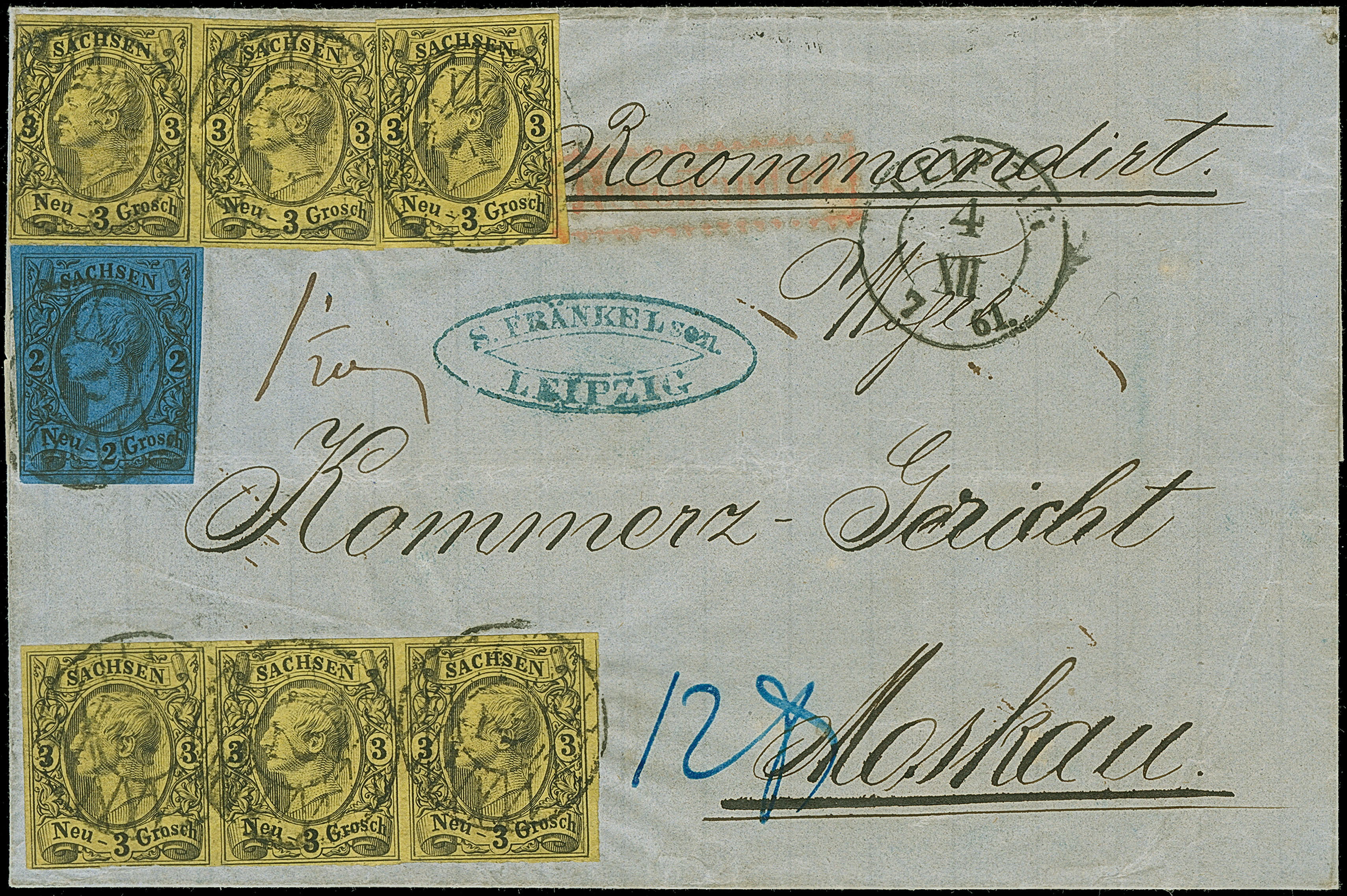 3 Ngr. auf gelb, waagerechter 3er-Streifen, Paar und Einzelstück, zusammen mit 2 Ngr. auf blau, mit Nr. "2" und sauber nebengesetztem Doppelkreisstempel "LEIPZIG 4/XII 61" auf eingeschriebener Briefhülle der 2. Gewichtsstufe nach Moskau. Die Frankatur leicht berührt bis breitrandig, die 2 Ngr. unauffälliger waagerechter Briefbug. Die größte bekannte Frankatur der 3 Ngr.-Marke und der wohl spektakulärste Sachsen-Brief nach Russland.