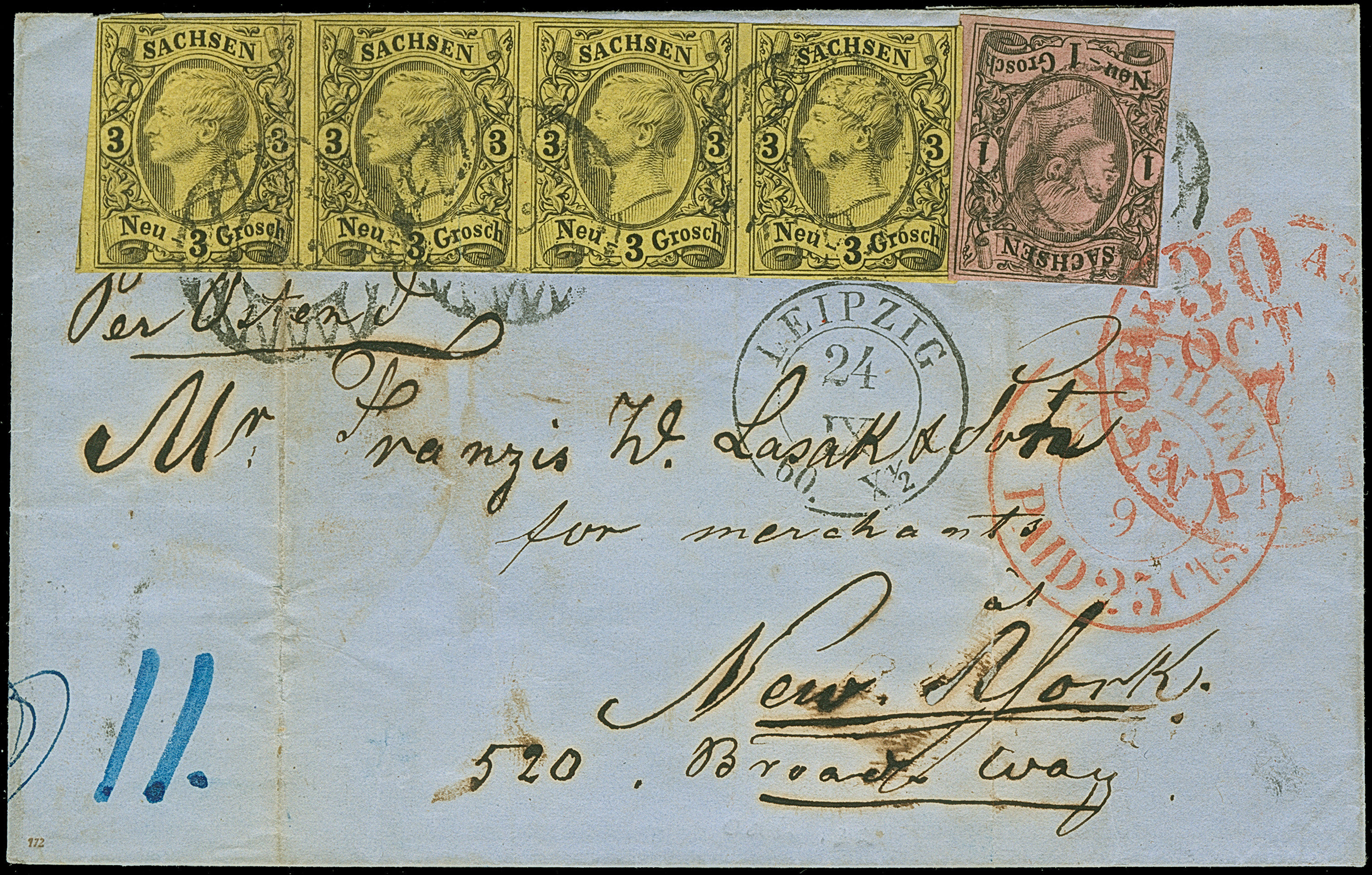 3 Ngr. auf gelb im teils leicht berührten 4er-Streifen, mit 1 Ngr. auf mattgraurot auf Briefhülle von "LEIPZIG 24 IX 60" über die 'Prussian closed mail' nach New York. 3 Werte unauffällige Büge. Eine in dieser Form einmalige 13 Neugroschen-Frankatur mit der zweitgrößten bekannten Streifeneinheit der 3 Ngr.