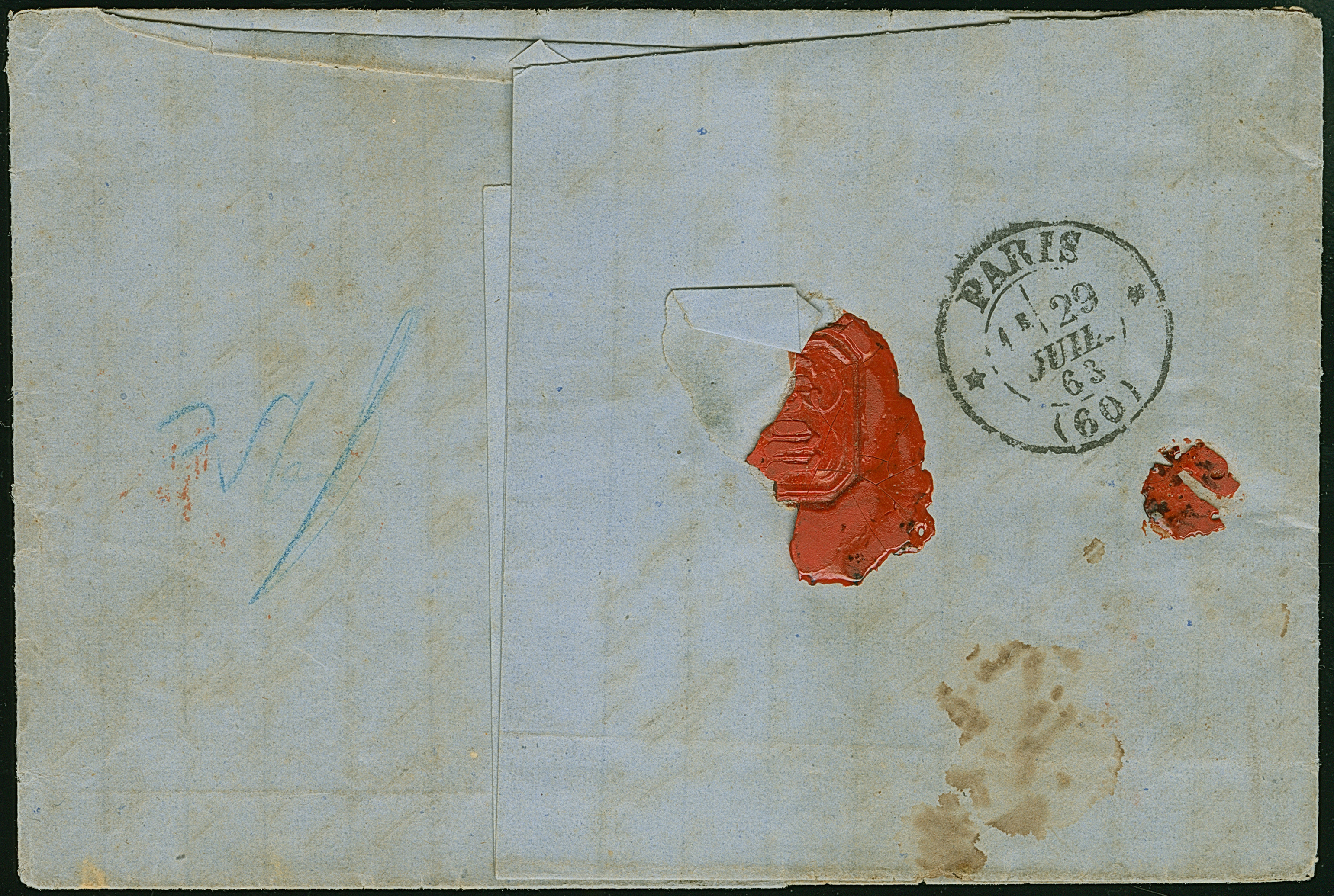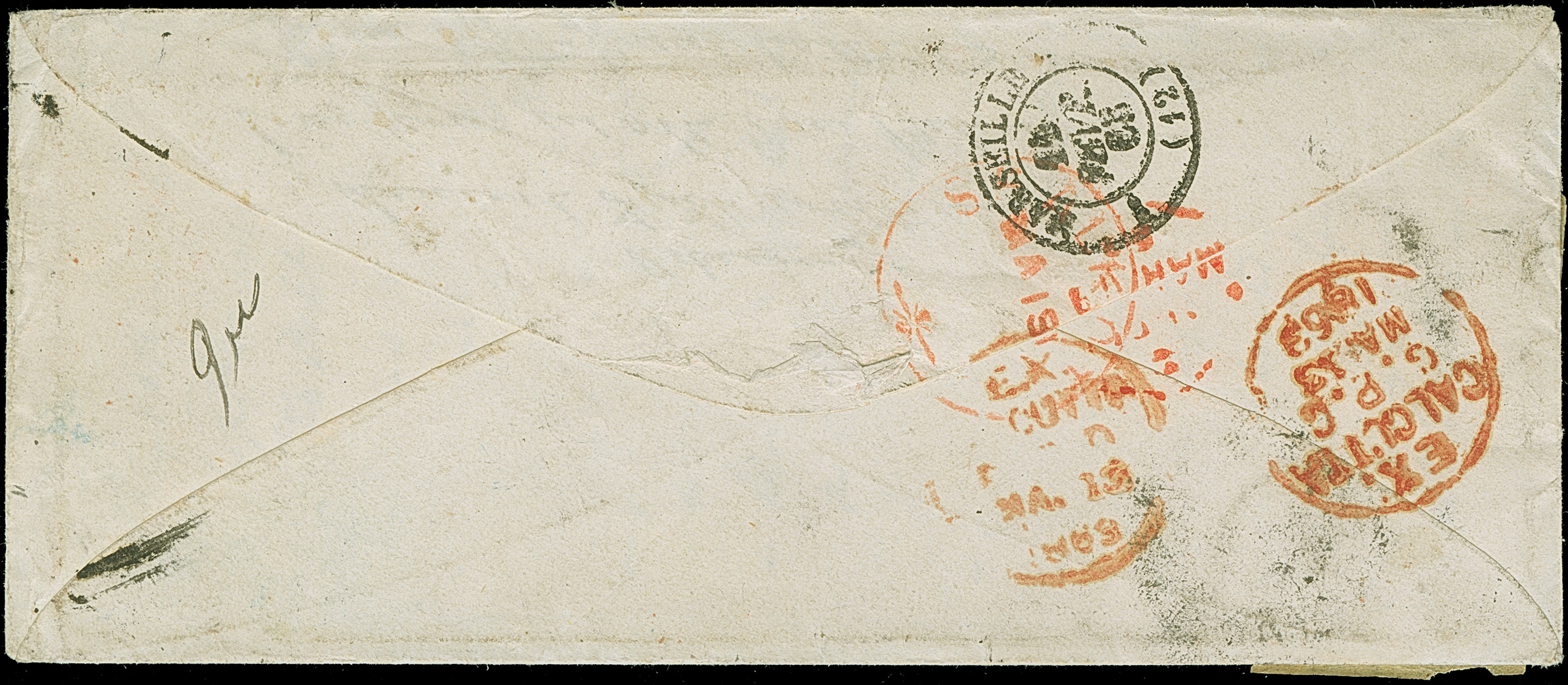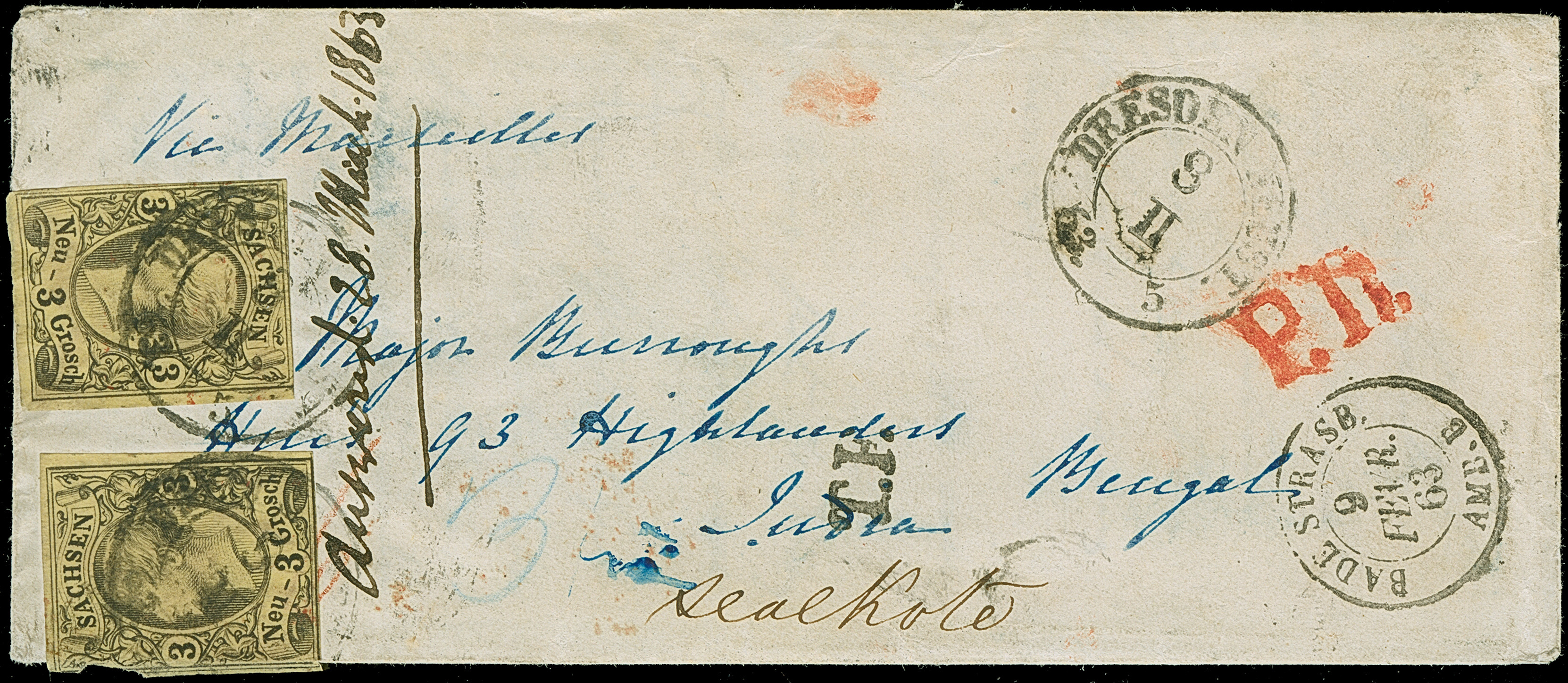 3 Ngr. auf gelb, 2 Einzelwerte, einer durch Randklebung etwas beschädigt, mit Doppelkreisstempel "DRESDEN NEUST. 8/II 63" auf kleinem Briefkuvert über Baden und Frankreich an die bekannte Adresse 'Major Burroughs' beim 93. Highlander-Regiment, Sialkot, Bengalen, Indien. Rückseitig Durchgangstempel von Marseille und Kalkutta; vorderseitiger Eingangsvermerk vom 28. März. Das verklebte Franco bezahlte die Vereinsgebühr sowie das französische Schiffsporto bis Alexandrien; versehentlich jedoch mit "P.D." gestempelt und in Indien offensichtlich nicht nachtaxiert. Ein sehr seltener Brief auf den Subkontinent; PROFI hat nur 2 weitere Briefe von Sachsen über Frankreich nach Indien registriert, davon nur diesen mit einem Teilfranko.