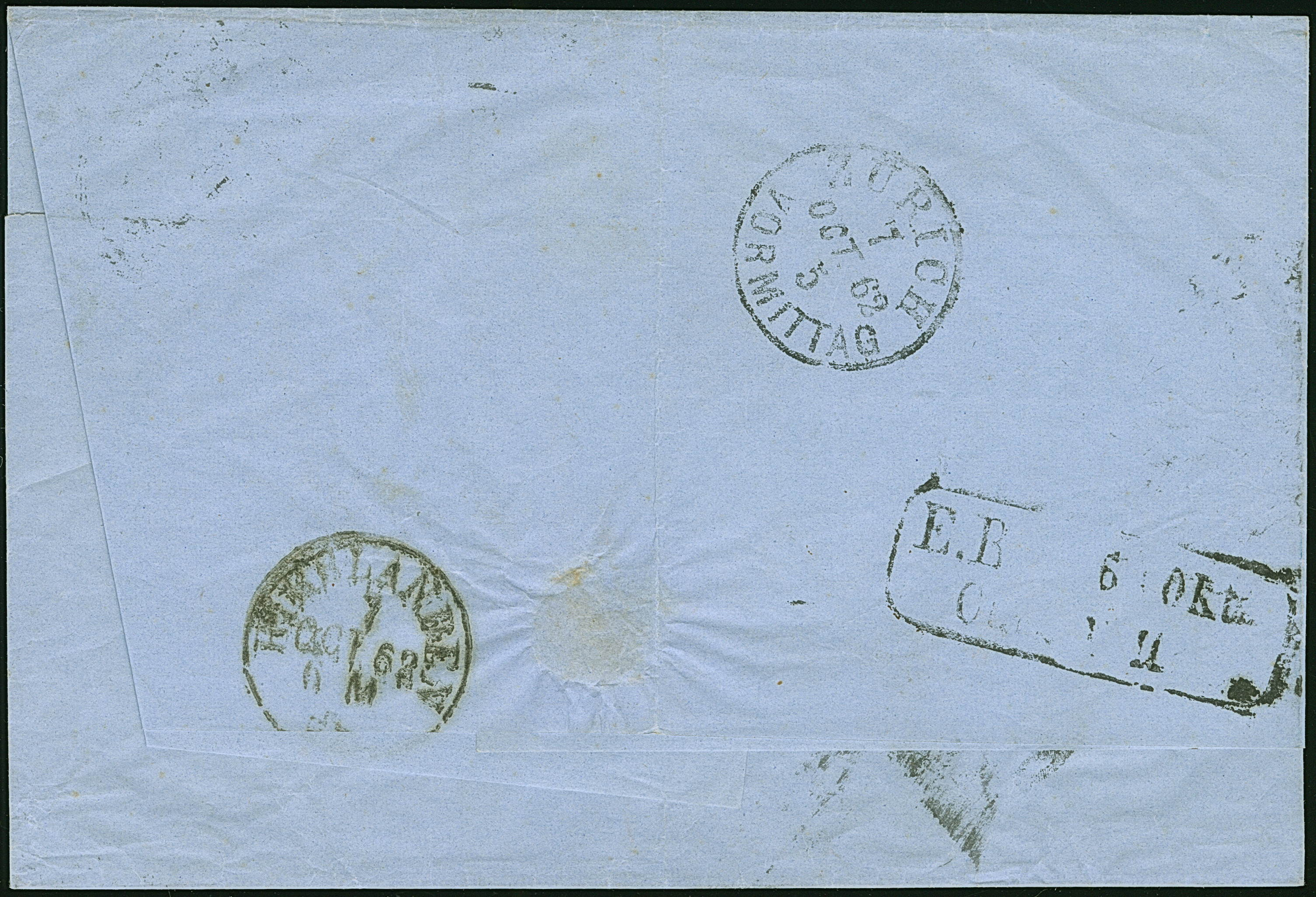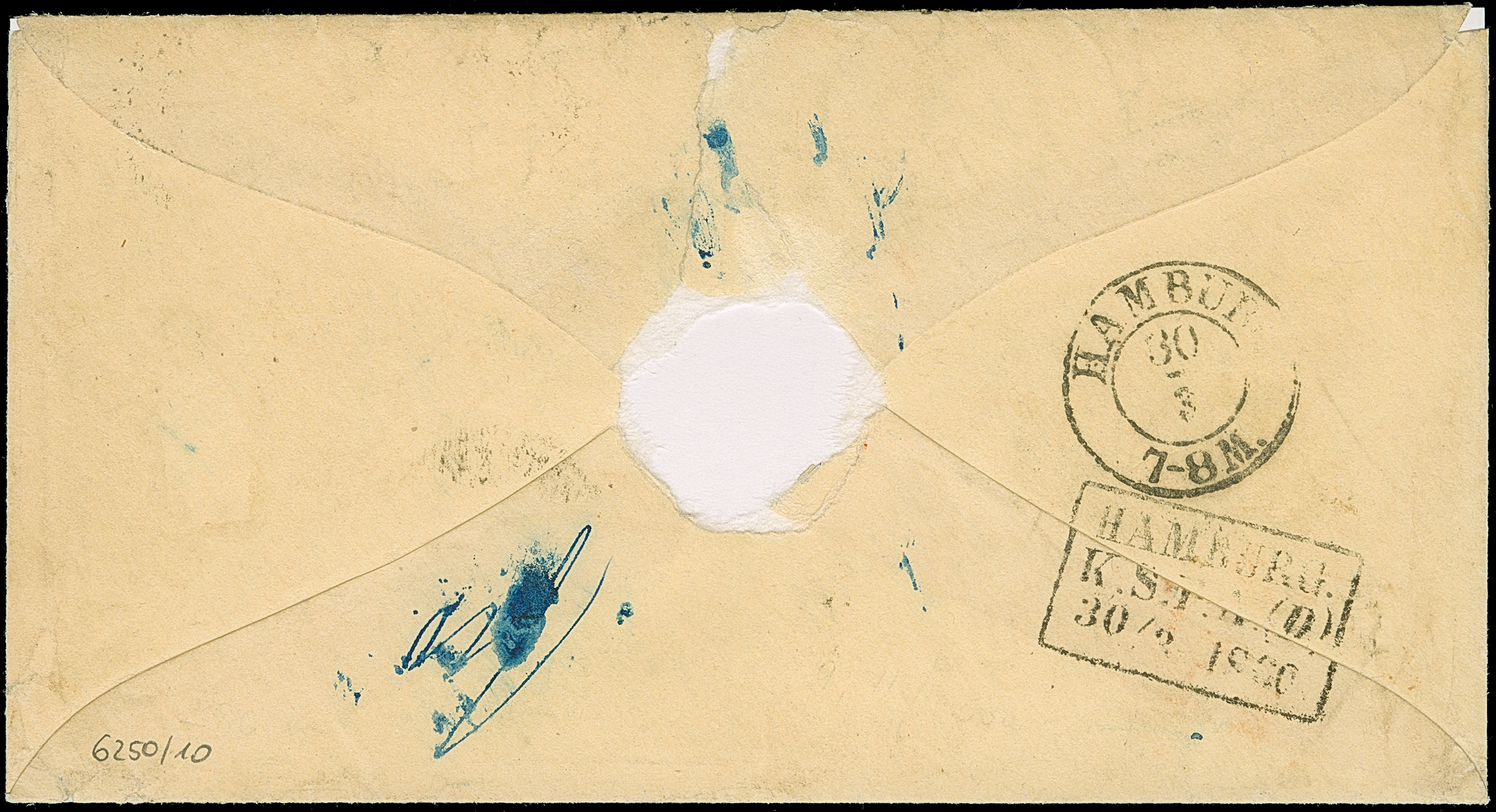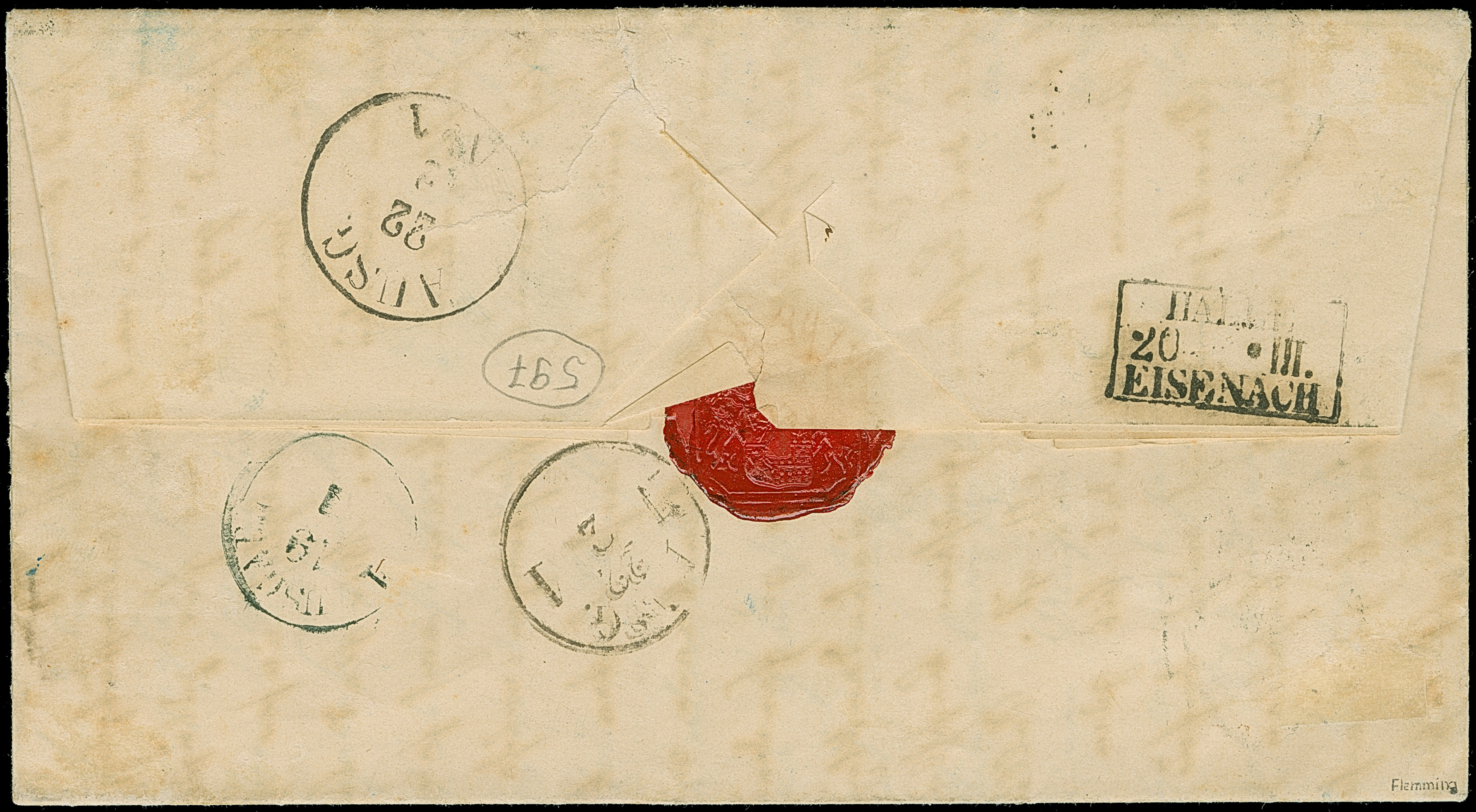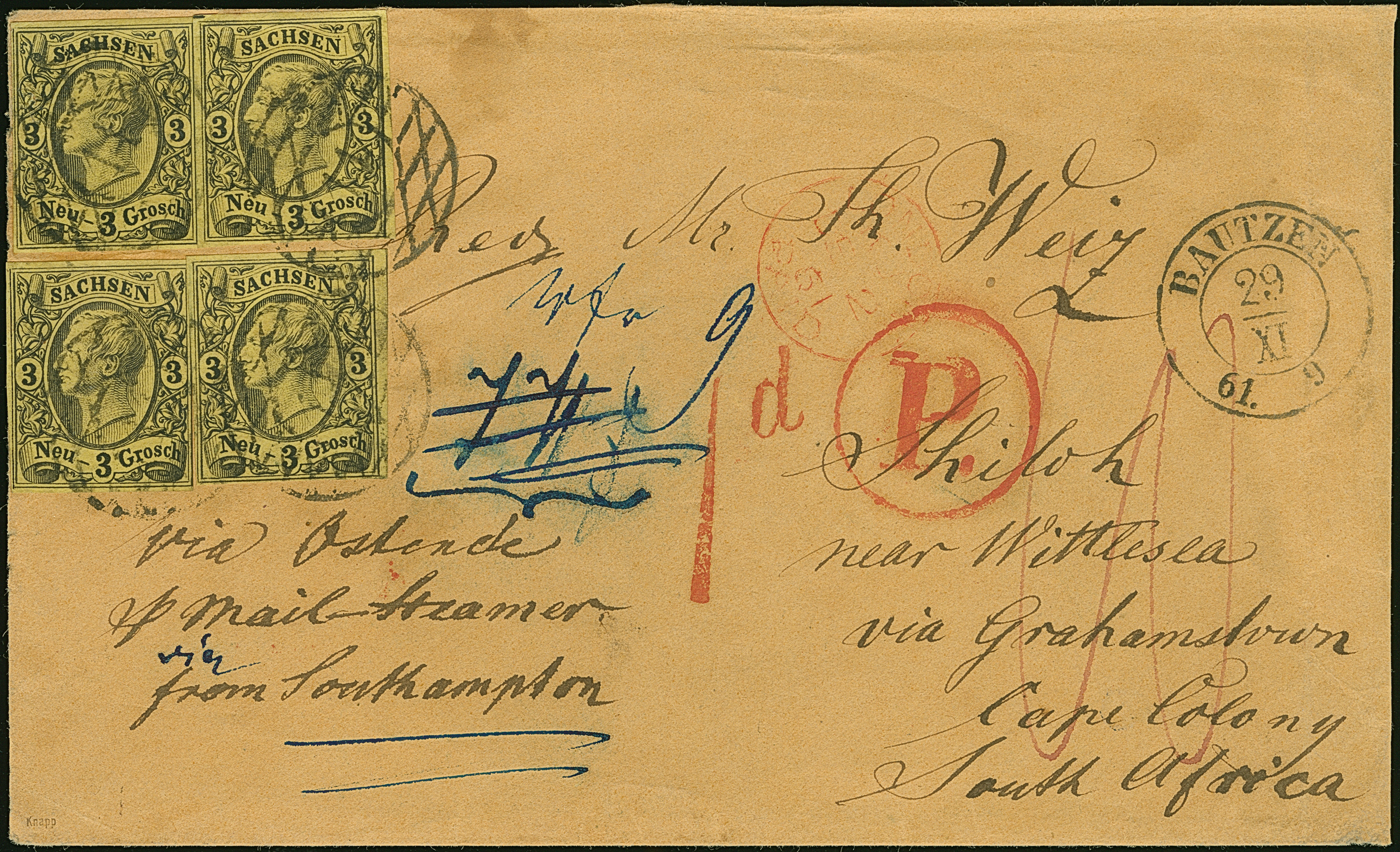 3 Ngr. auf gelb, 4 Einzelwerte, einer rechts leicht berührt, sonst alle voll- bis breitrandig und farbfrisch mit Nr. "14" und nebengesetztem Aufgabestempel "BAUTZEN 29/XI 61" auf 3-seitig geöffnetem Briefkuvert über Aachen, Ostende und London nach Shiloh bei Whittlesea am Kap der Guten Hoffnung, mit rotem Ankunftsstempel von Kapstadt vom 15. Januar 1862. Vorderseitig roter “1d.” für den ‘Colonial Penny’. Ein besonders schöner und außerordentlich seltener Brief nach Südafrika. Provenienz: Walter Opitz (1967) Horst und Arnim Knapp (344. Heinrich Köhler-Auktion, 2011)