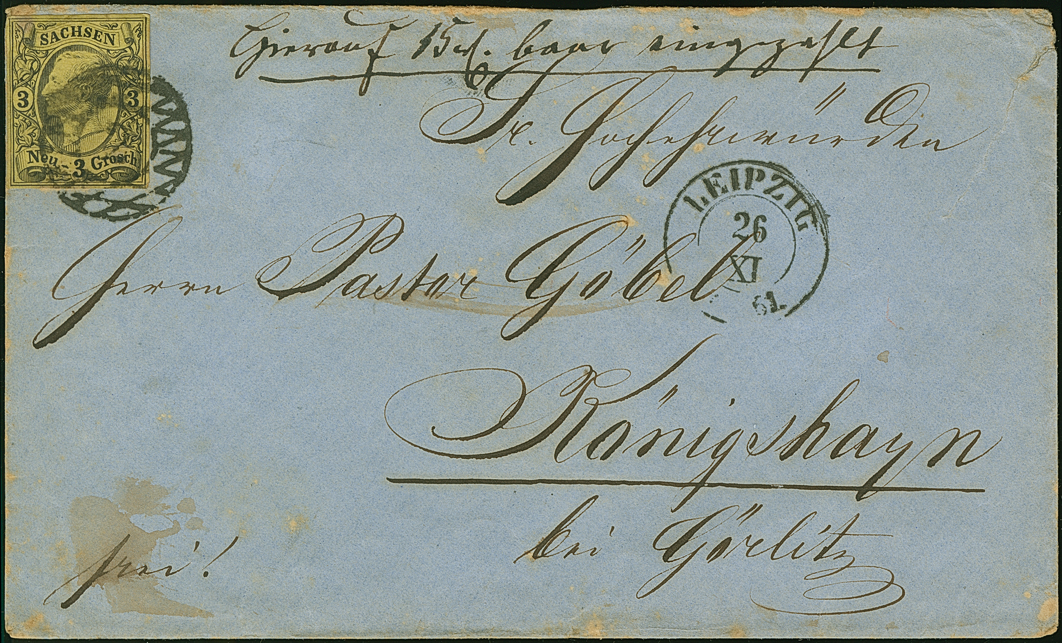 3 Ngr. auf dunkelgelb , voll-bis breitrandig, mit Nr. "2" und sauber nebengesetztem Doppelkreisstempel "LEIPZIG 26 XI 61" auf Umschlag mit handschriftlichem Vermerk "hierauf 15 Ngr. bar eingezahlt", nach Königshain bei Görlitz. Die Frankatur setzt sich (wohl entsprechend der preußischen Gebühr nach dem ab 1.1.1861 gültigen Tarif) zusammen aus 2 Ngr. Inlandsporto und 1 Ngr. Mindestgebühr für die Bareinzahlung. Etwas unfrisch. Eine bei Sachsen äußerst seltene Portospezialität.
