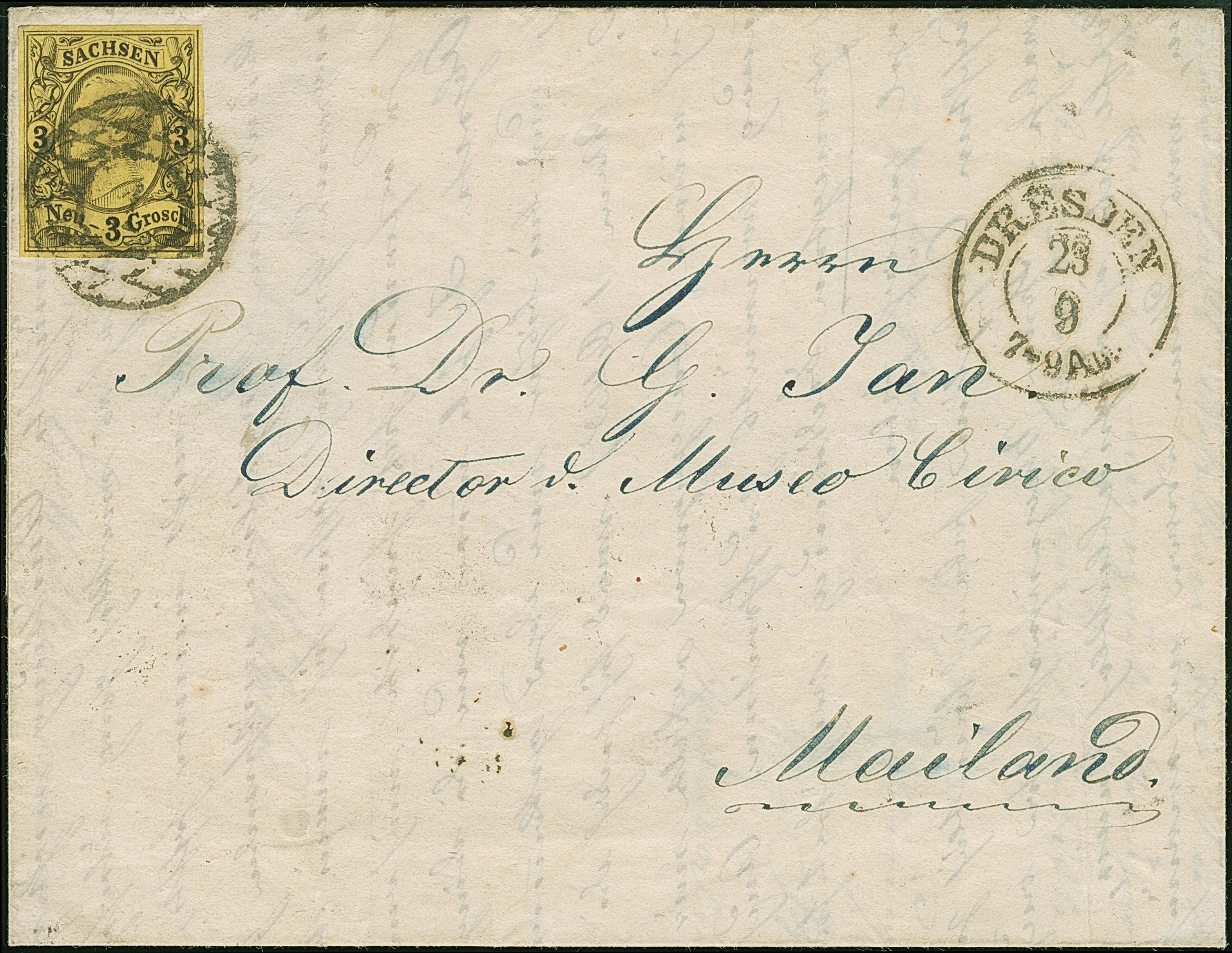3 Ngr. auf gelb, voll- bis breitrandig, mit Nr. "2" und sauber nebengesetztem Doppelkreisstempel "DRESDEN 23 9" (1856) auf komplettem Faltbrief nach Mailand (bis 1860 im Postverein).
