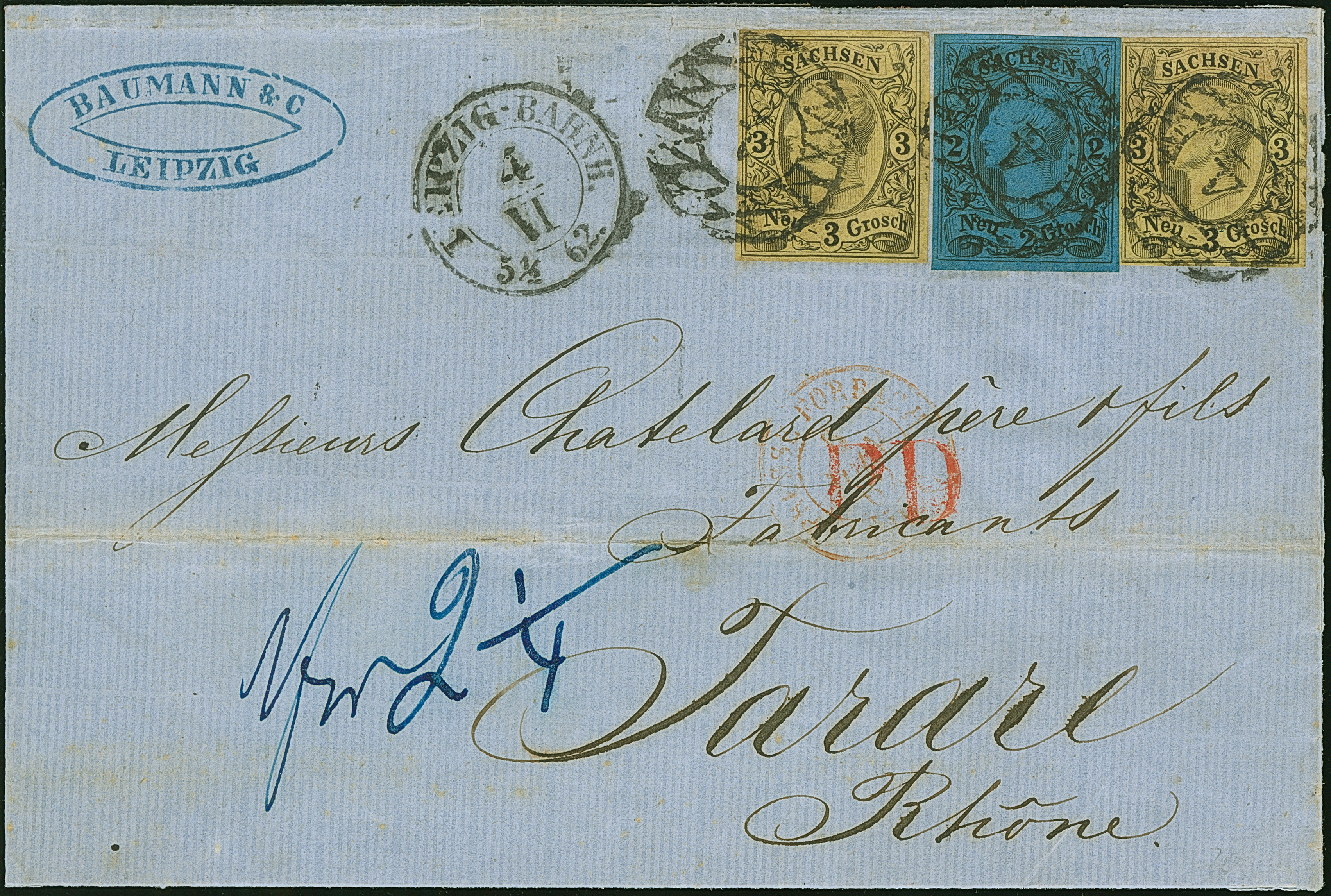 3 Ngr. auf gelb, 2 Einzelwerte, abwechselnd geklebt mit 2 Ngr. auf blau, alle voll- bis breitrandig, mit Nr. "4" und sauber nebengesetztem Doppelkreisstempel "LEIPZIG BAHNH. 4/VI 62" auf Briefhülle ohne Leitvermerk und Gewichtsangabe nach Tarare, Frankreich. Der Brief war für den Leitweg über Preußen korrekt frankiert für die 1. deutsche und 2. französischen Gewichtsstufe; das notierte Weiterfranko "2 ¼" unverständlich. Eine waagerechte Brieffalte außerhalb der Frankatur, etwas gestützt, sonst gute Erhaltung. Ein interessanter und attraktiver Brief.