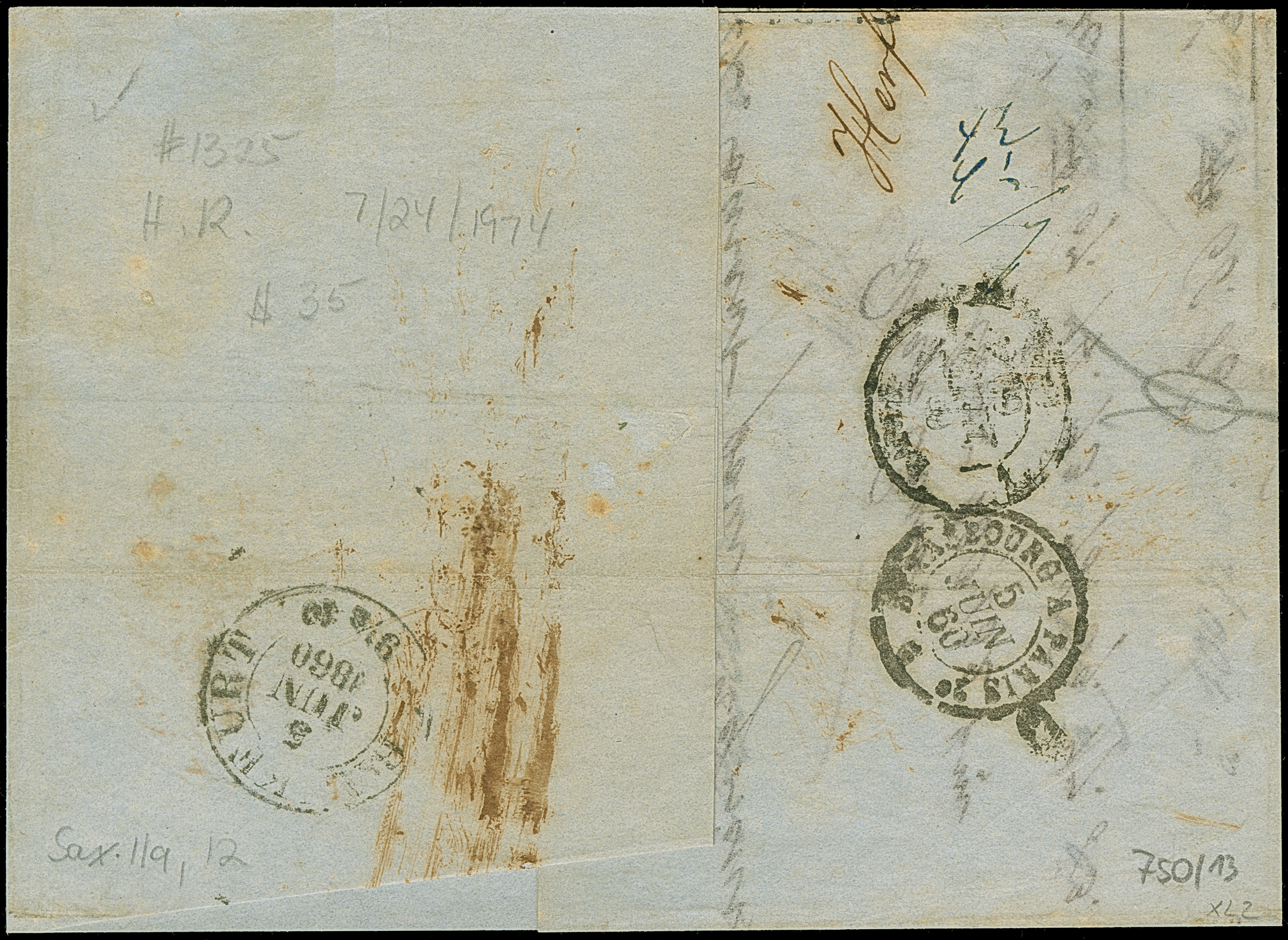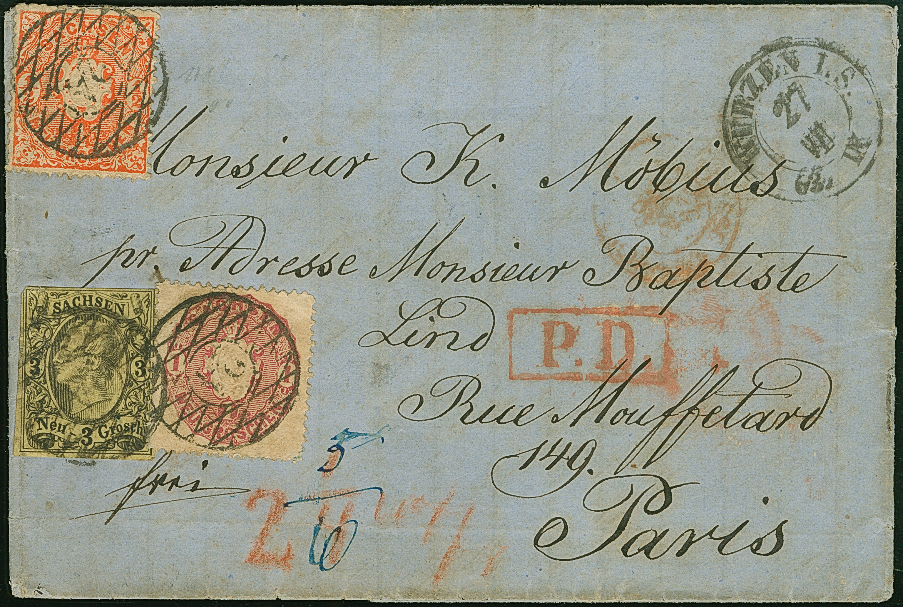 3 Ngr. auf gelb, 2 Einzelwerte, mit 2 Ngr. auf blau, teils leicht berührt, mit Nr. "4" und nebengesetztem Doppelkreisstempel "LEIPZIG BAHNH. 4/VI 60" auf Briefhülle nach Paris. Der Brief war für die 1. deutsche und 2. französischen Gewichtsstufe korrekt frankiert, fiel jedoch in die 2. Deutsche Gewichtsstufe (Vermerk links oben) und wurde damit in Frankreich als unfrankiert mit "24" decimen (ca. 19½ Ngr.) nachtaxiert.