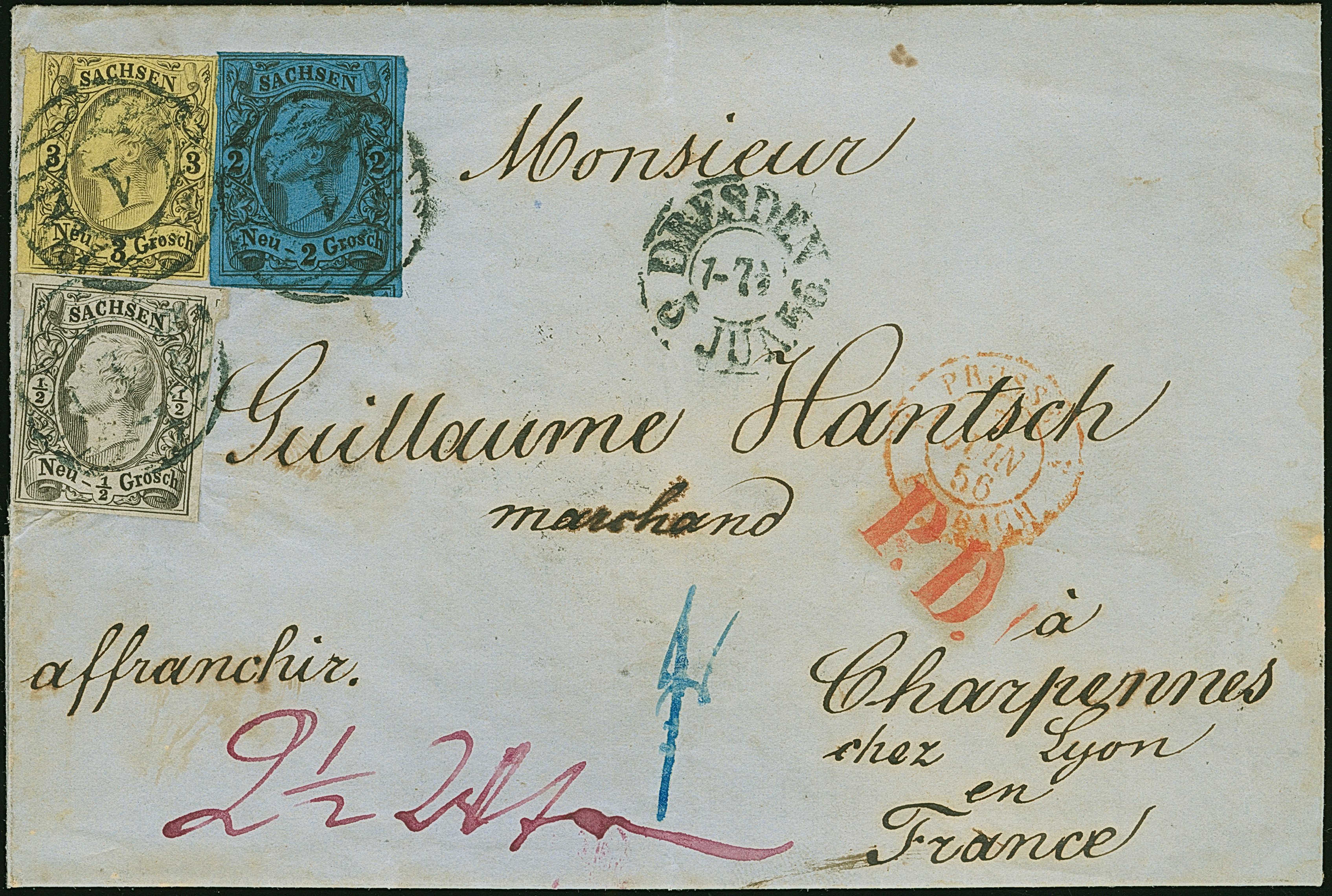 3 Ngr. auf gelb, 2 Ngr. auf blau und ½ Ngr. auf grau, letztere voll- bis breitrandig, die anderen einseitig berührt, mit Nr. "1" und sauber nebengesetztem Doppelkreisstempel "DRESDEN 5 JUN 56" auf komplettem Faltbrief über Preußen nach Carpennes bei Lyon, Frankreich, portogerecht frankiert mit 3 Ngr. Vereinsporto und 2½ Ngr. Weiterfranko. Ein attraktiver und früher Auslandsbrief.
