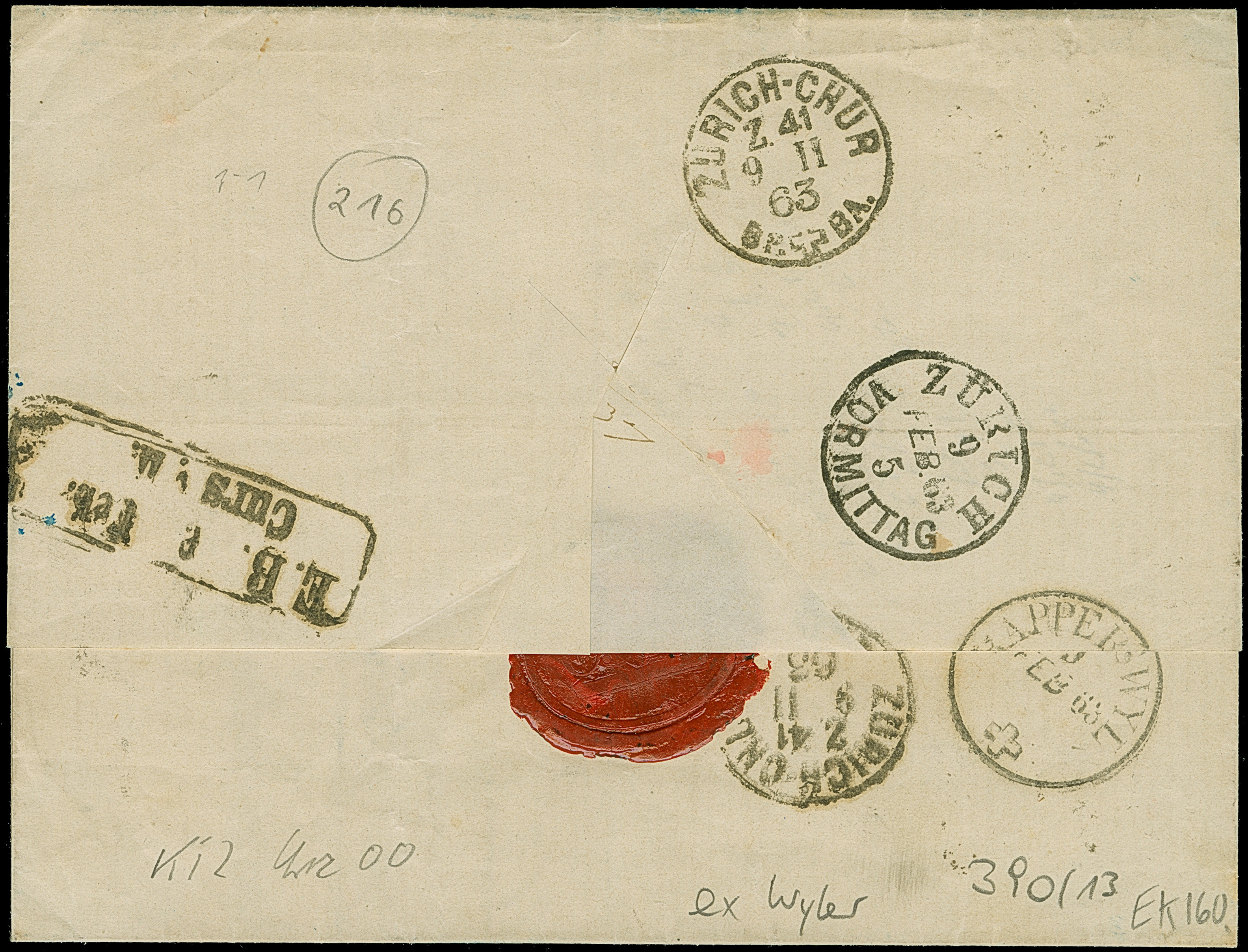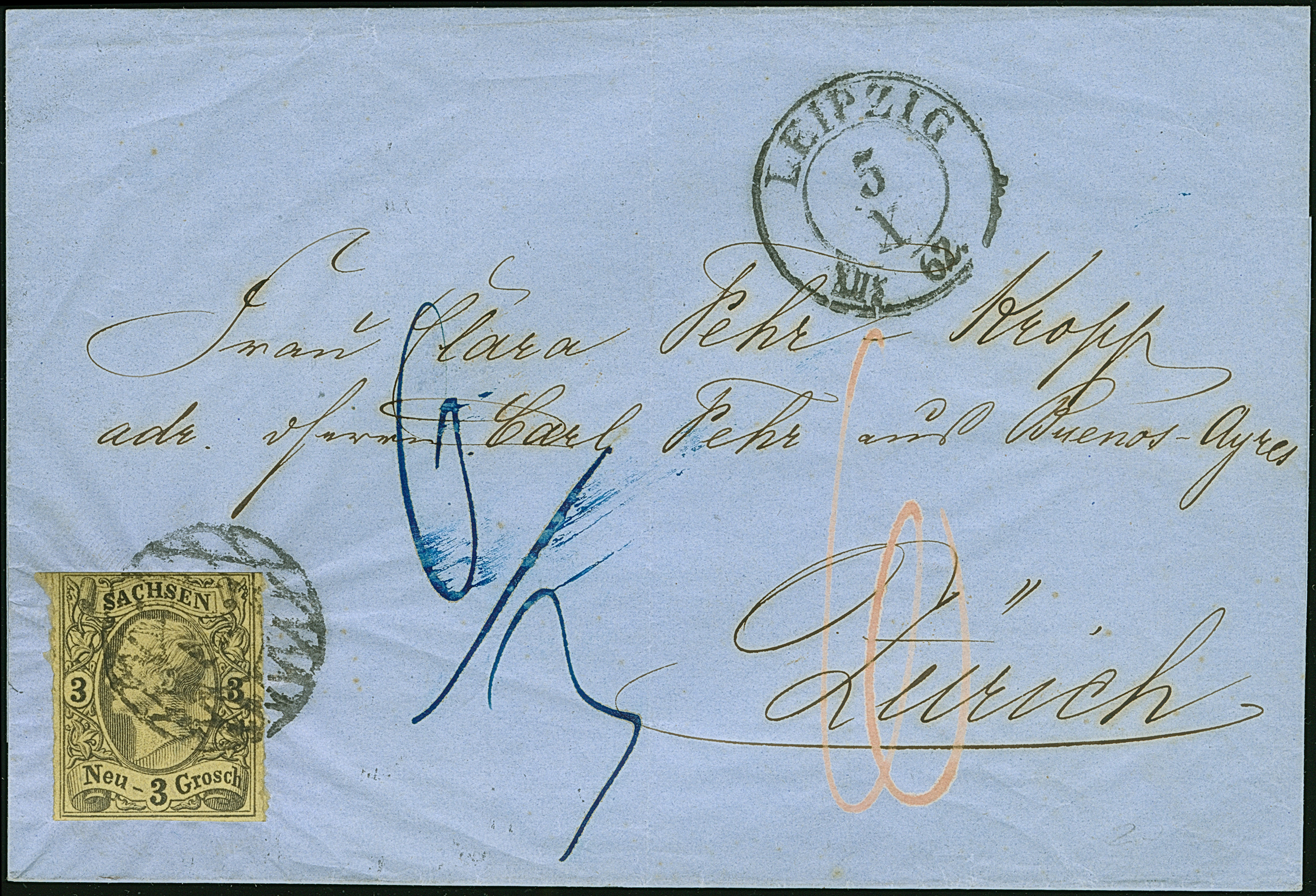 3 Ngr. auf gelb, oben berührt, sonst voll- bis breitrandig, mit Nr. "2" und sauber nebengesetztem Doppelkreisstempel "LEIPZIG 5 X 62" als gestattetes Teilfranko auf Briefhülle nach Zürich im 2.Schweizer Rayon, entsprechend für die schweizer Strecke nachbelastet mit "10" Rappen. Eine mit der Johann-Ausgabe seltene Teil-Frankatur.