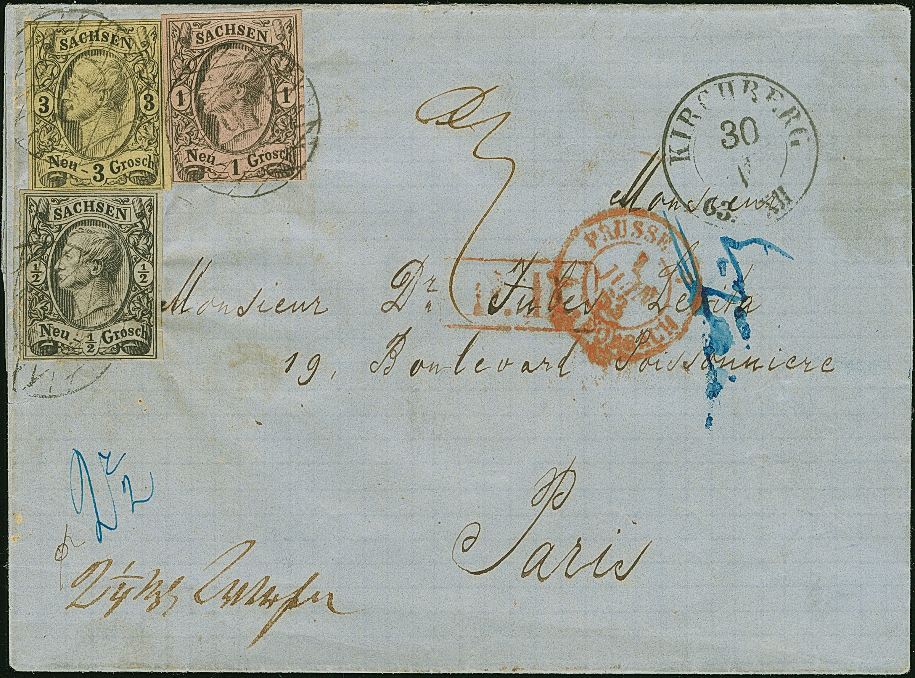 3 Ngr. auf gelb, 1 Ngr. auf mattgraurot und ½ Ngr. auf grau, die 1 Ngr. einseitig berührt , sonst alle voll- bis breitrandig, , mit Nr. "91" und sauber nebengesetztem Doppelkreisstempel "KIRCHBERG 30 V 63" auf Briefhülle über Preußen nach Paris, nach der Portoreduzierung vom Juli 1858 portogerecht frankiert mit 2 Ngr. Vereinsporto und 2½ Ngr. Weiterfranko.