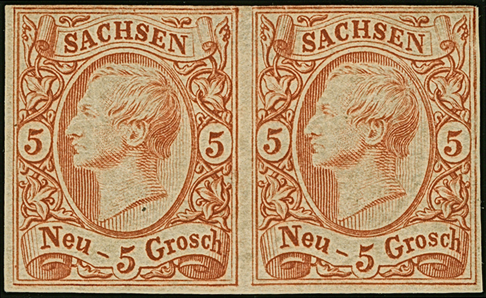 5 Ngr. ziegelrot, in der typischen Farbe der Frühauflage, waagerechtes Paar, farbfrisch und voll- bis breitrandig, ungebraucht mit Originalgummi, der rechte Wert größere gummifreie Stelle. Eine seltene Einheit. Signiert Pröschold BPP