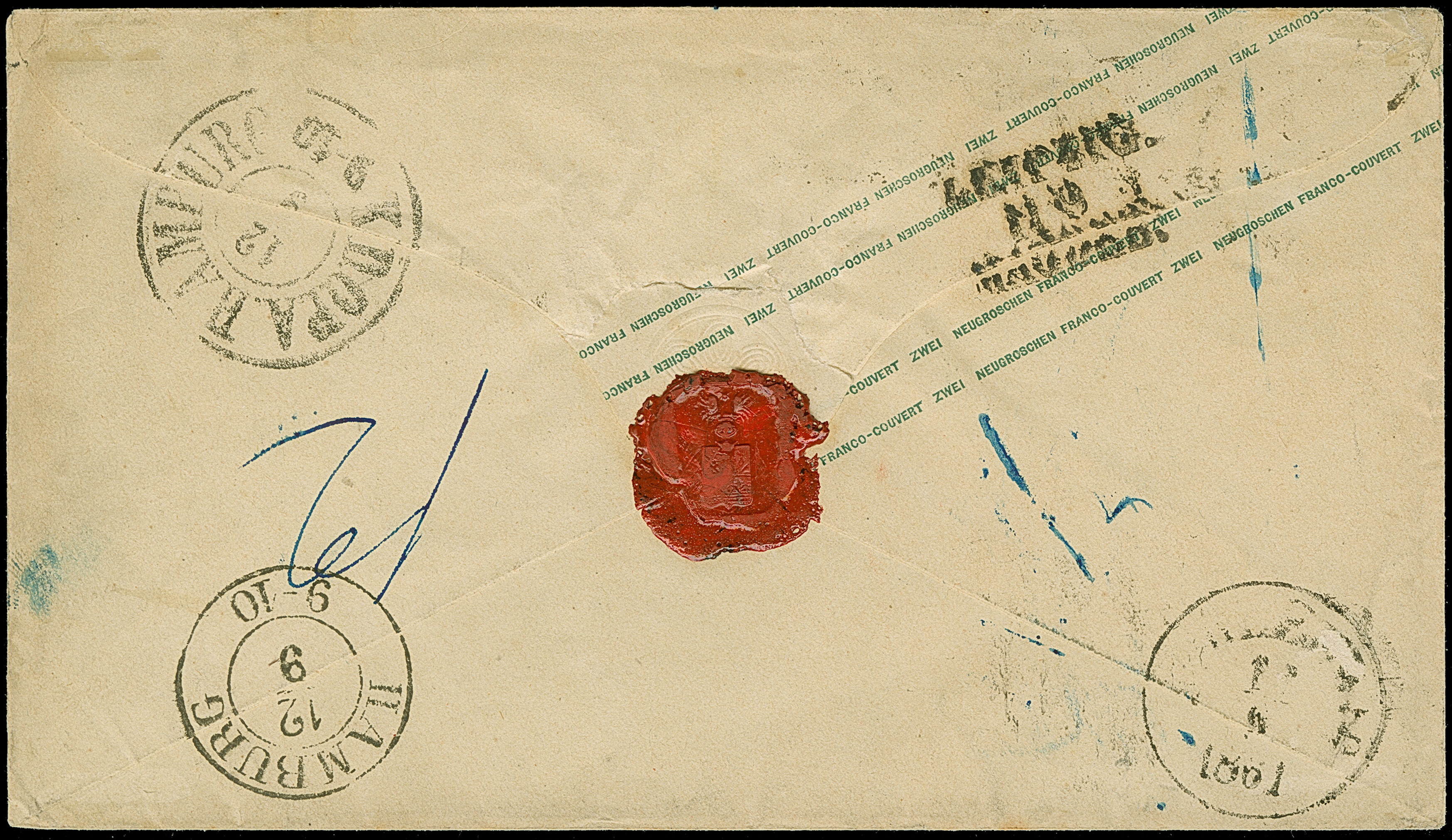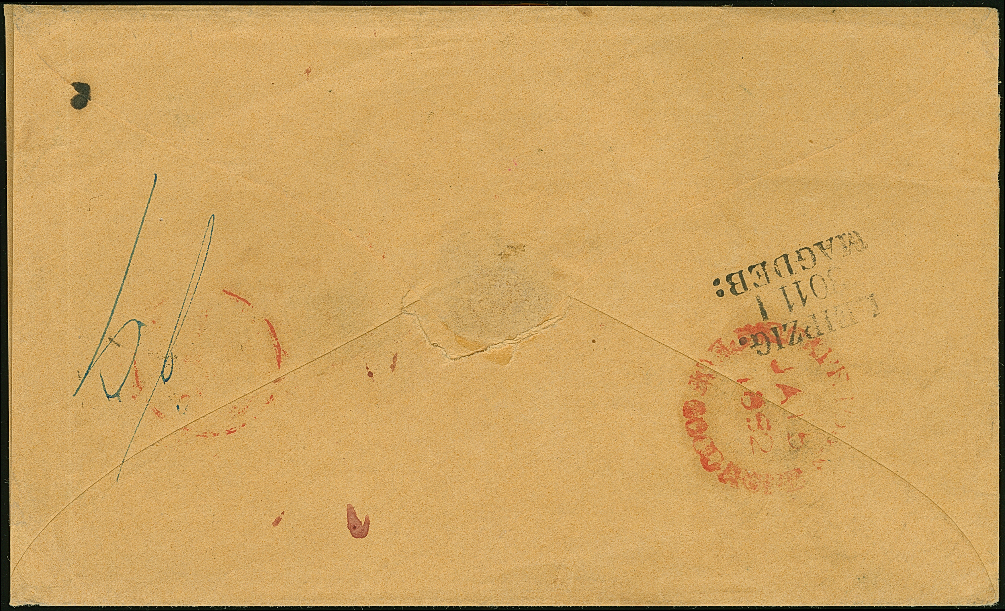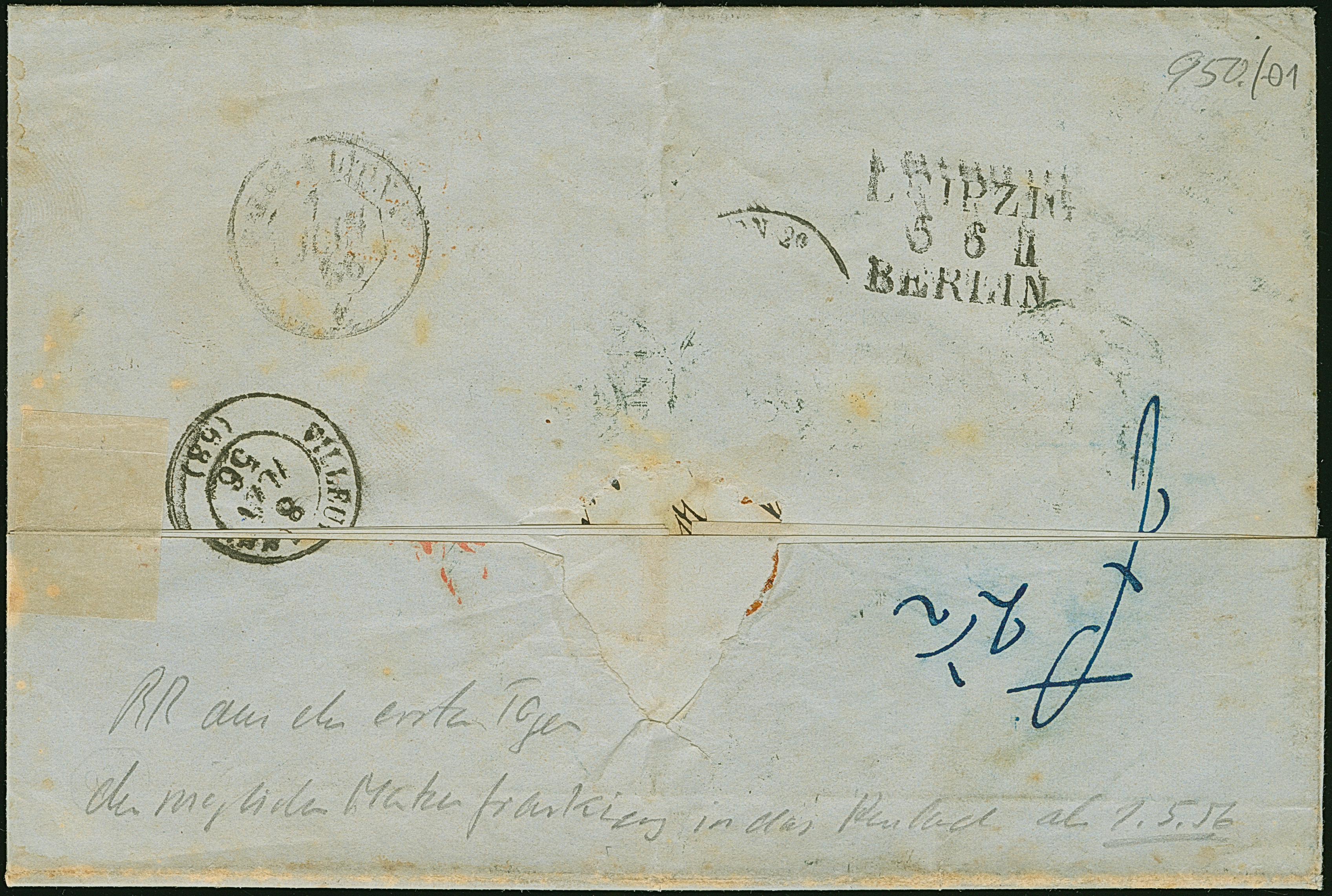 3 Ngr. auf gelb im waagerechten Paar und 2 Einzelwerte ½ Ngr. auf grau, meist voll- bis breitrandig, mit Nr. 2 und sauber nebengesetztem Doppelkreisstempel Leipzig 26/X 58 auf Briefhülle mit großem Teil des Inhaltes, über Frankreich nach Barcelona, Spanien. Das Porto bis zur französisch-spanischen Grenze betrug 3 Ngr. Vereinsporto und 3½ Ngr. französisches Porto (hier ½ Ngr. zu viel frankiert); das spanische Inlandsporto von 12 Reales wurde vom Empfänger eingezogen. Ein außerordentlich seltenes Stück; es ist nur noch ein weiterer Brief mit Johann-Frankatur registriert, bei dem das Porto bis zur spanischen Grenze voll bezahlt war (Frankaturzwang bestand nur für die Postvereinsgebühr).