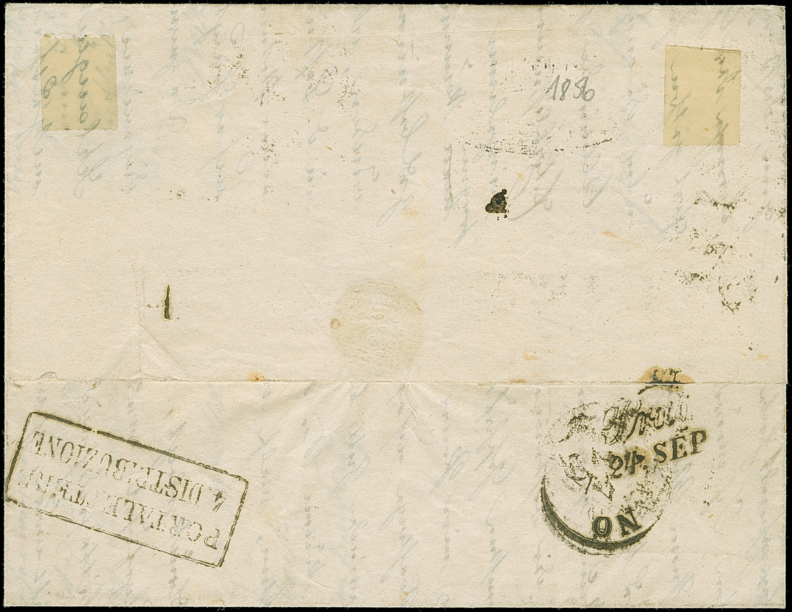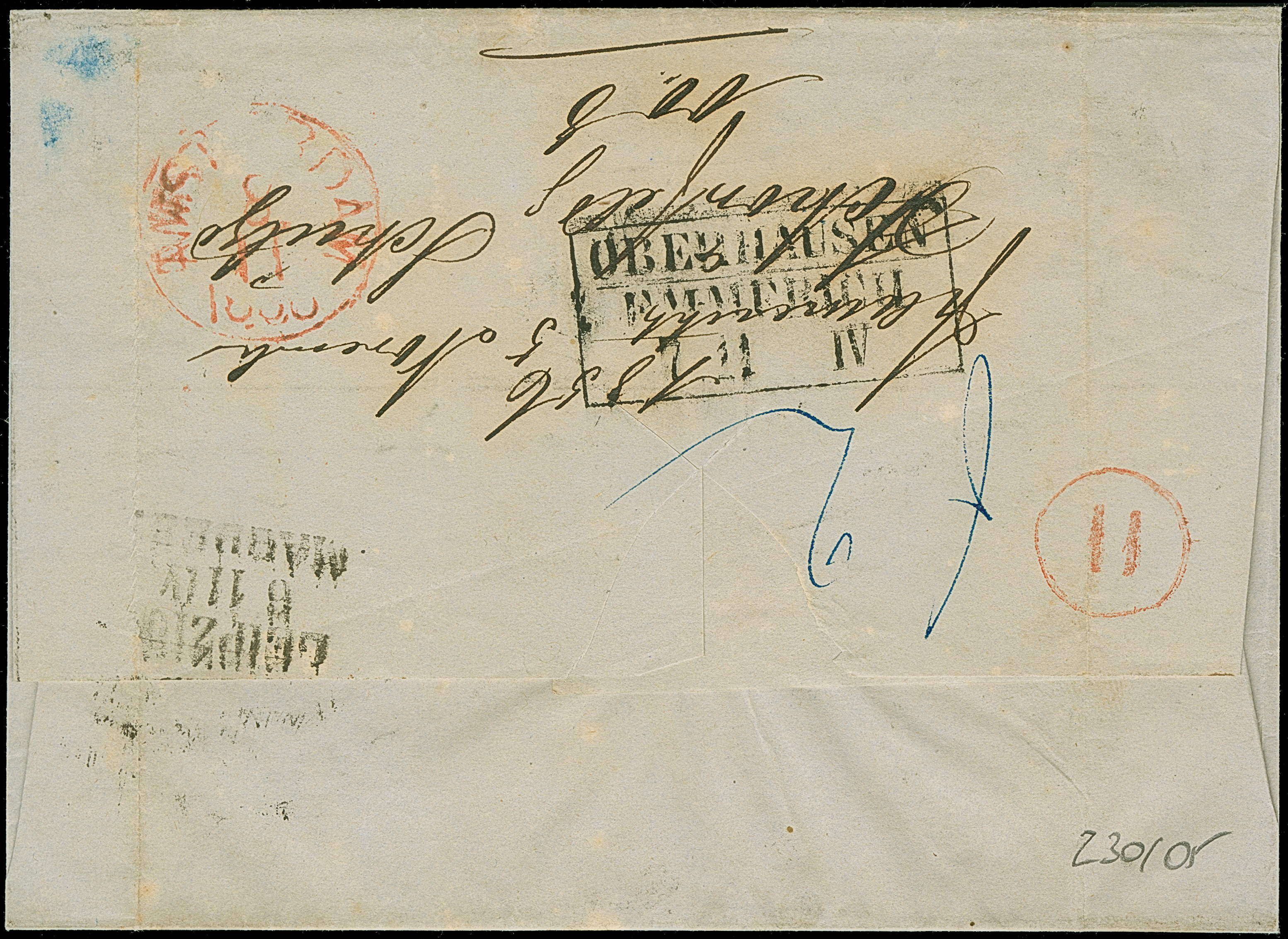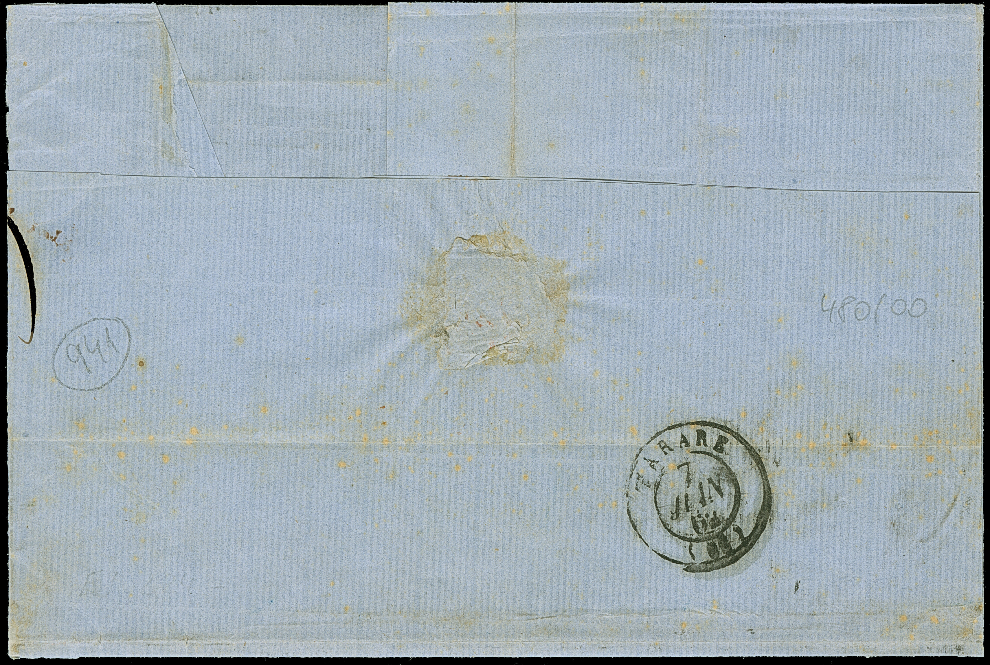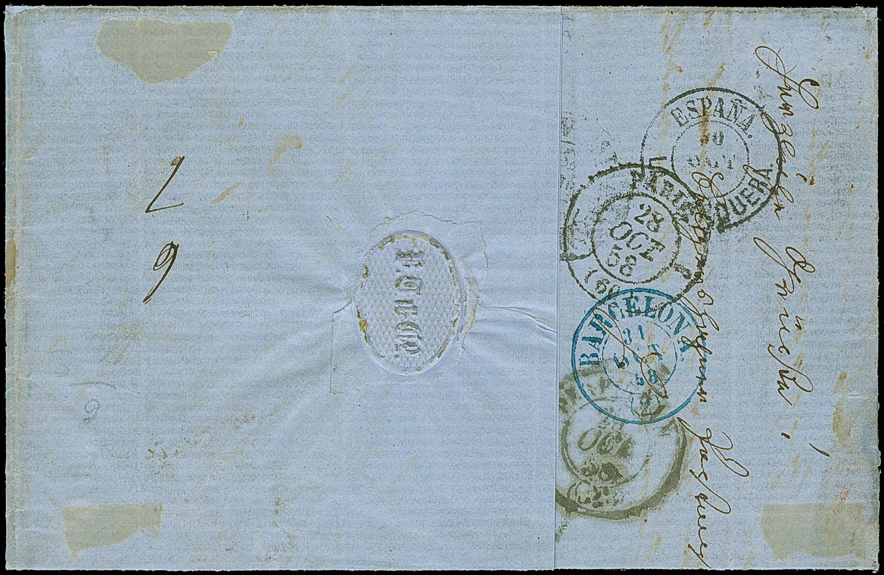 3 Ngr. auf gelb im waagerechten Paar und 2 Einzelwerte ½ Ngr. auf grau, meist voll- bis breitrandig, mit Nr. 2 und sauber nebengesetztem Doppelkreisstempel Leipzig 26/X 58 auf Briefhülle mit großem Teil des Inhaltes, über Frankreich nach Barcelona, Spanien. Das Porto bis zur französisch-spanischen Grenze betrug 3 Ngr. Vereinsporto und 3½ Ngr. französisches Porto (hier ½ Ngr. zu viel frankiert); das spanische Inlandsporto von 12 Reales wurde vom Empfänger eingezogen. Ein außerordentlich seltenes Stück; es ist nur noch ein weiterer Brief mit Johann-Frankatur registriert, bei dem das Porto bis zur spanischen Grenze voll bezahlt war (Frankaturzwang bestand nur für die Postvereinsgebühr).