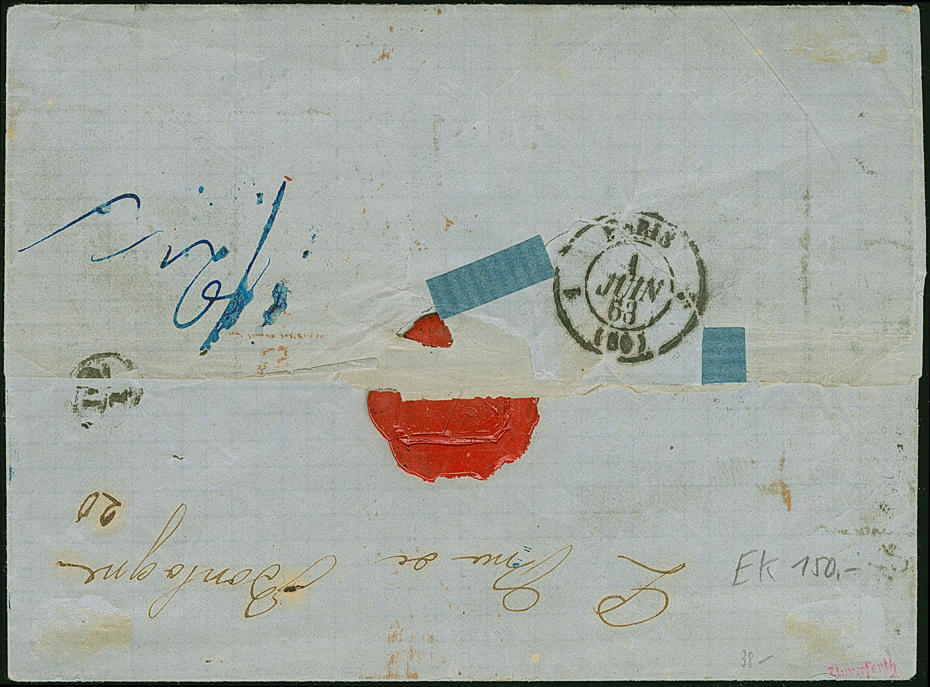 3 Ngr. auf gelb, in Mischfrankatur mit Wappen ½ Ngr. rotorange und 1 Ngr. rosakarmin, mit Nr. "24" und nebengesetztem Doppelkreisstempel "WURZELN 27 VII 63" auf Briefhülle nach Paris. Frankatur kleine Mängel. PROFI hat nur 2 weitere Mischfrankaturen Johann/Wappen nach Frankreich registriert.